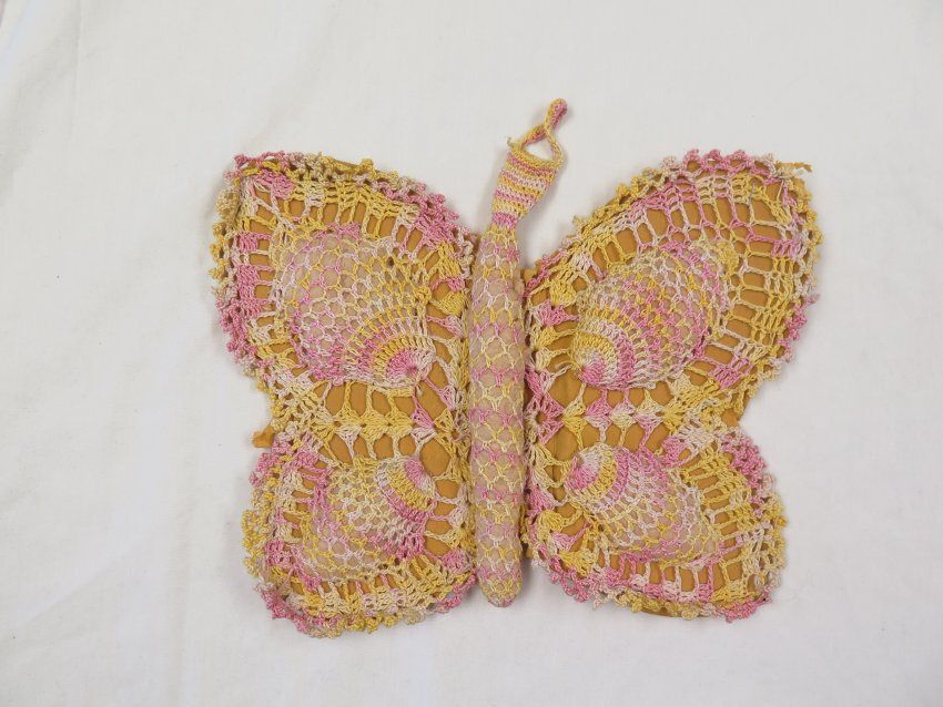 This is a crocheted butterfly on a board that was used as a pincushion. The pincushion is made of pink and yellow yarn. The board is cracked in the back. Pincushion measures 9" (w) x 11" (l).