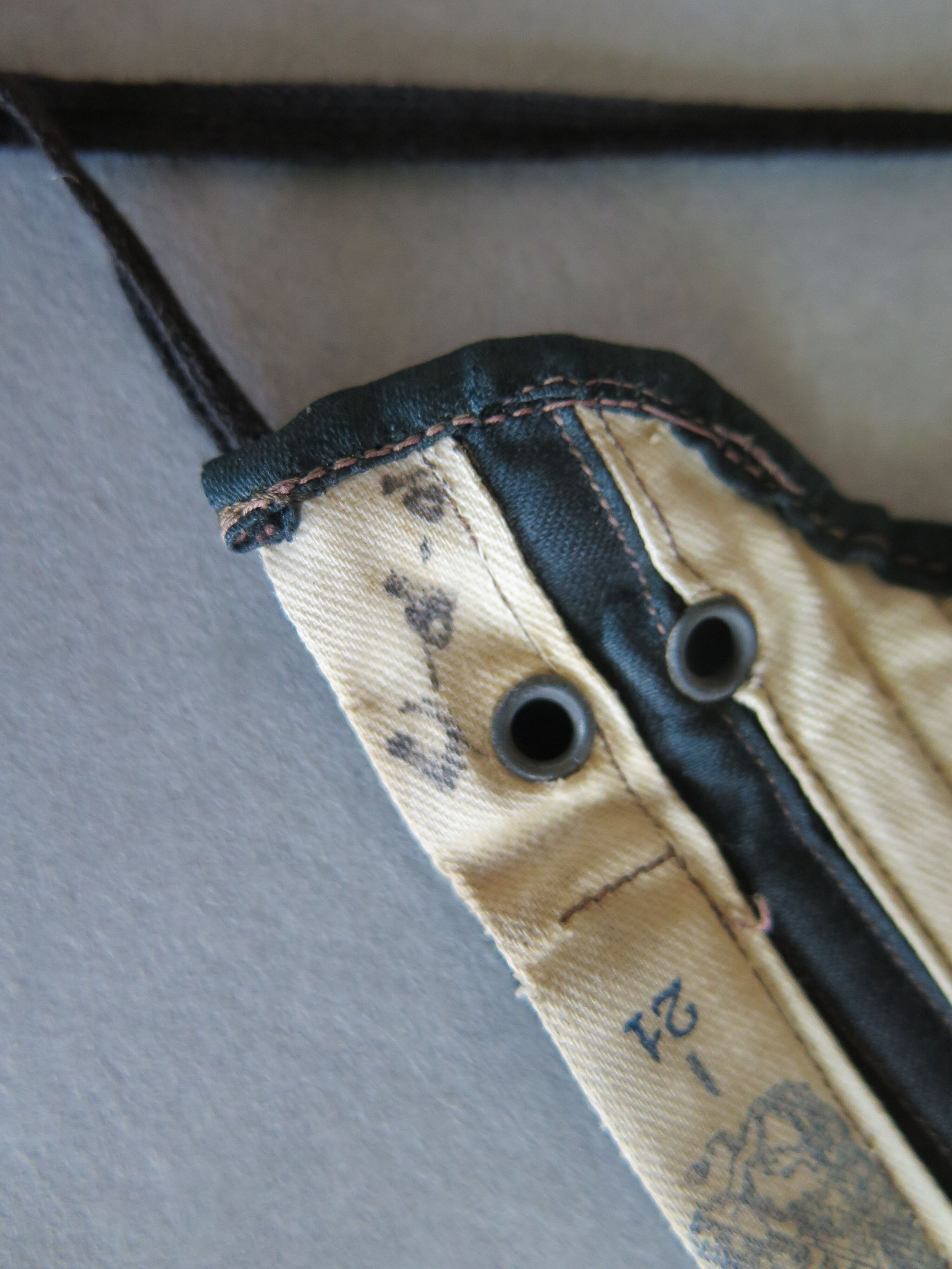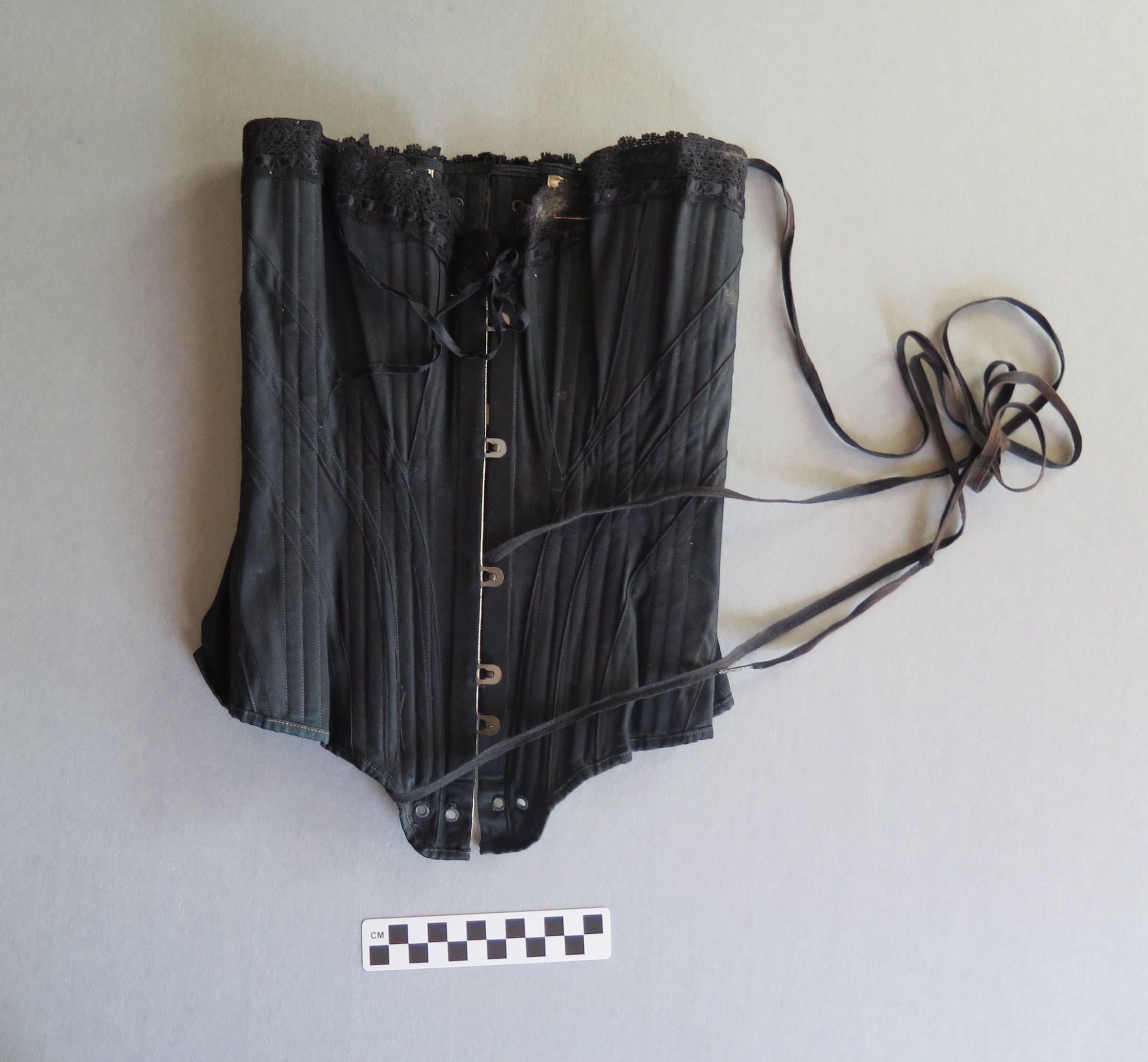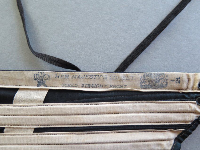 Black corset with a black lace trim at the top. There are hooks going up the front of the corset and strings in the back to tighten it. There is text printed on the inside that reads "Her Majesty's Corset. Gored, Straight Front. 21." Likely from the late 1800s. Corset measures 12" (w) x 21" (l).
