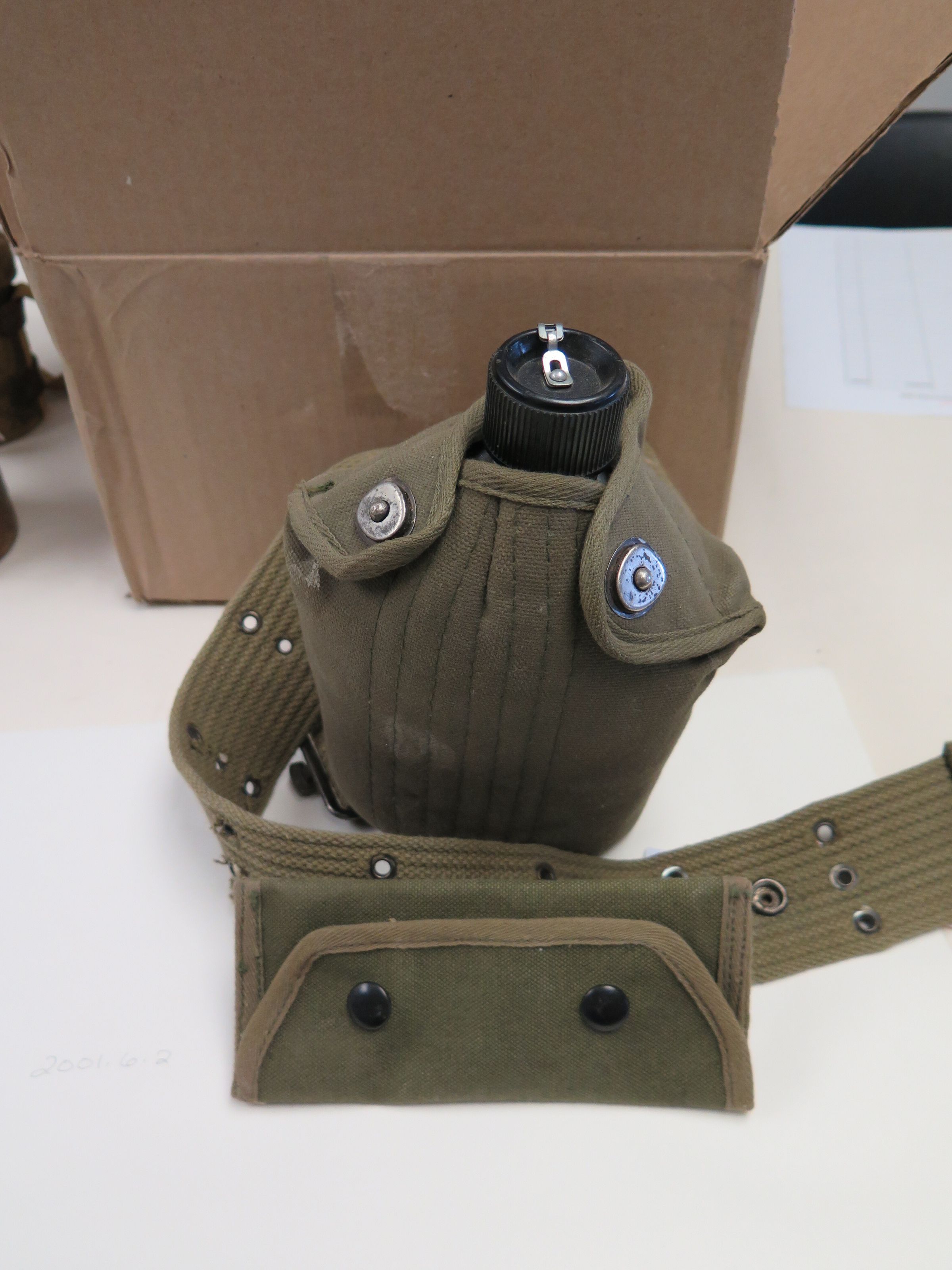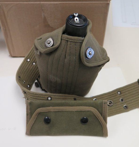 This is a military issue metal canteen in an olive green canvas case with a belt attached. The canteen has a black plastic lid that is attached with a metal chain. The case measures 8" (h) x 5" (w).