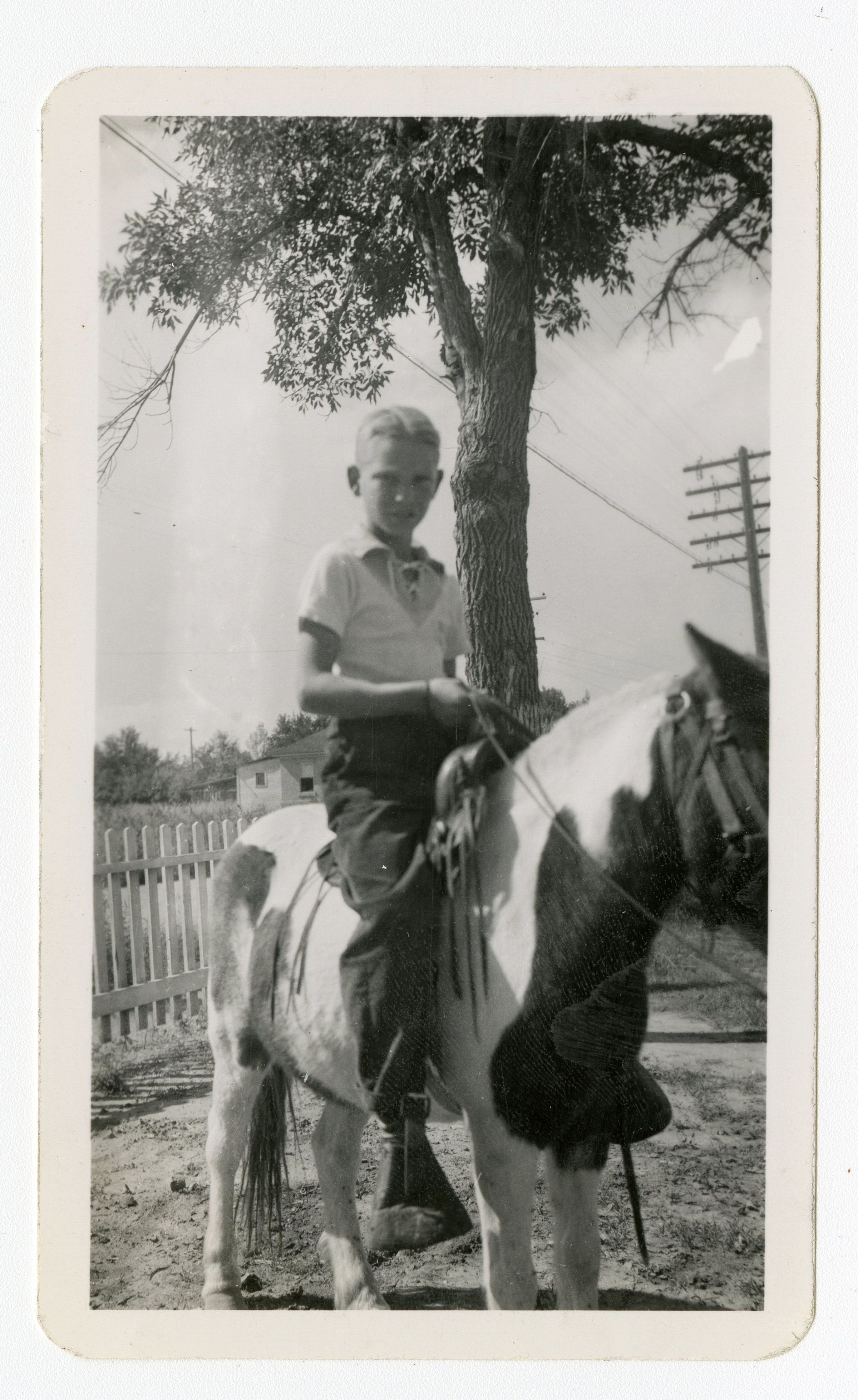 Black and white photograph of a boy on a pony. Photograph was taken outside, near a fence. There is a fence in the background. The boy is wearing dark pants and a light colored shirt. The boy is identified as Gib Brunner.