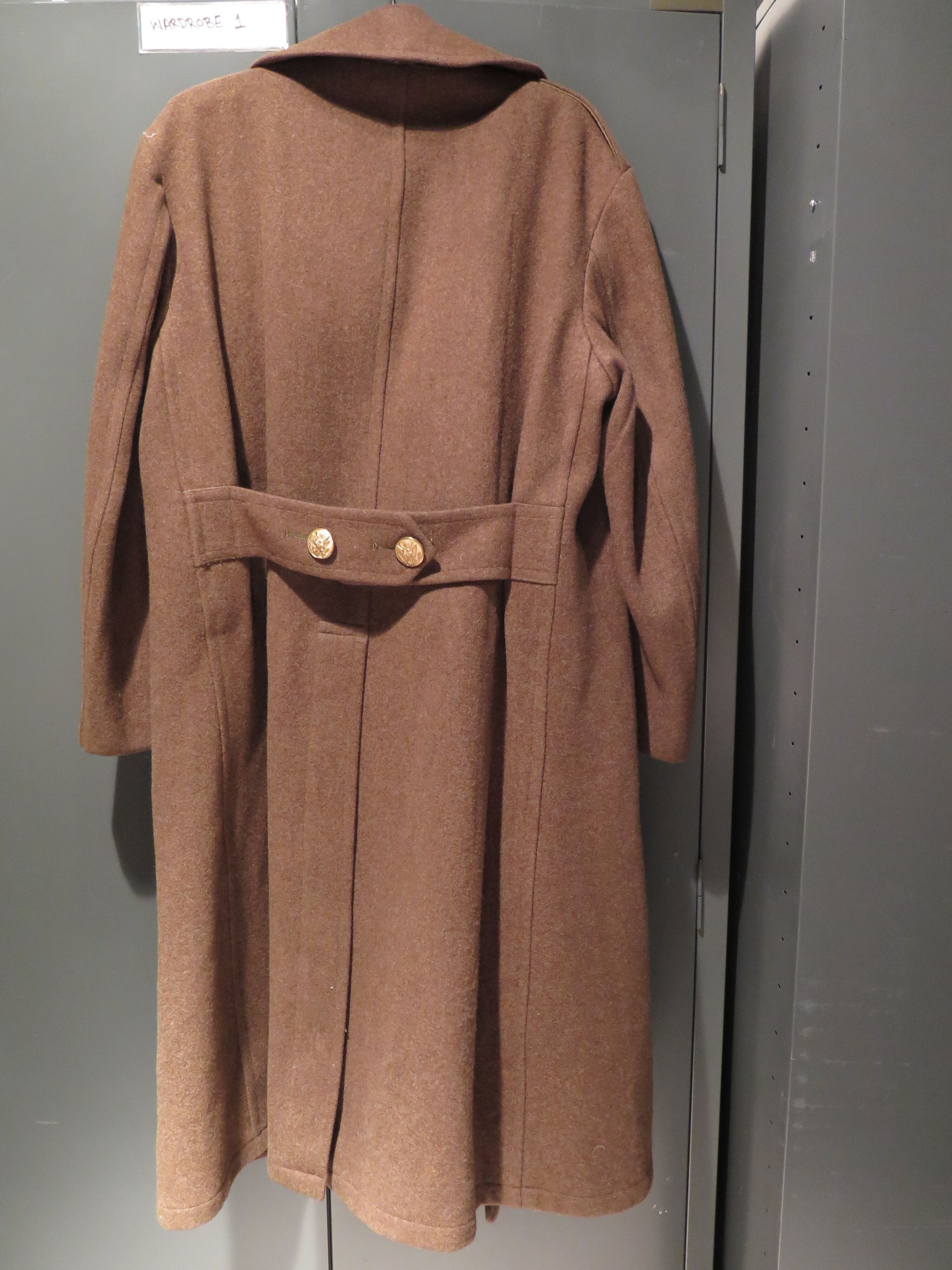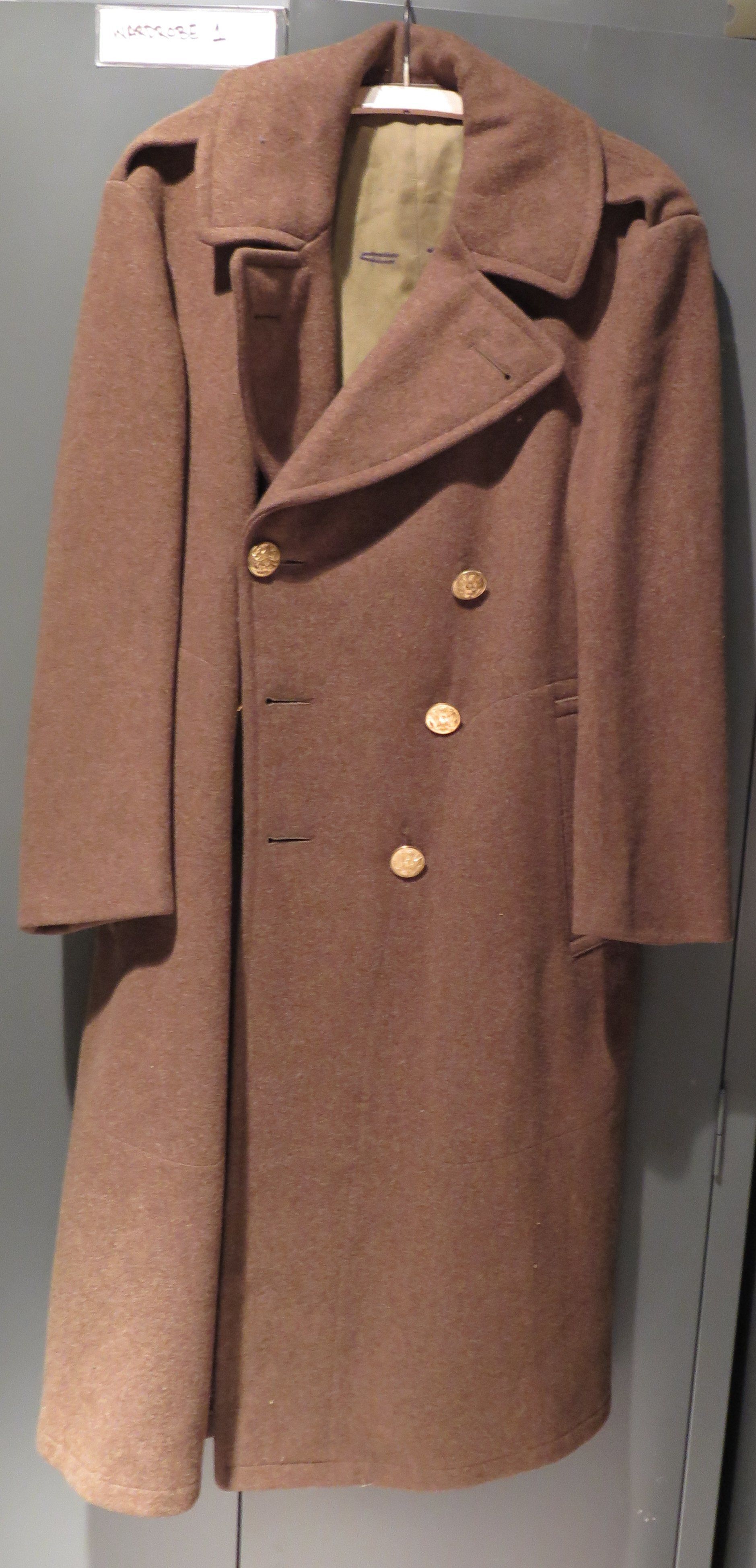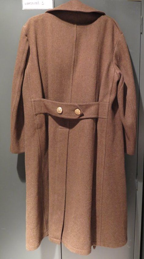Men's brown Army wool doublebreasted overcoat. The overcoat has a notch lapel with 6 gold buttons on the front to secure closure. The overcoat has two pockets on the sides that are vertical with no flaps. The back of the overcoat has a cinche with two gold buttons to taper the sides of the overcoat. The overcoat has a center vent. The overcoat measures 46" (l).