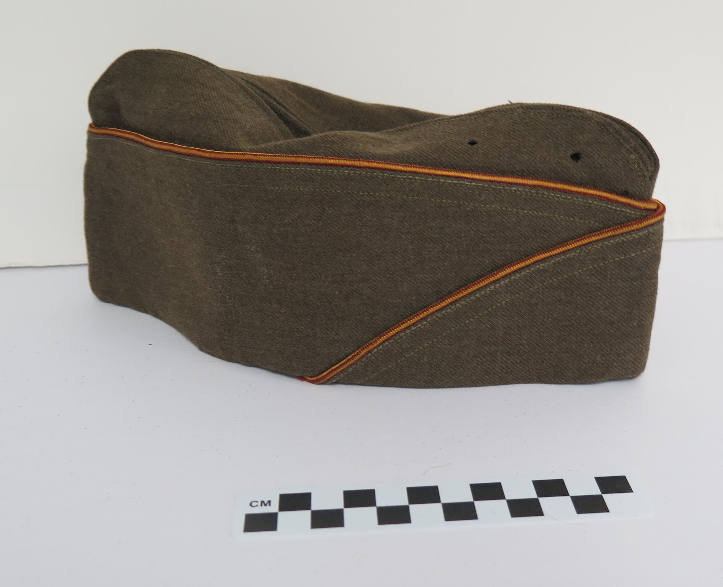 Item is an olive green army side cap with yellow and red piping. It is made of wool and has two holes in the side where the insignia could be attached. It measures 11" (w) x 5" (l). It was donated with another army side cap.