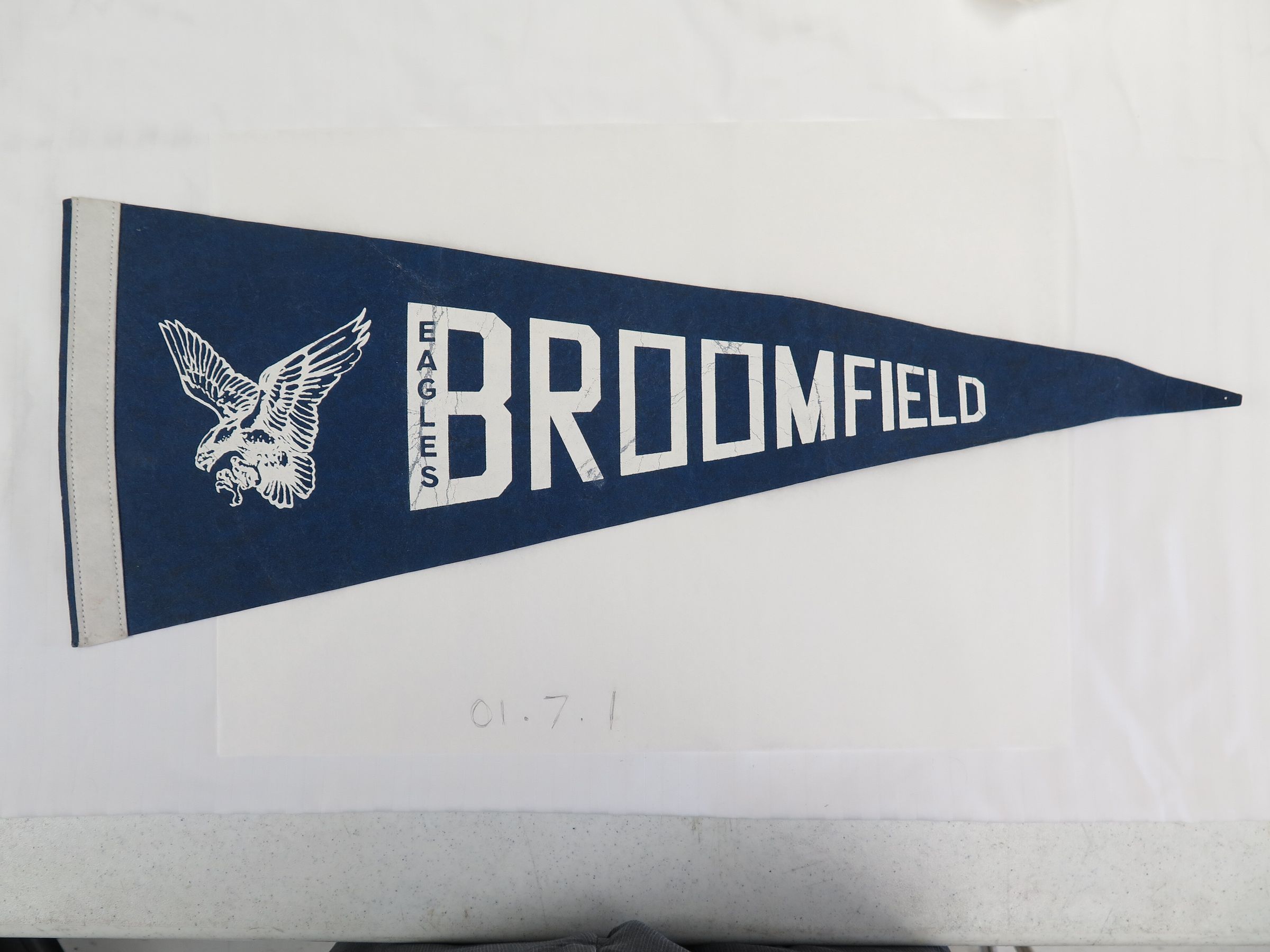 This is a blue, triangular felt pennant with white text on the front that reads, "Broomfield". Inside of the B in Broomfield is blue text that reads, "Eagles". To the right of the text is the image on an eagle. The pennant measures 9" (h) x 23.5" (l).