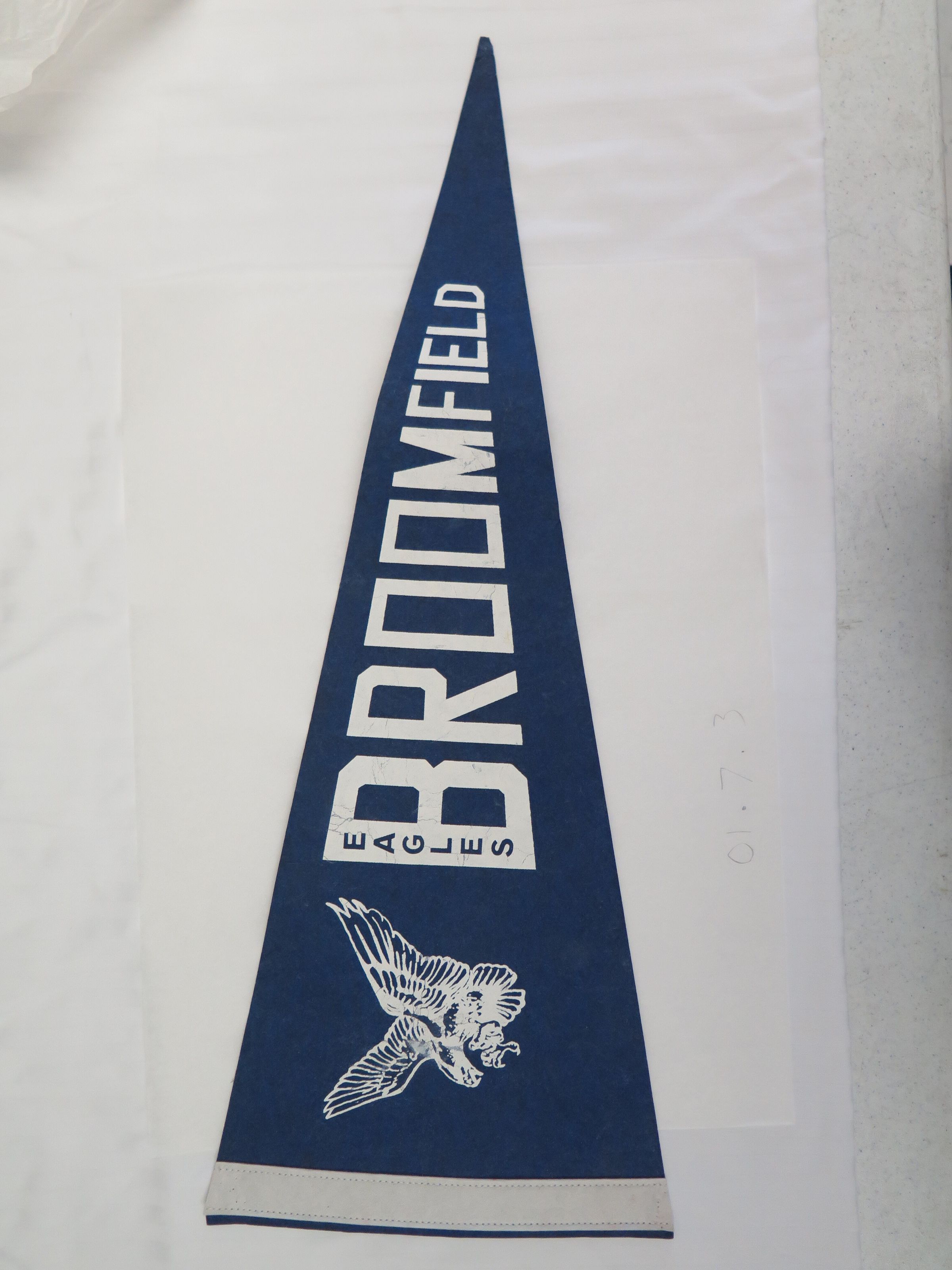 This is a blue triangular felt pennant with white text on the front. The banner has the text "Broomfield Eagles" and the Broomfield mascot on the front. The pennant measures 9" (w) x 23.5" (l).