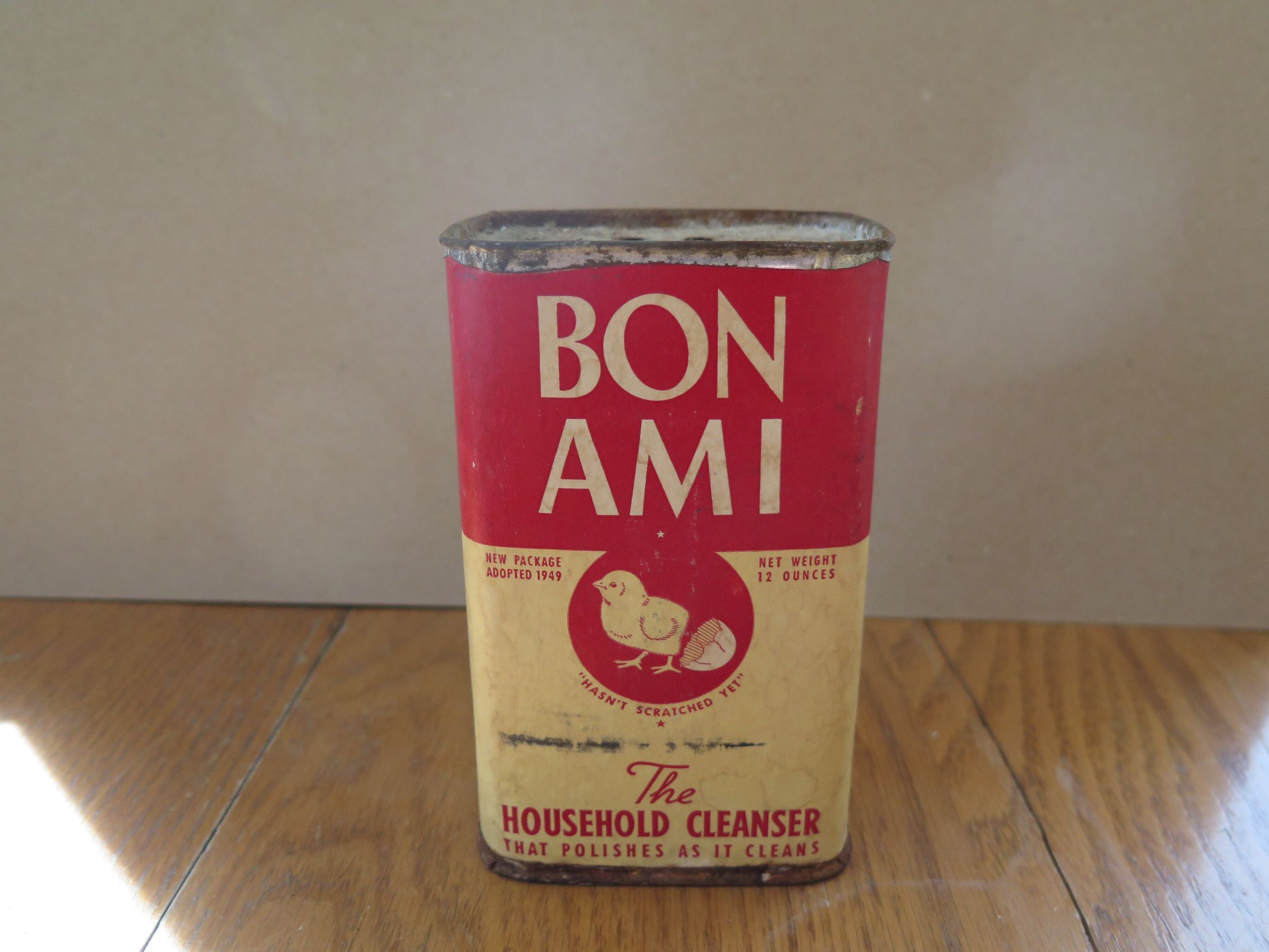 This is a tin with a red and cream label glued to it. The label is for Bon-Ami household clean detergent and has an illustration of a chick hatching out of an egg at the center.The bottom of the tin reads "The household cleanser that polishes as it cleans." The tin measures 5" (h) x 3" (w) x 2.25" (depth).