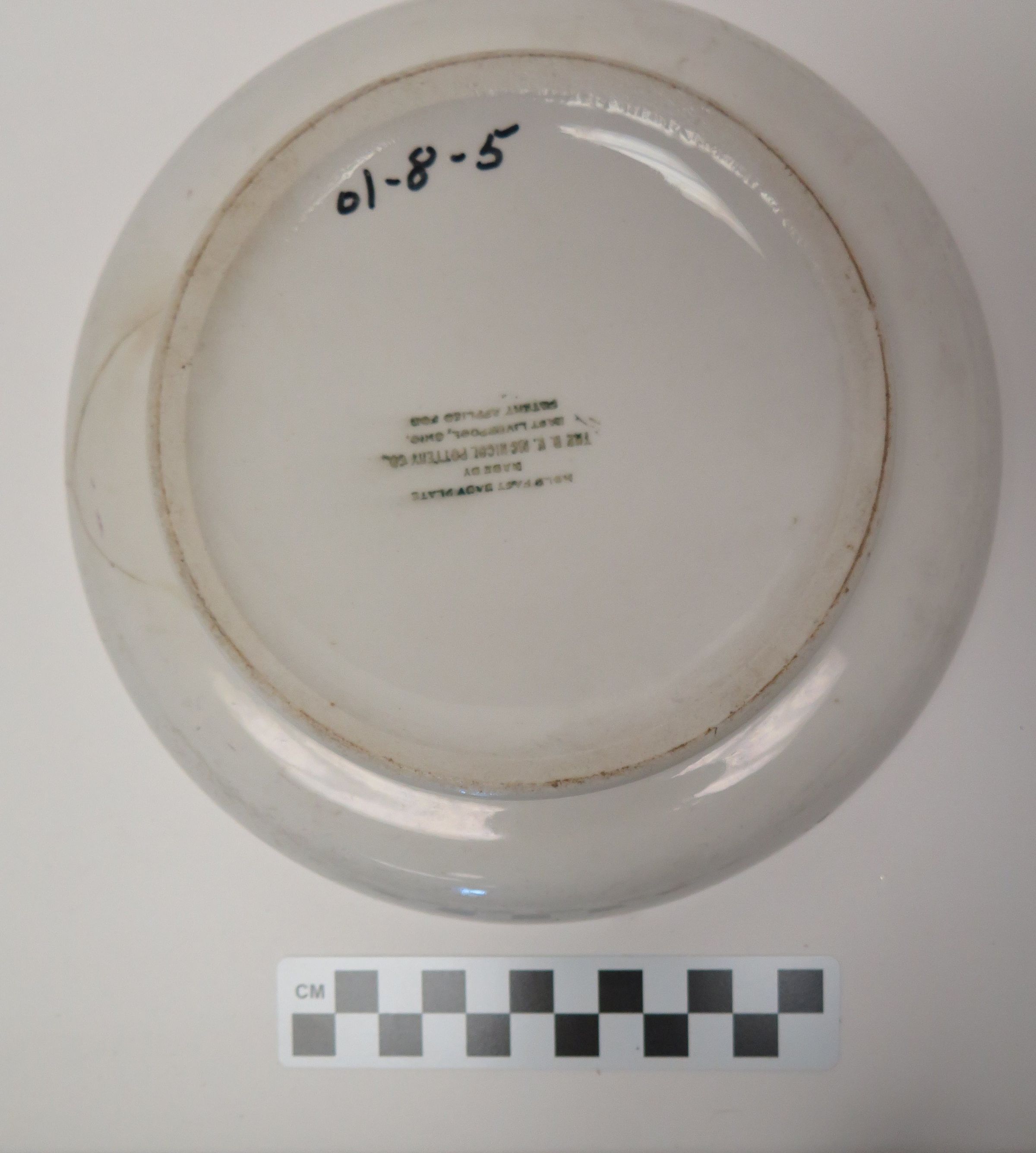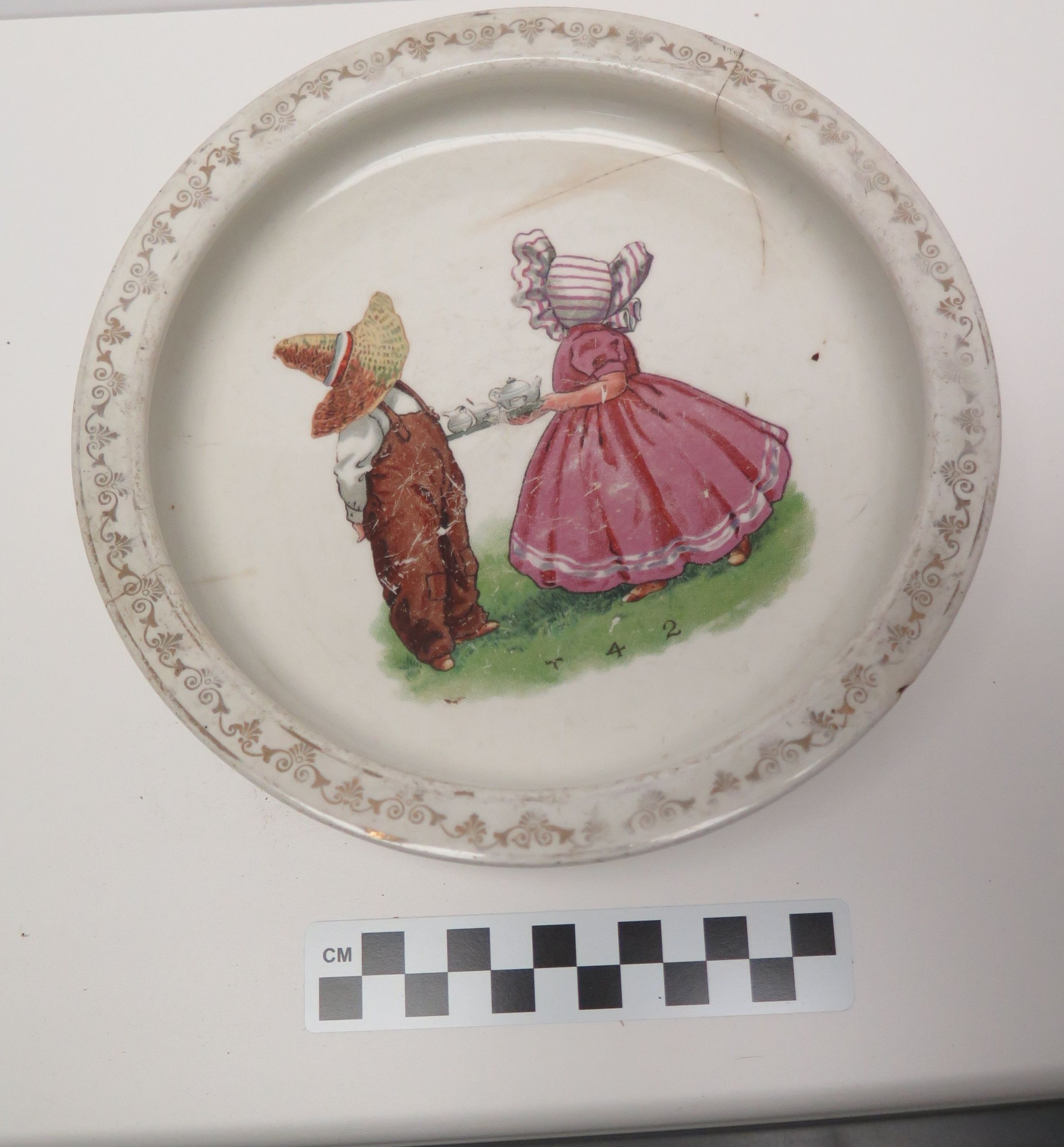 This is a ceramic high-sided child's dish featuring a color image of two figures. One is wearing a straw hat, white shirt, and brown overalls. The other is wearing a white sunbonnet and a pink dress. She is holding a tray with a tea service. The dish measures 1.75"(H) x 8.125"(Dia).