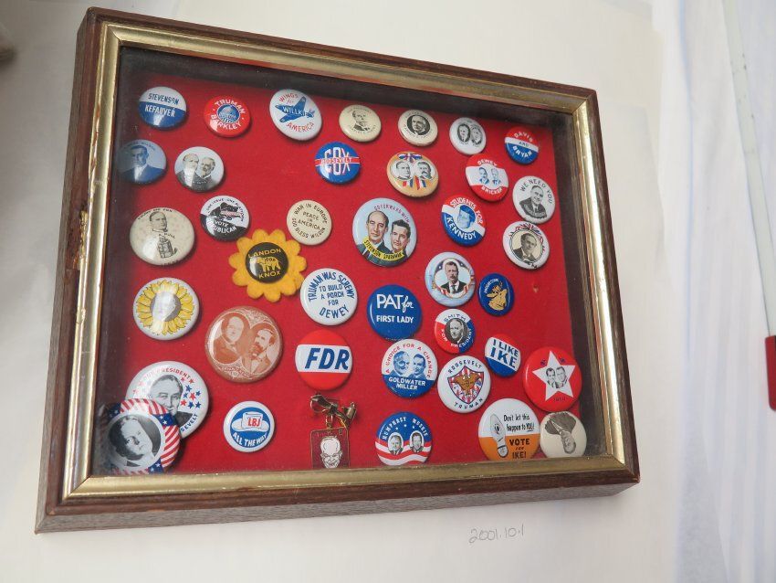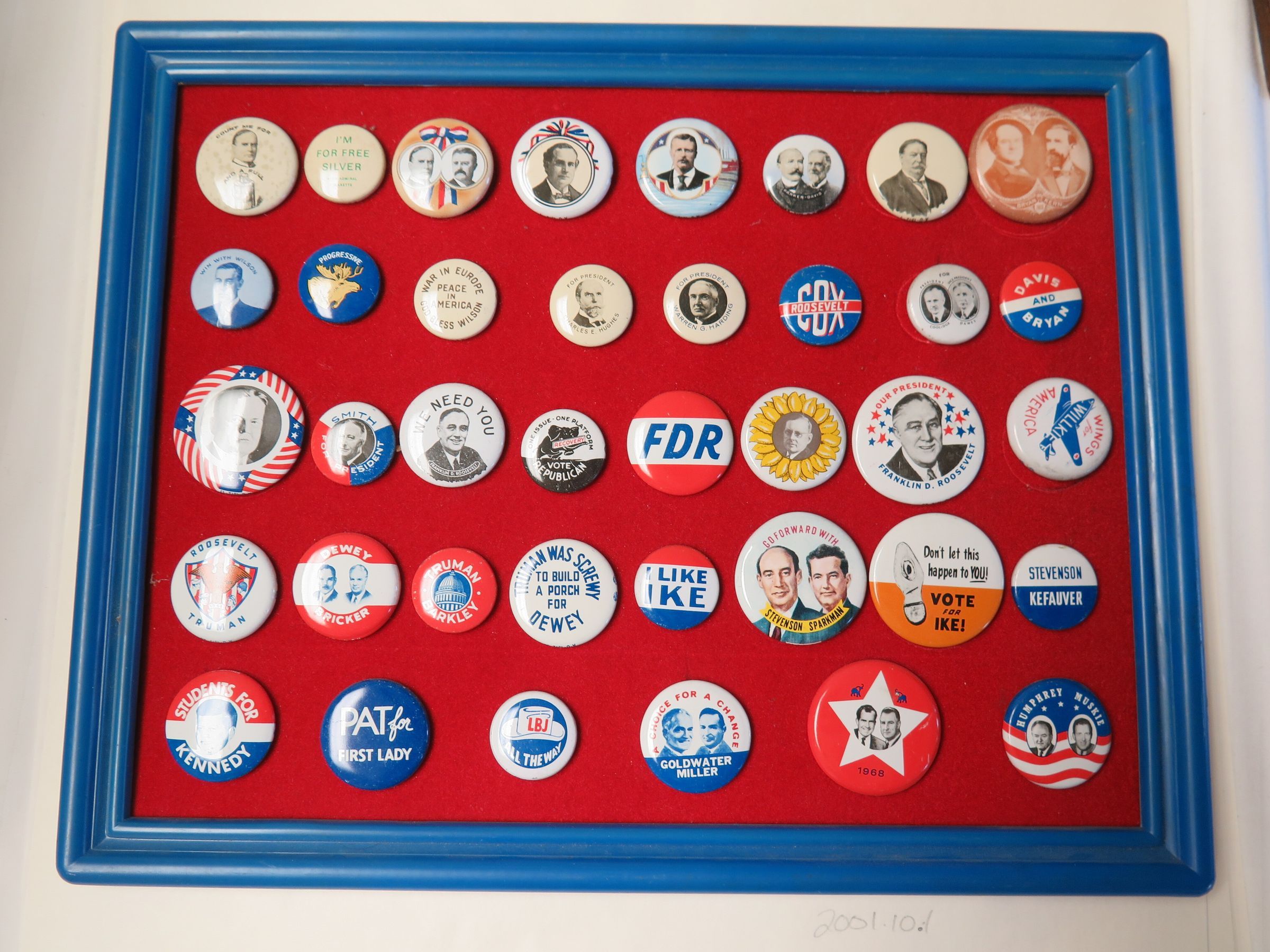This is a set of 38 framed political buttons. The frame is blue and the mat is red. The frame measures 9.5" (l) x 12" (w).