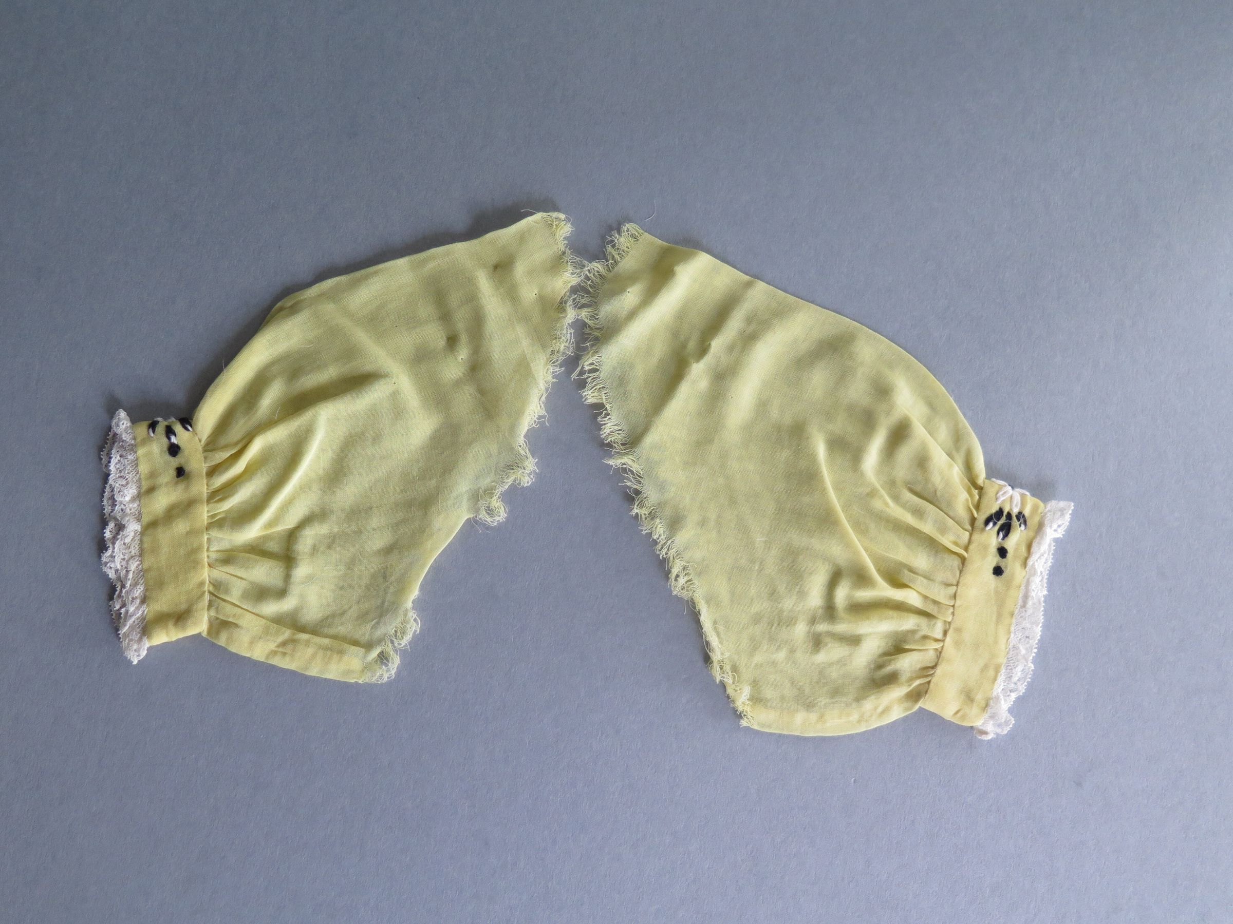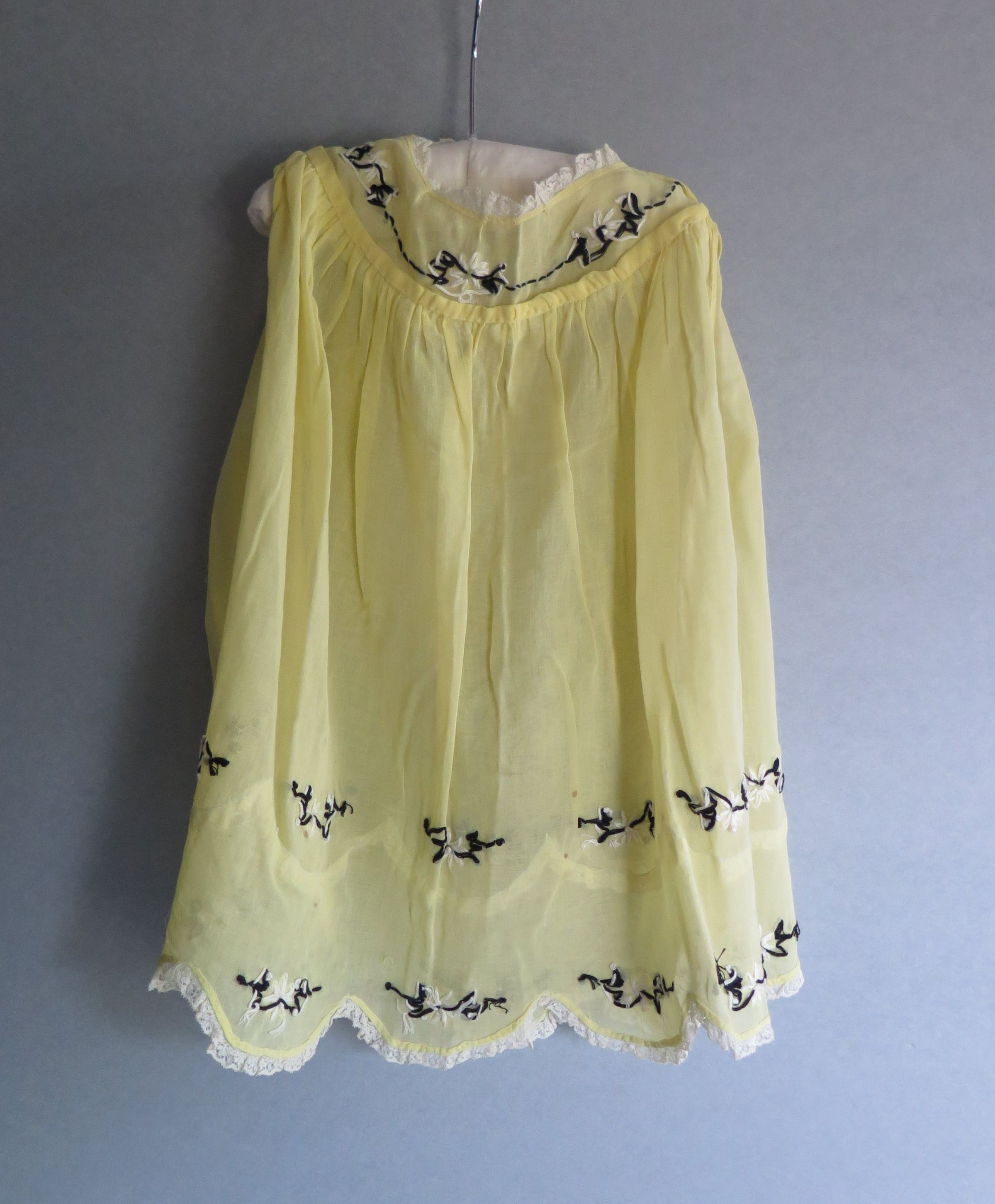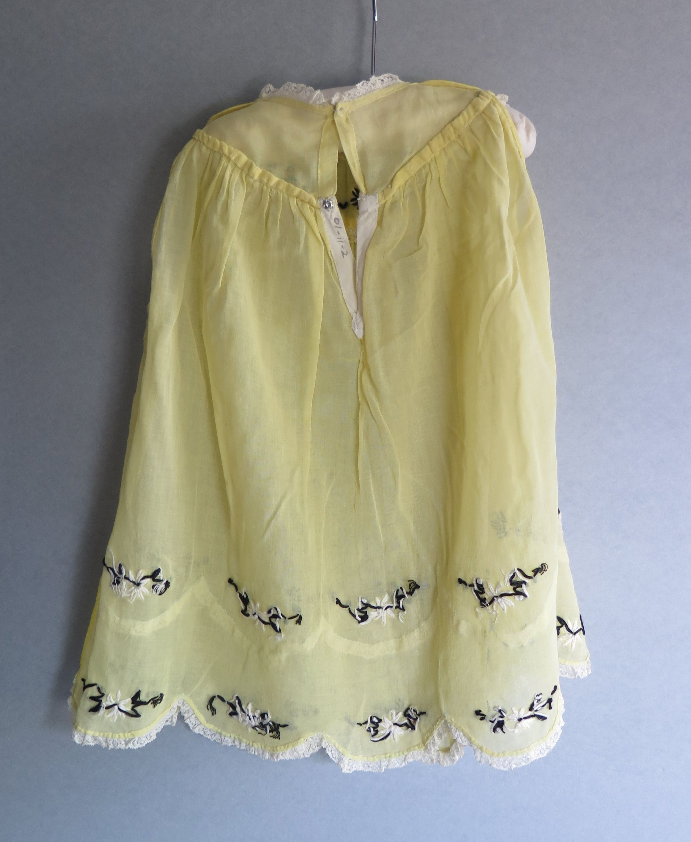 Child's sheer yellow dress with black floral embroidery around the neckline and two lines of them near the hem. The neck and the hem are trimmed in a scalloped white lace. Under the neckline the material is pleated. The back of the dress is split with a few buttons about a quarter of the way down to close the dress. There are two matching sleeves in a sheer yellow material with pleats at the arm hole with black floral embroidery and white lace trimming the edge. The dress measures 9" (w) x 18" (l).