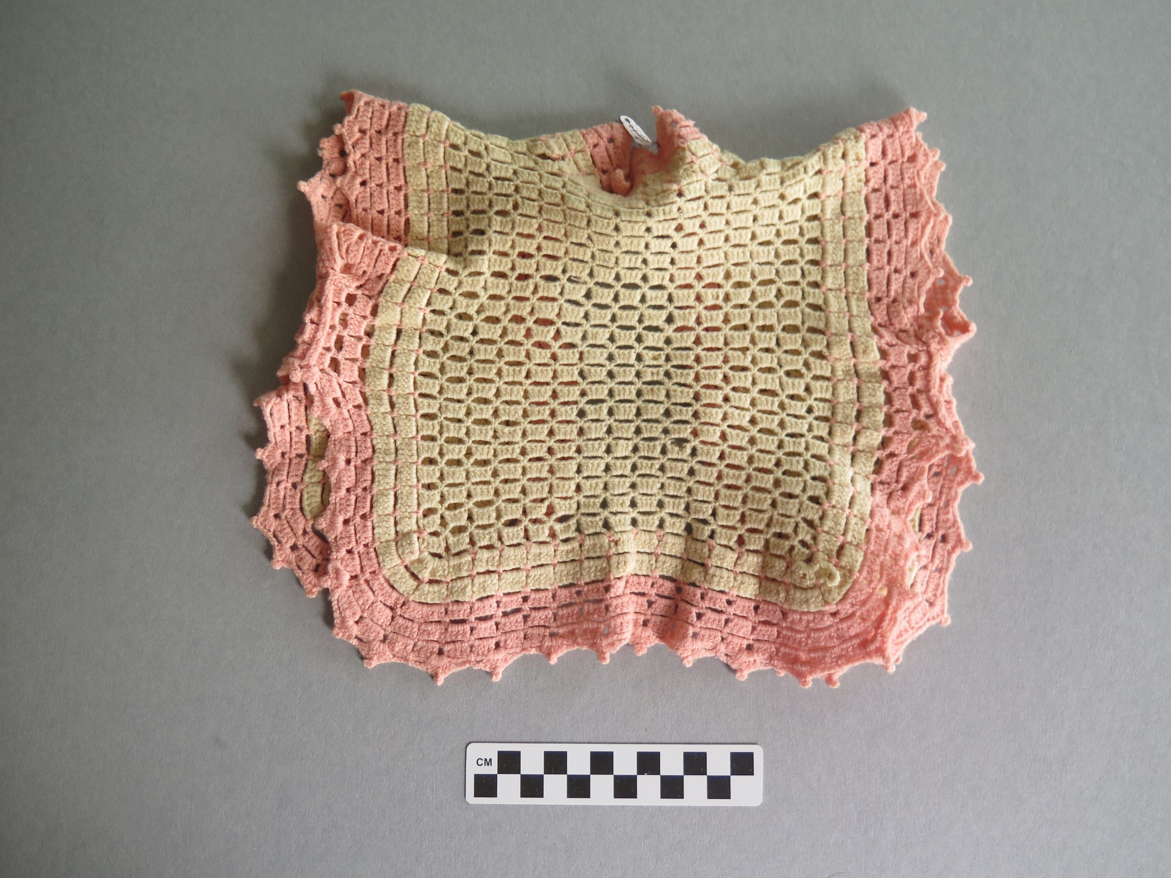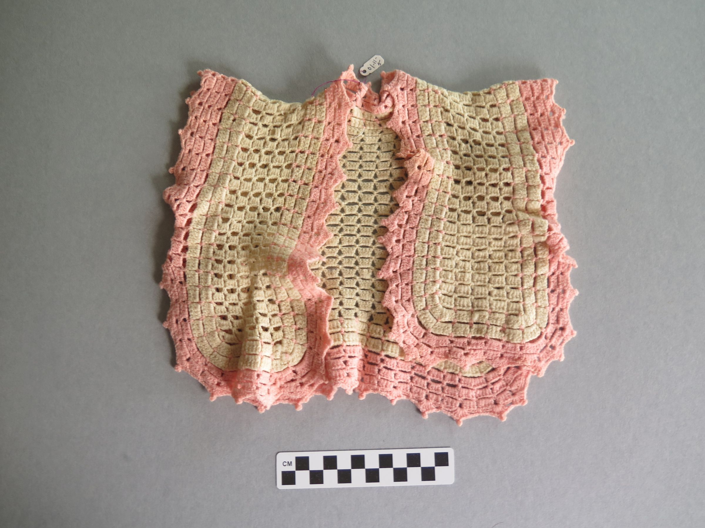 Baby white crocheted sweater or vest with pink crocheted trim. The edges of the sweater are scalloped and there is a split down the front with no closing. The sweater measures 9" (w) x 11" (l).