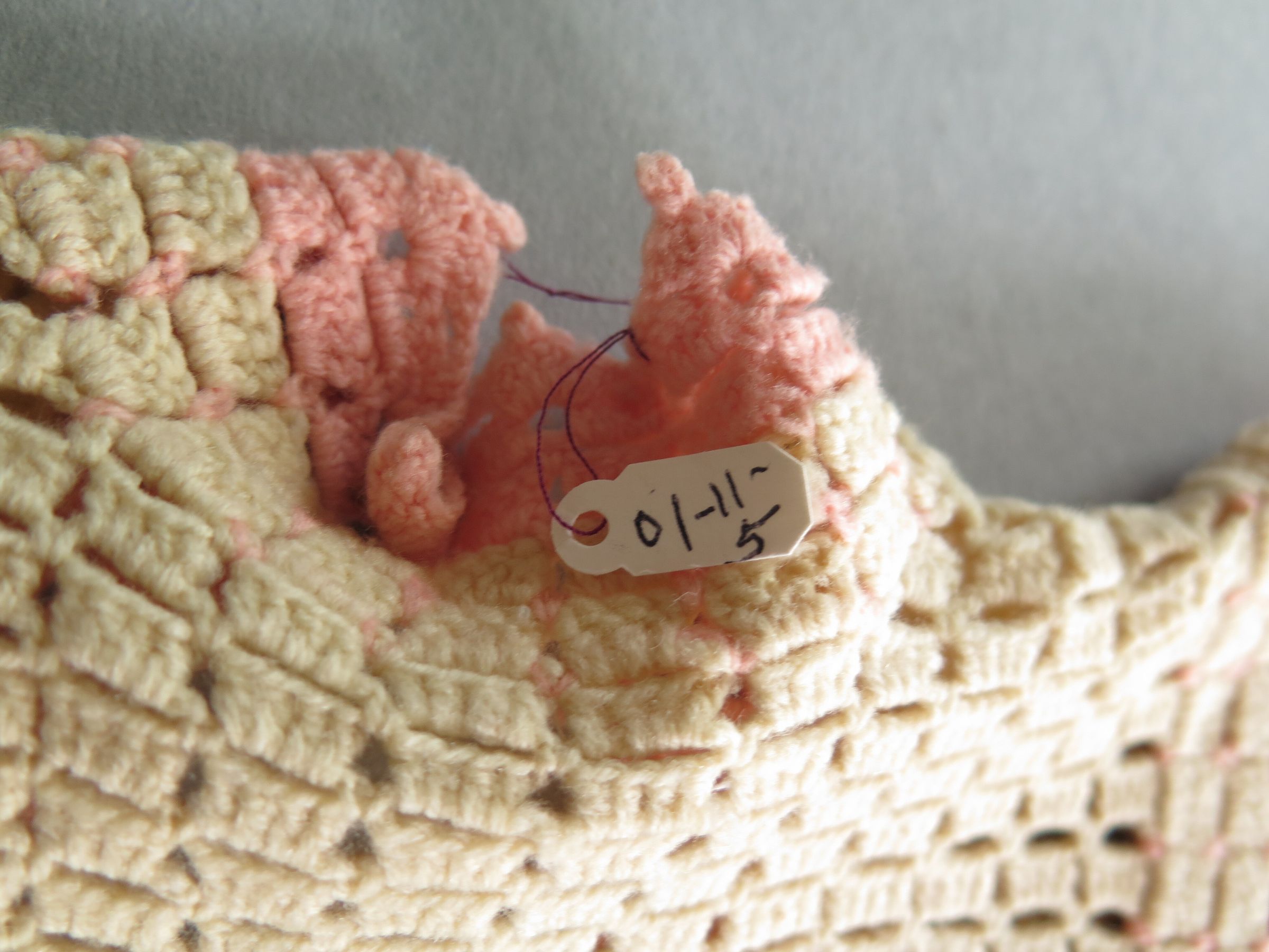 Note: There was a dermestid infestation discovered during the 2015 inventory in this box, this item was not damaged excessively. All textiles in the box were vacuumed and frozen (APixley 7/18/2017).