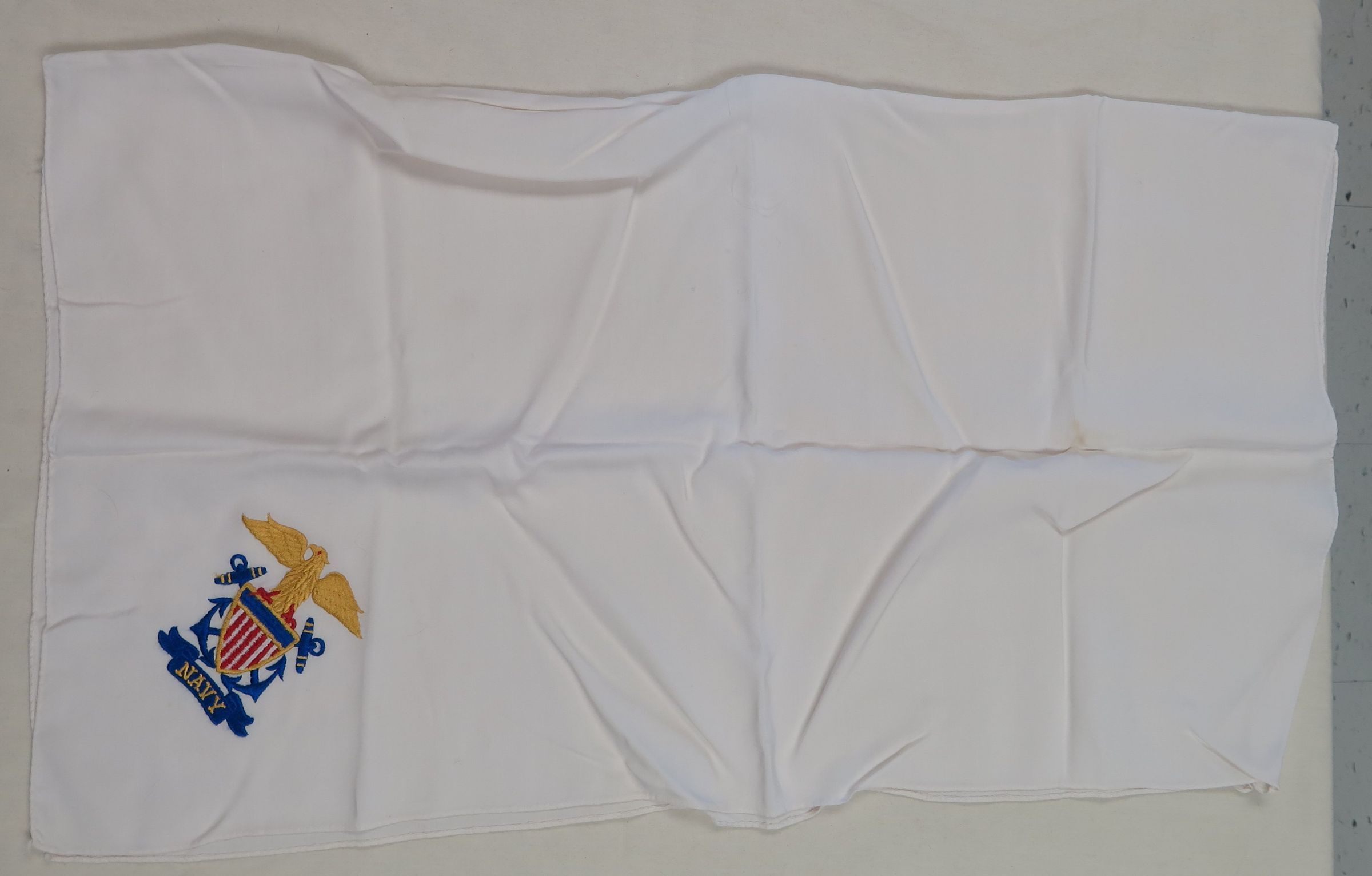 White scarf or hand towel with the word "Navy" embroidered on one corner. There is an eagle atop the word and is embroidered using the colors red, blue, white and gold. Scarf measures 28" (w) x 32" (l).