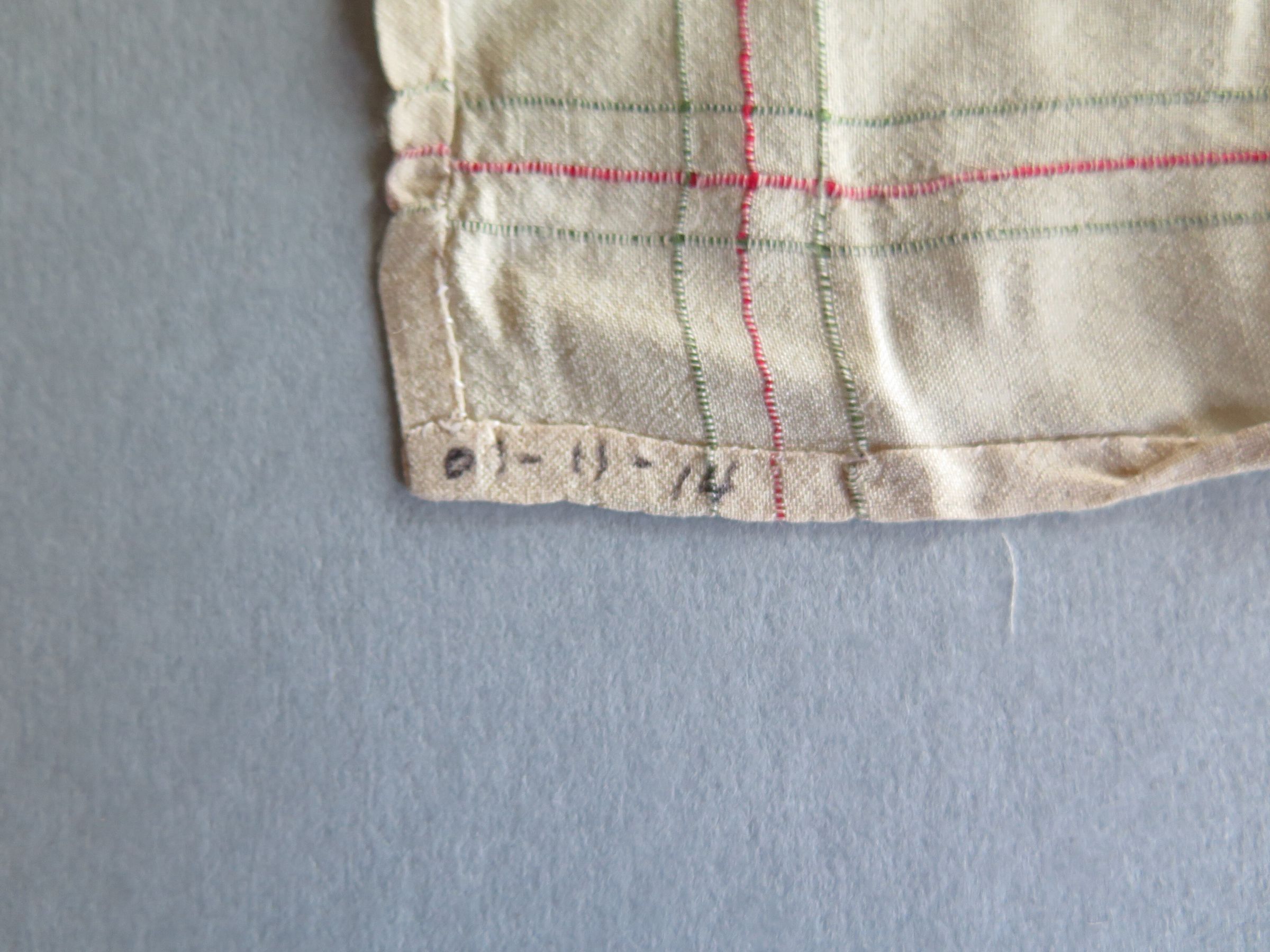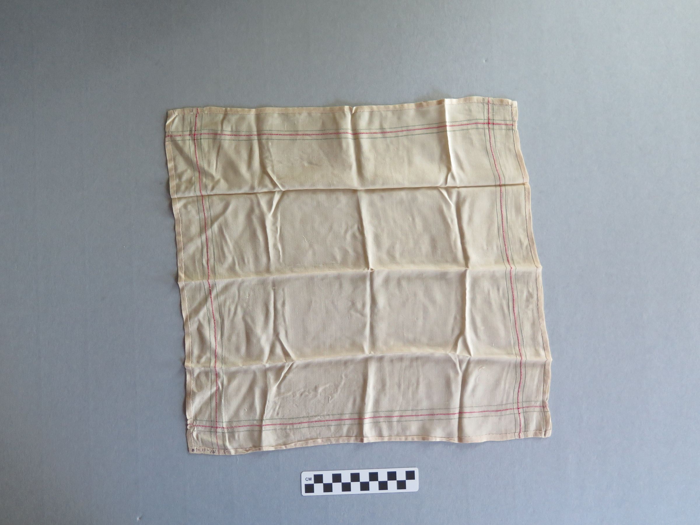 Tan silk handkerchief with red and green stripes trimming the edges. The handkerchief measures 4" (w) x 8" (l).