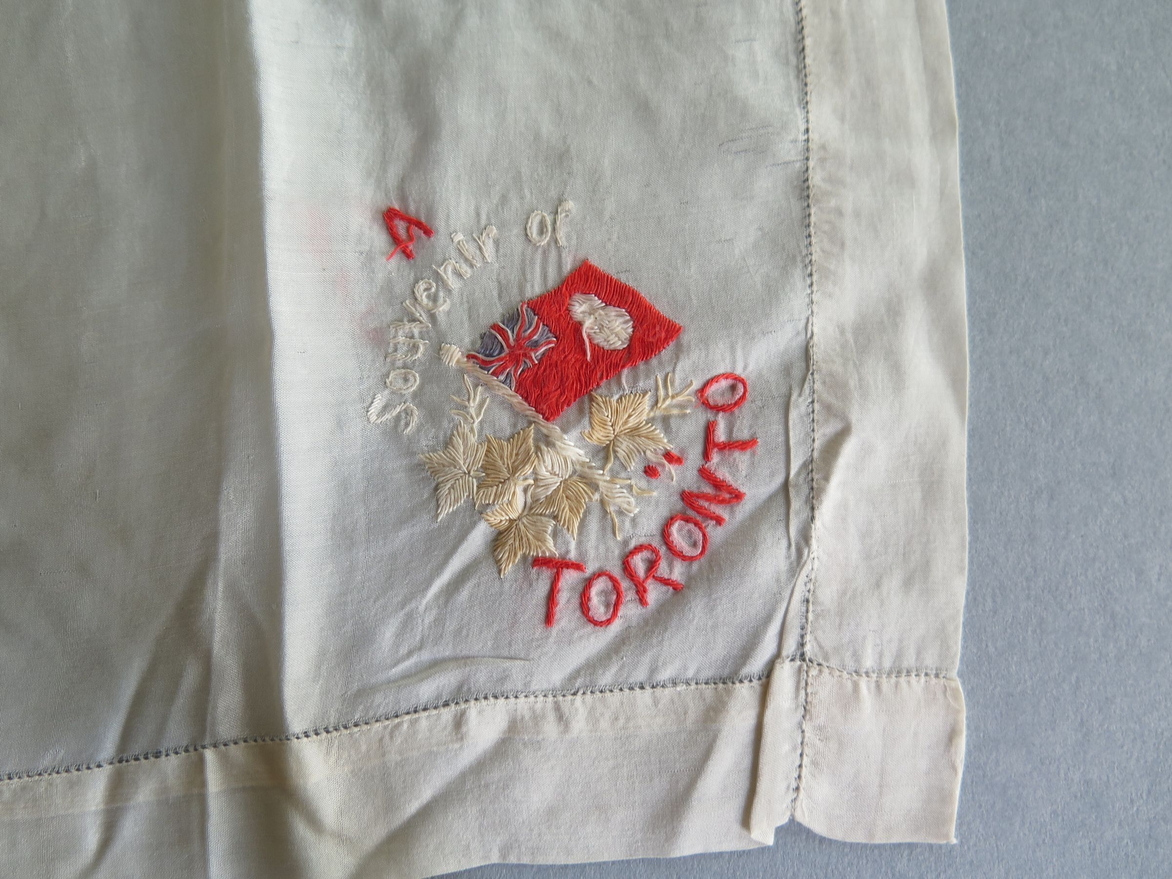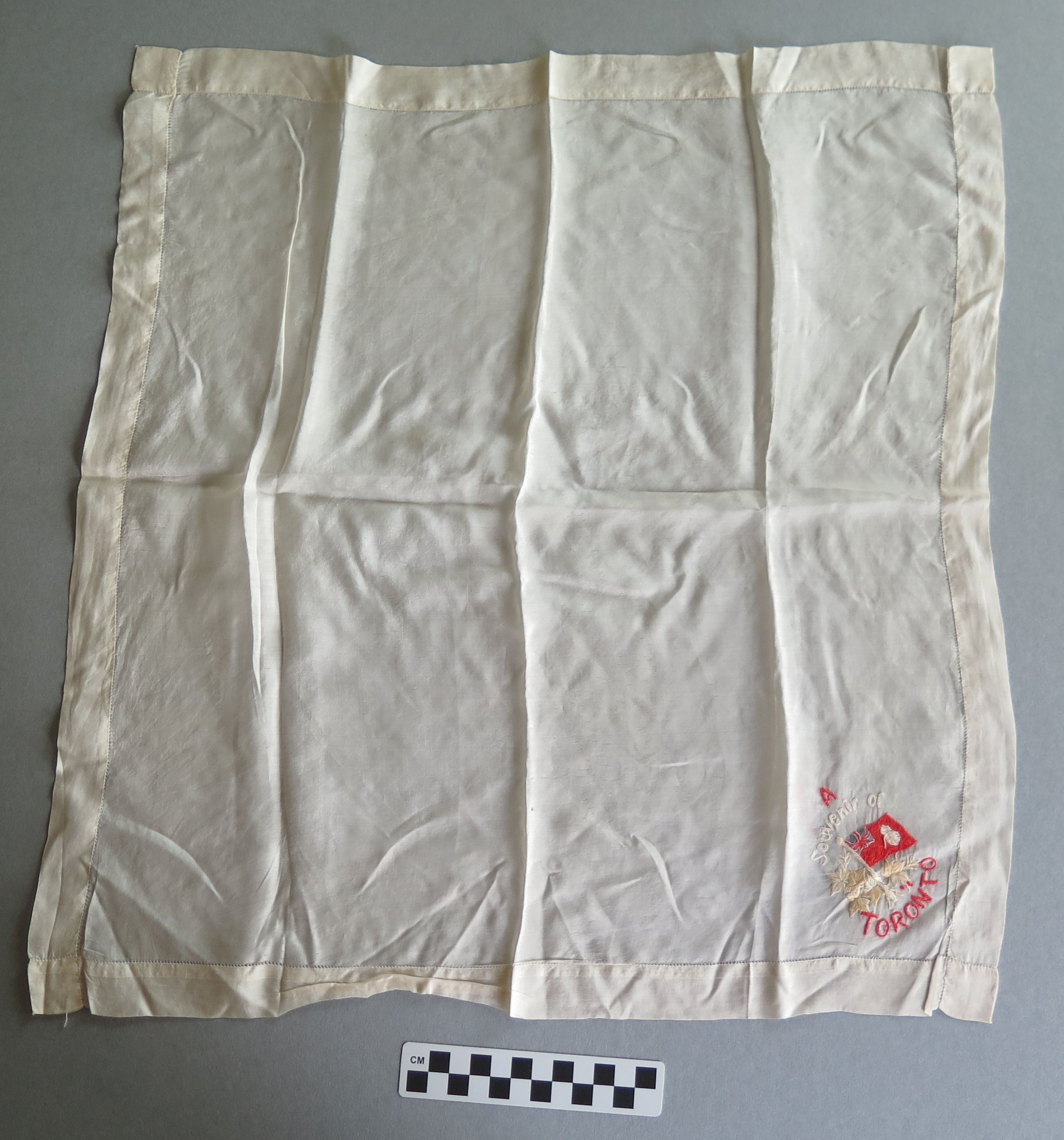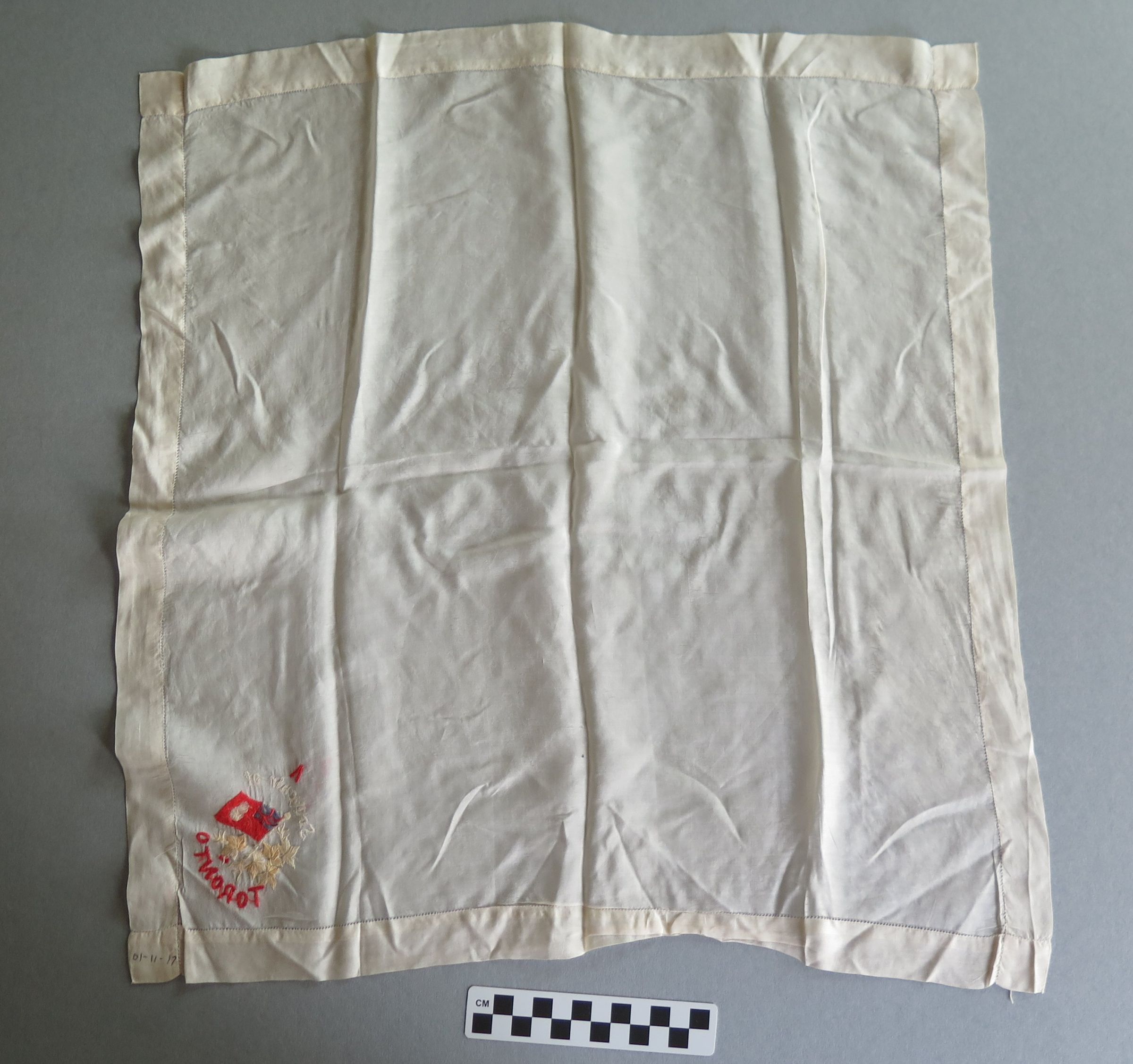 White handkerchief with a detail in one corner that reads "A souvenir of Toronto" with a Canadian flag surrounded by maple leaves.The handkerchief measures 18" (w) x 20" (l).