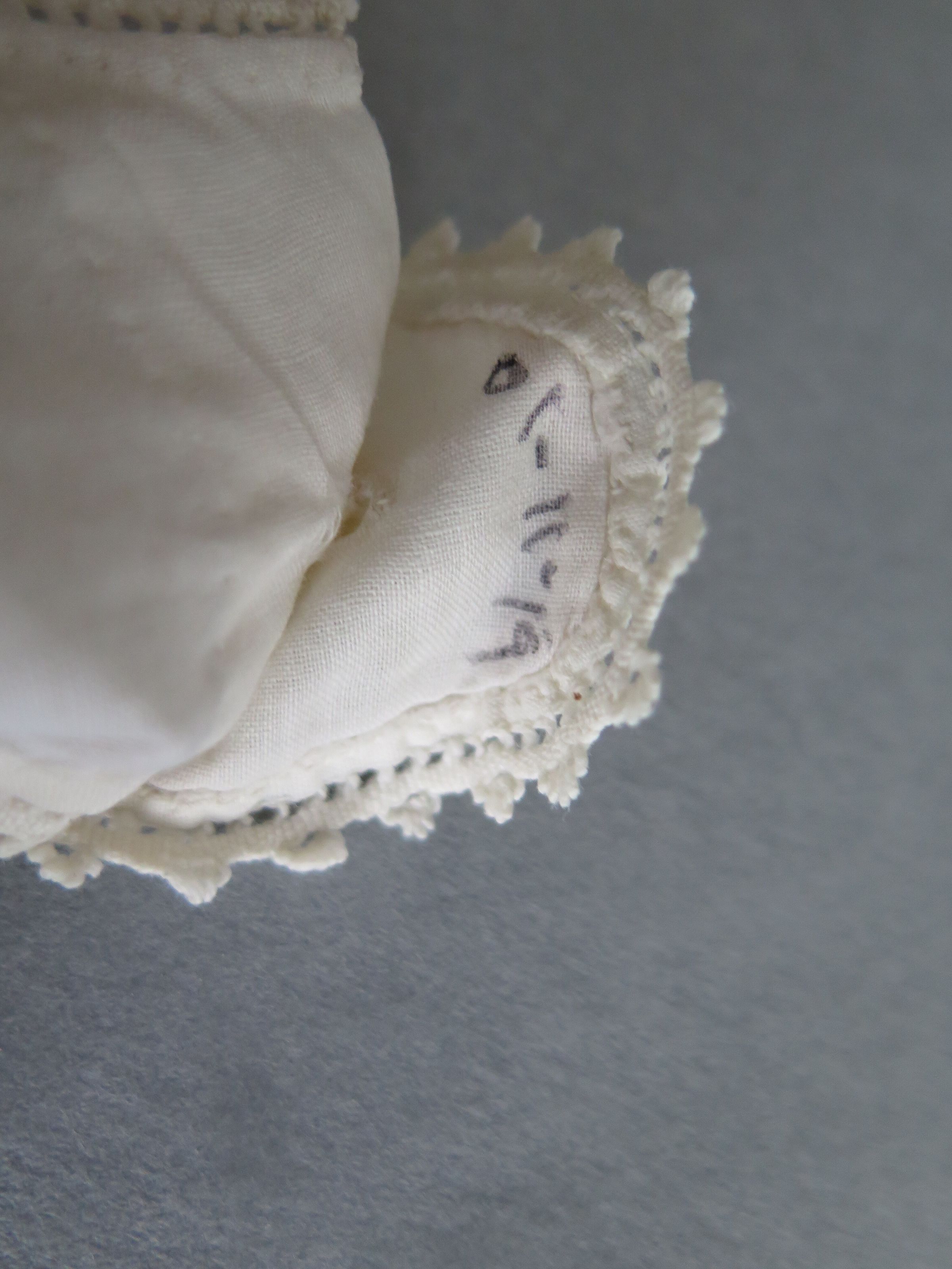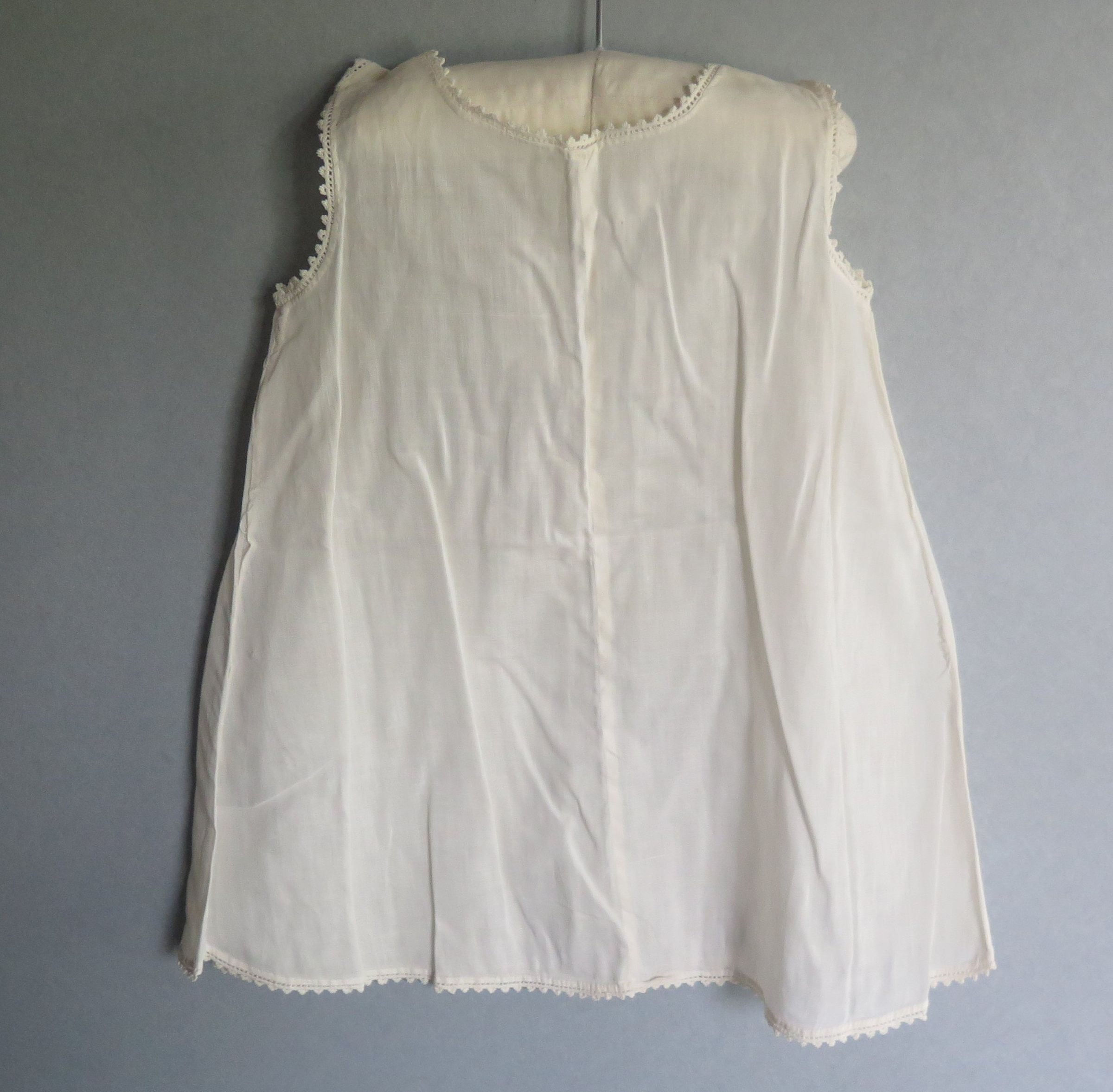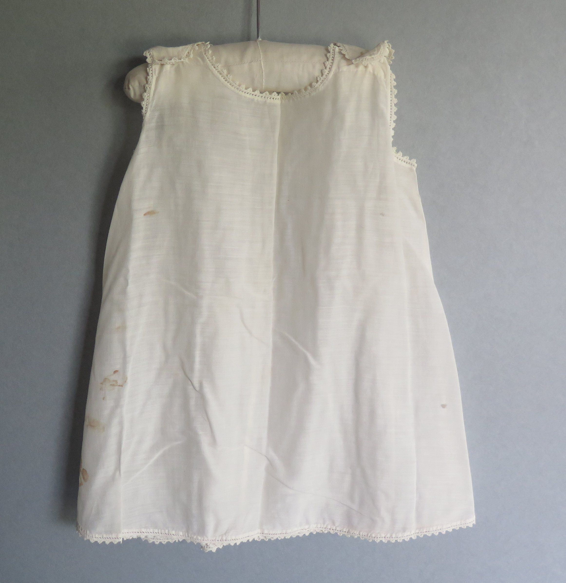Child's white sleeveless slip with scalloped crocheted trim on the neckline, hem and arm holes. There are buttons at the top of the shoulders of the slip to secure closure. The slip measures 16" (w) x 18.5" (l).Collection