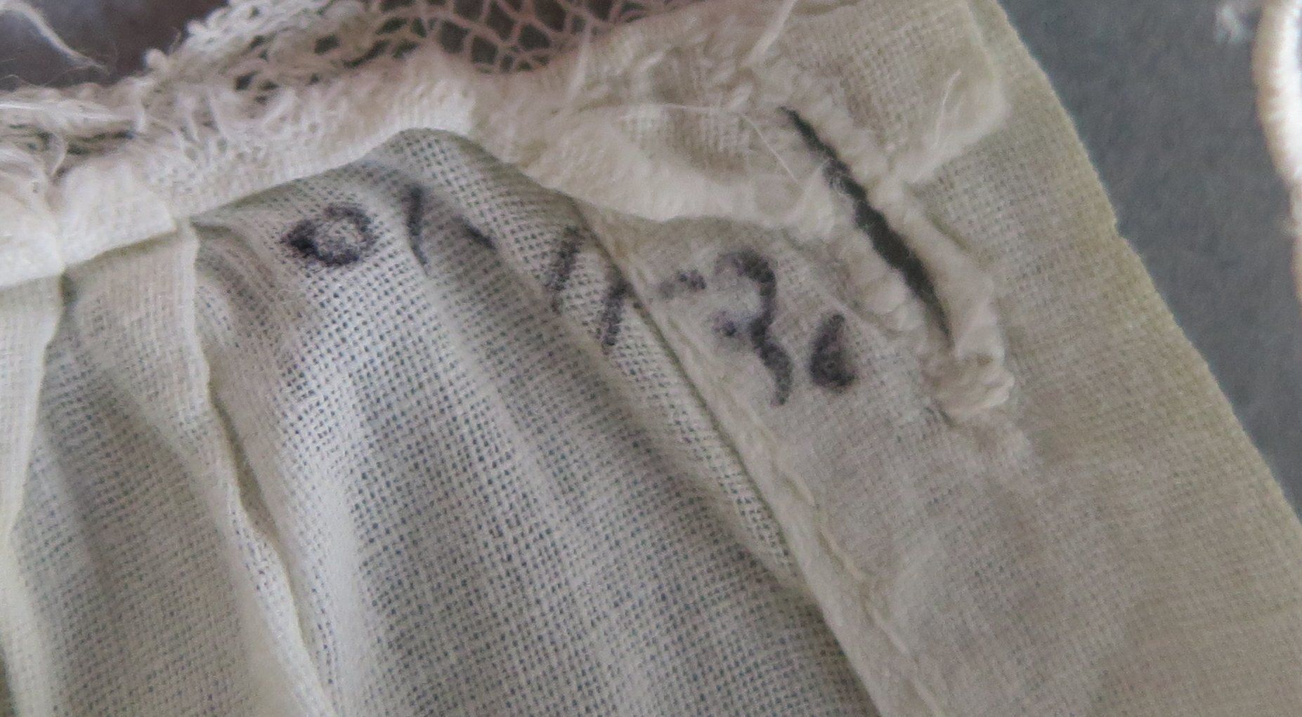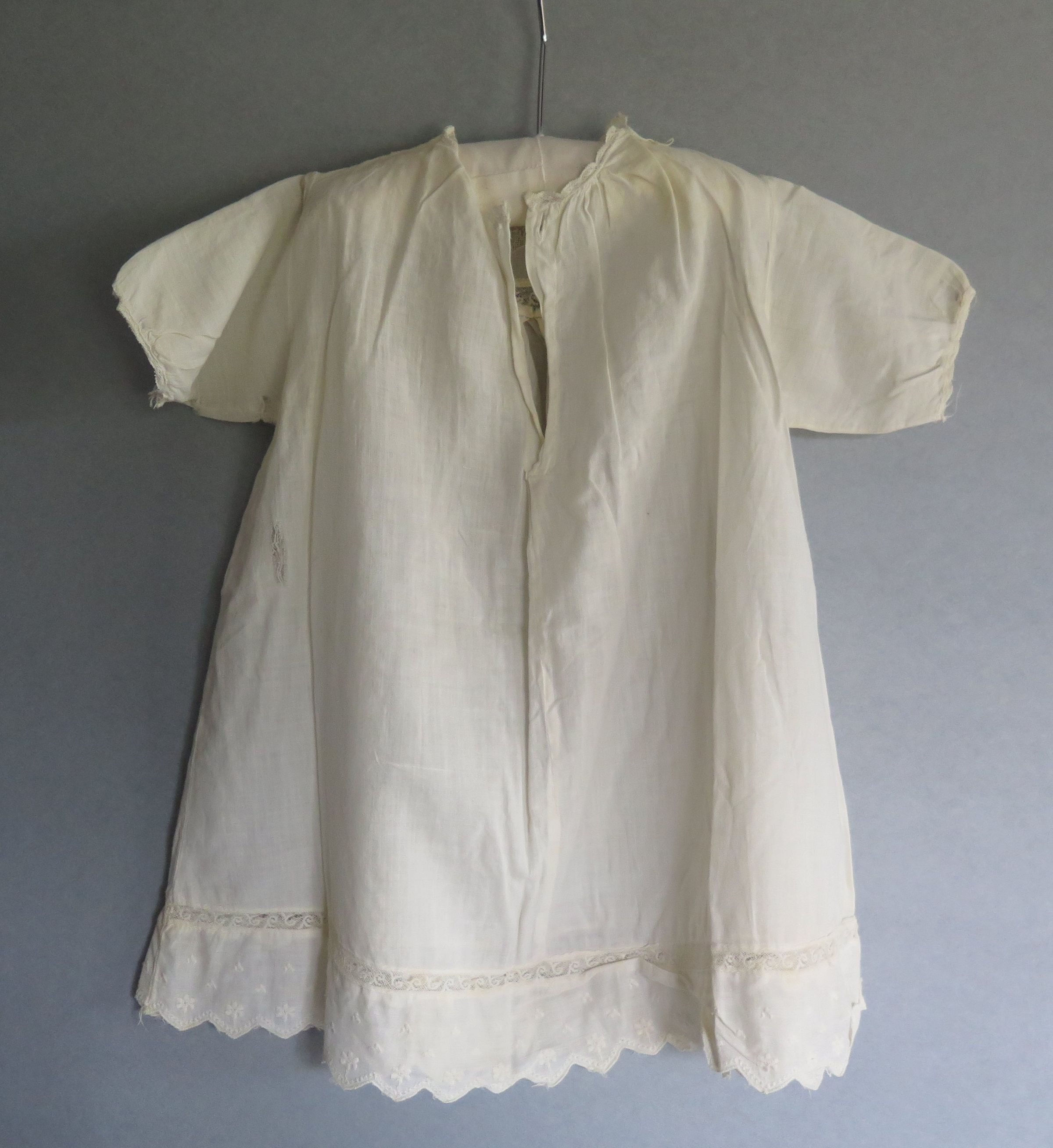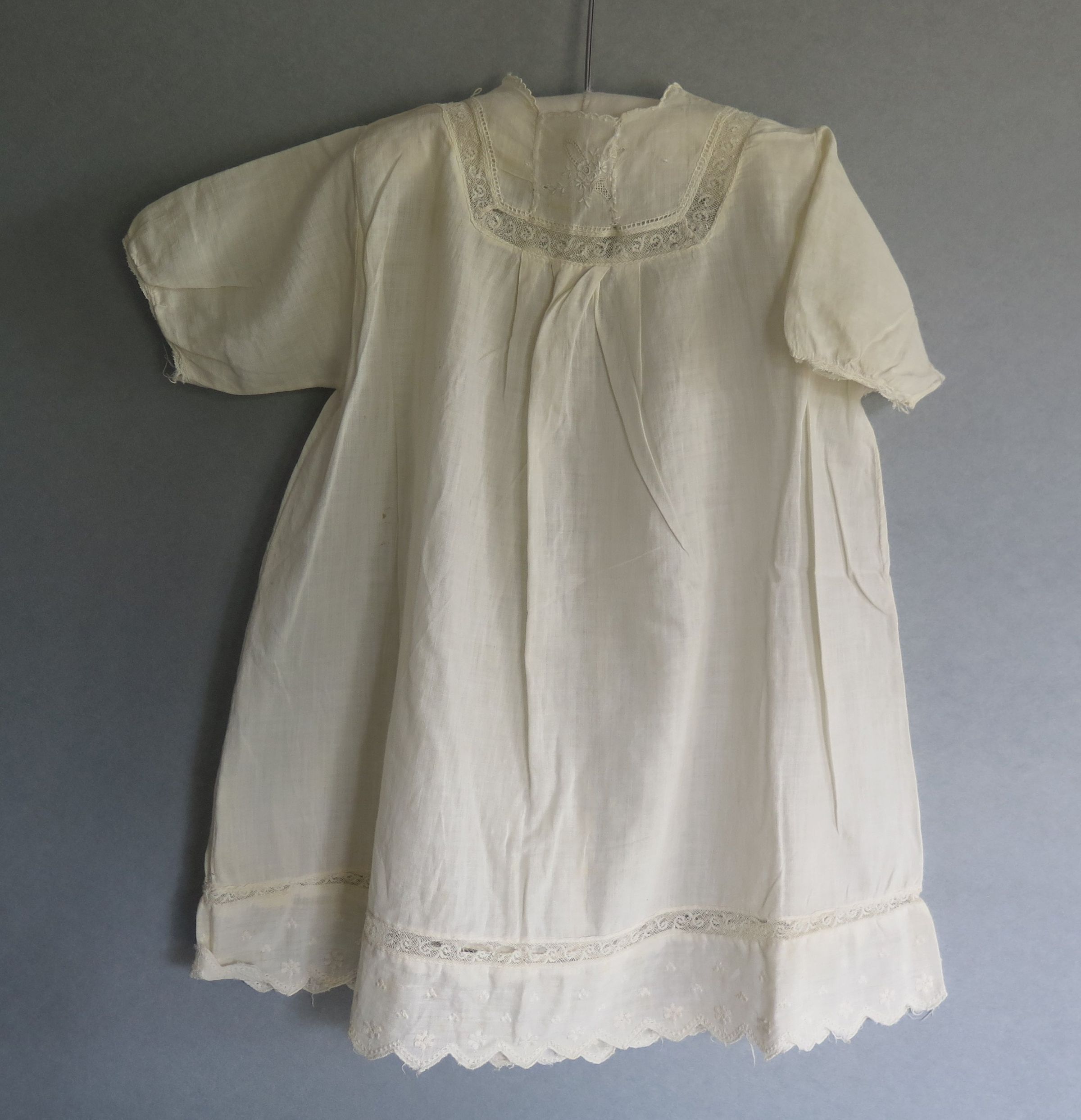 Baby's white dress with sleeves, a high neckline and scalloped trim. The high neckline of the dress has a crocheted and embroidered design. The back of the dress opens from the neckline down to about 1/4 of the dress with a single button at the top secure close. The dress measures 8" (w) x 17" (l).Collection
