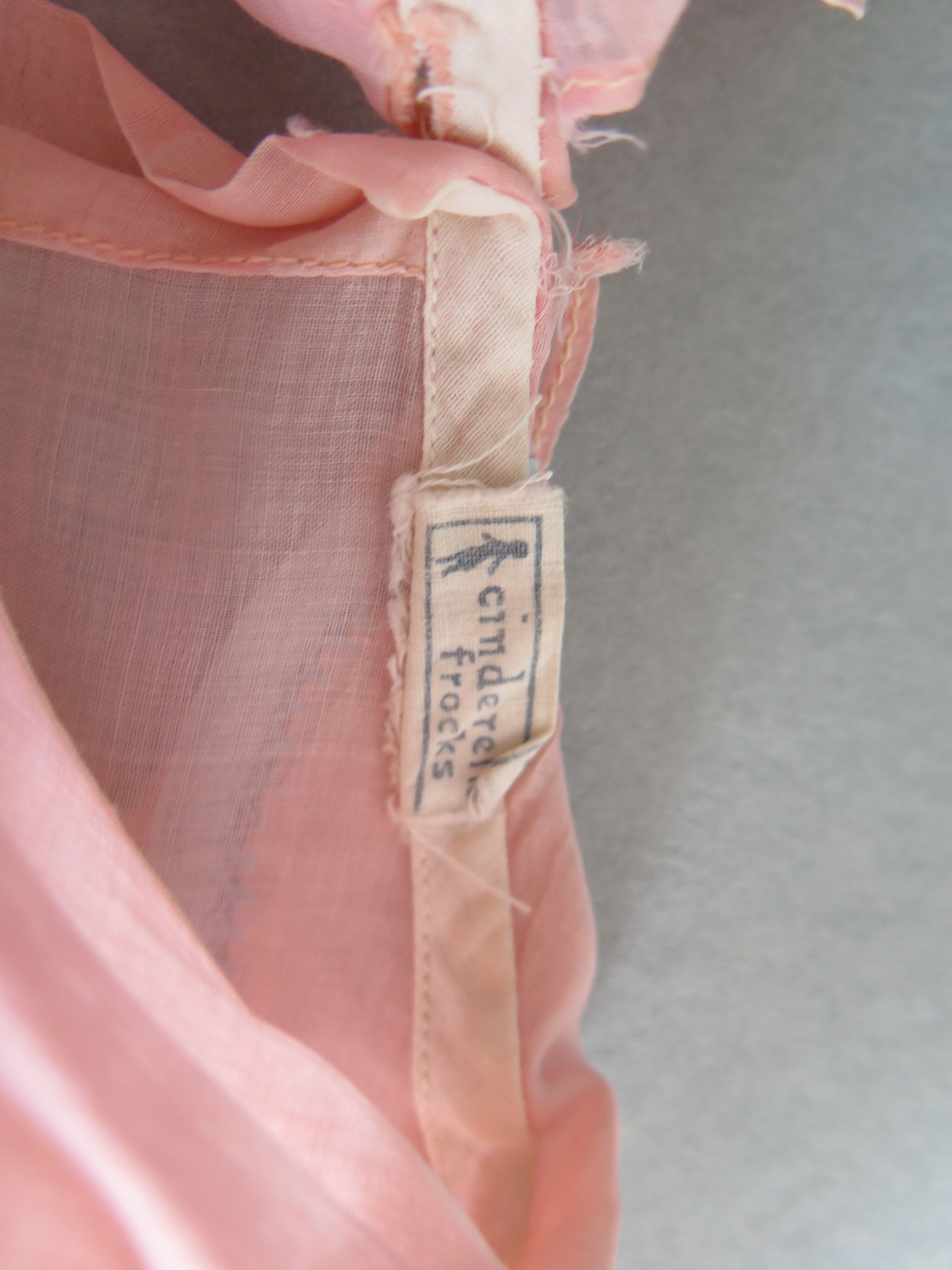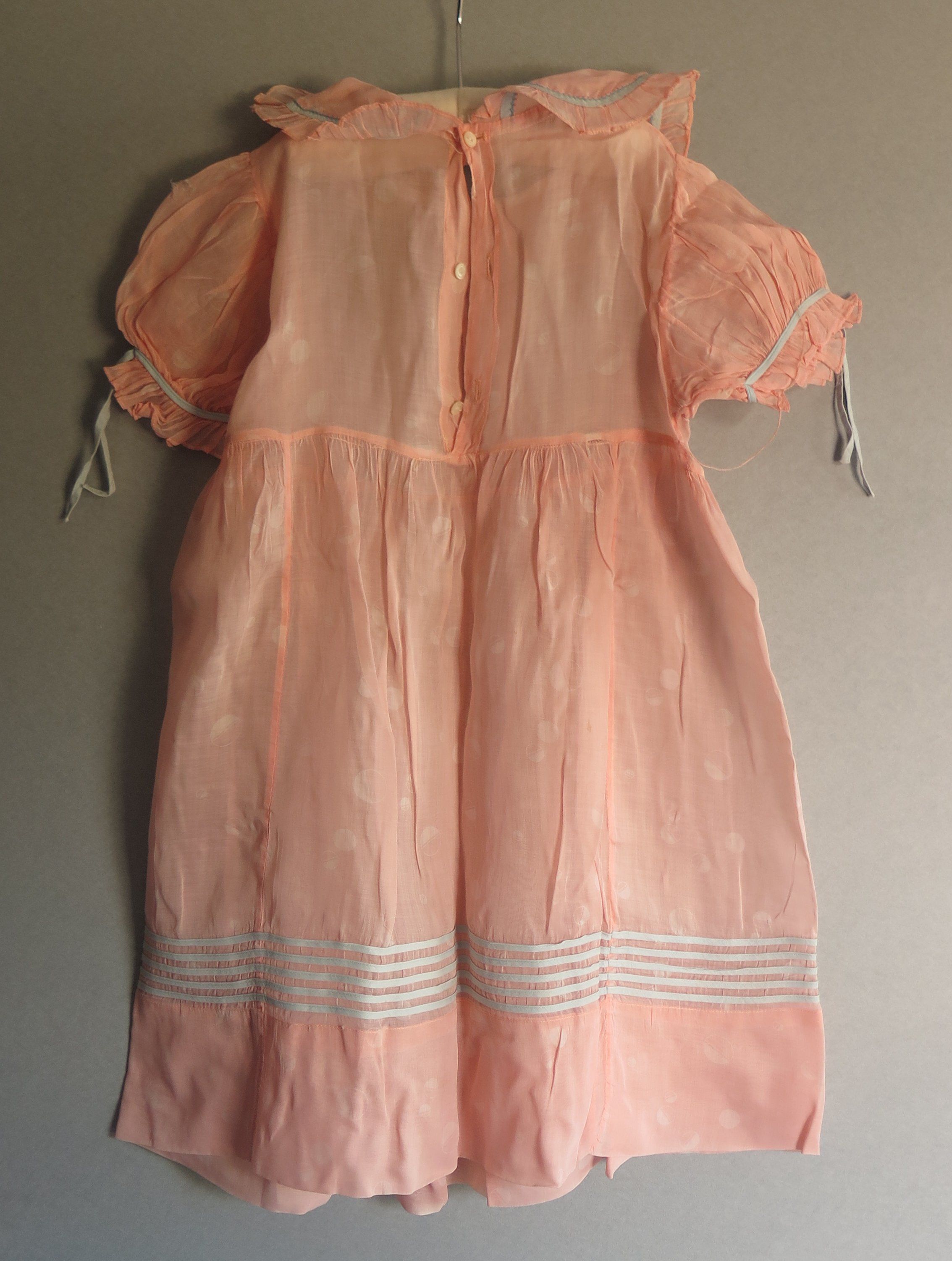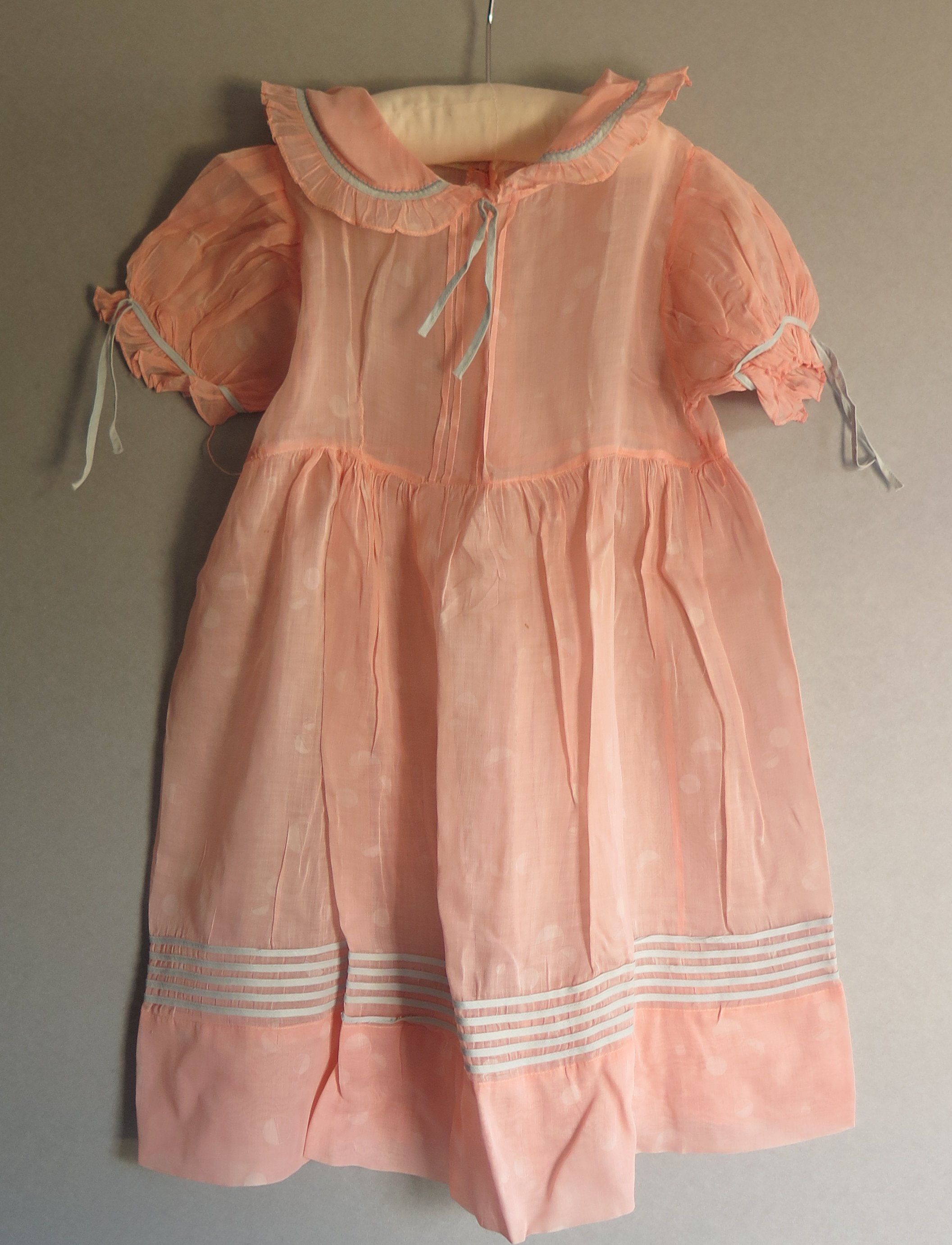 Pink sheer girl's dress with tone on tone polk dots thoughout. There are blue stipe details along the bottom of the dress and the sleeves the of the dress. The sleeves have blue satin ribbons hanging from the blue details on the sleeves. The dress has a ruffled collar, the same material as the dress and blue details along the edges with a blue ribbon at the center. The tag on the dress reads "Cinderella Frocks." The dress measures 10" (w) x 24" (l).