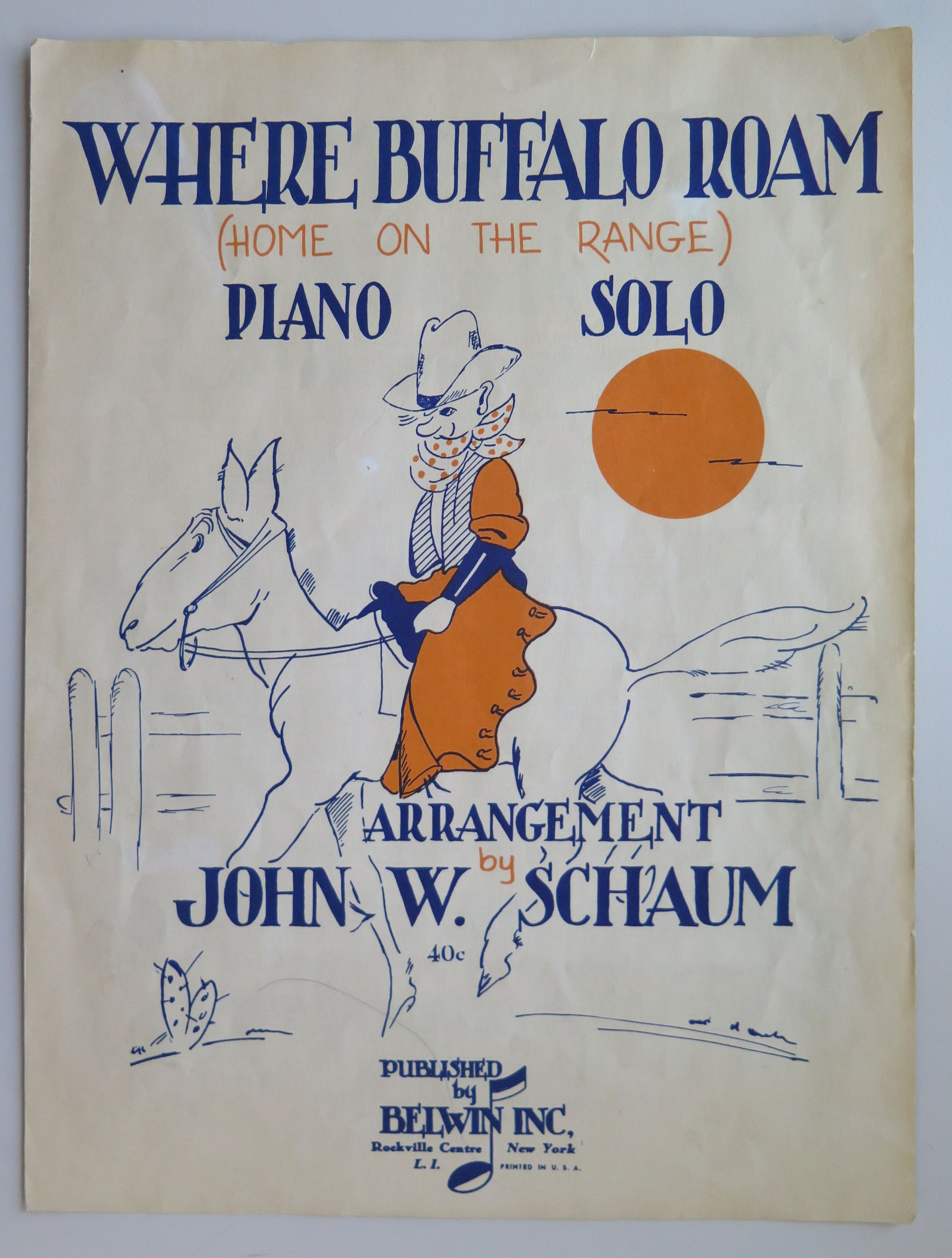 music, "Where Buffalo Roam". Arrangement by John W. Schaum. Music in good condition. Binding intact. No stains. Writting on the music. Red star sticker at the start of the music.