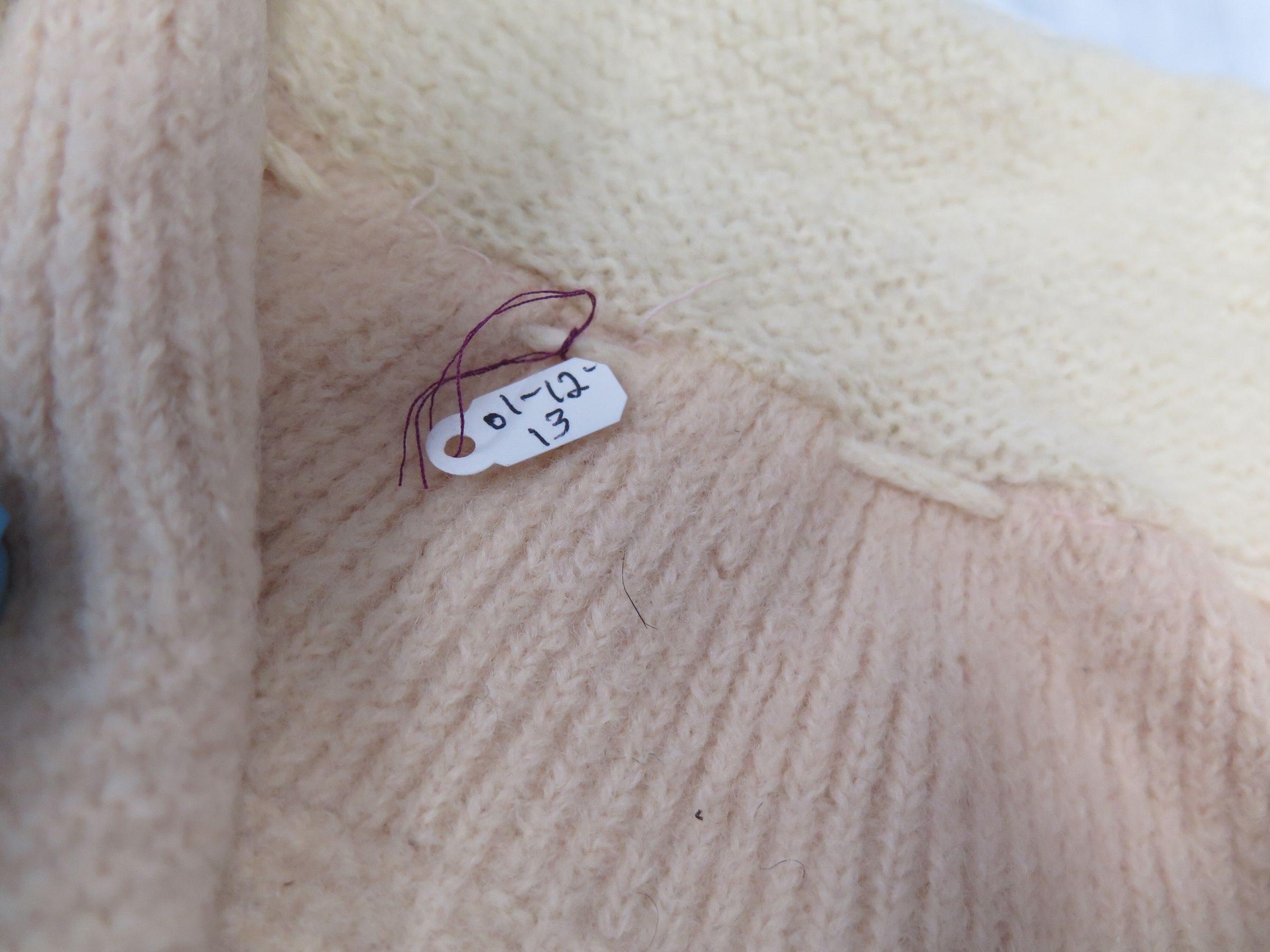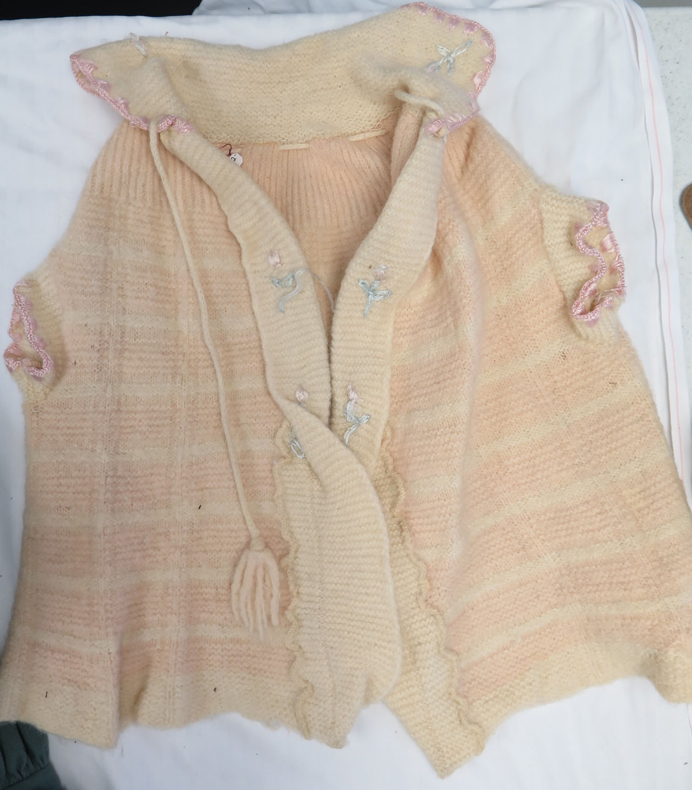 This is a pink and white striped knit child's sweater. There is pink trim along the sleeves and collar. There are tassels coming from the collar and pink flowers with greenish blue leaves embroidered along the collar. The collar is white. Sweater measures 10" (w) x 17" (l).