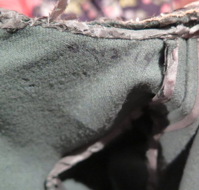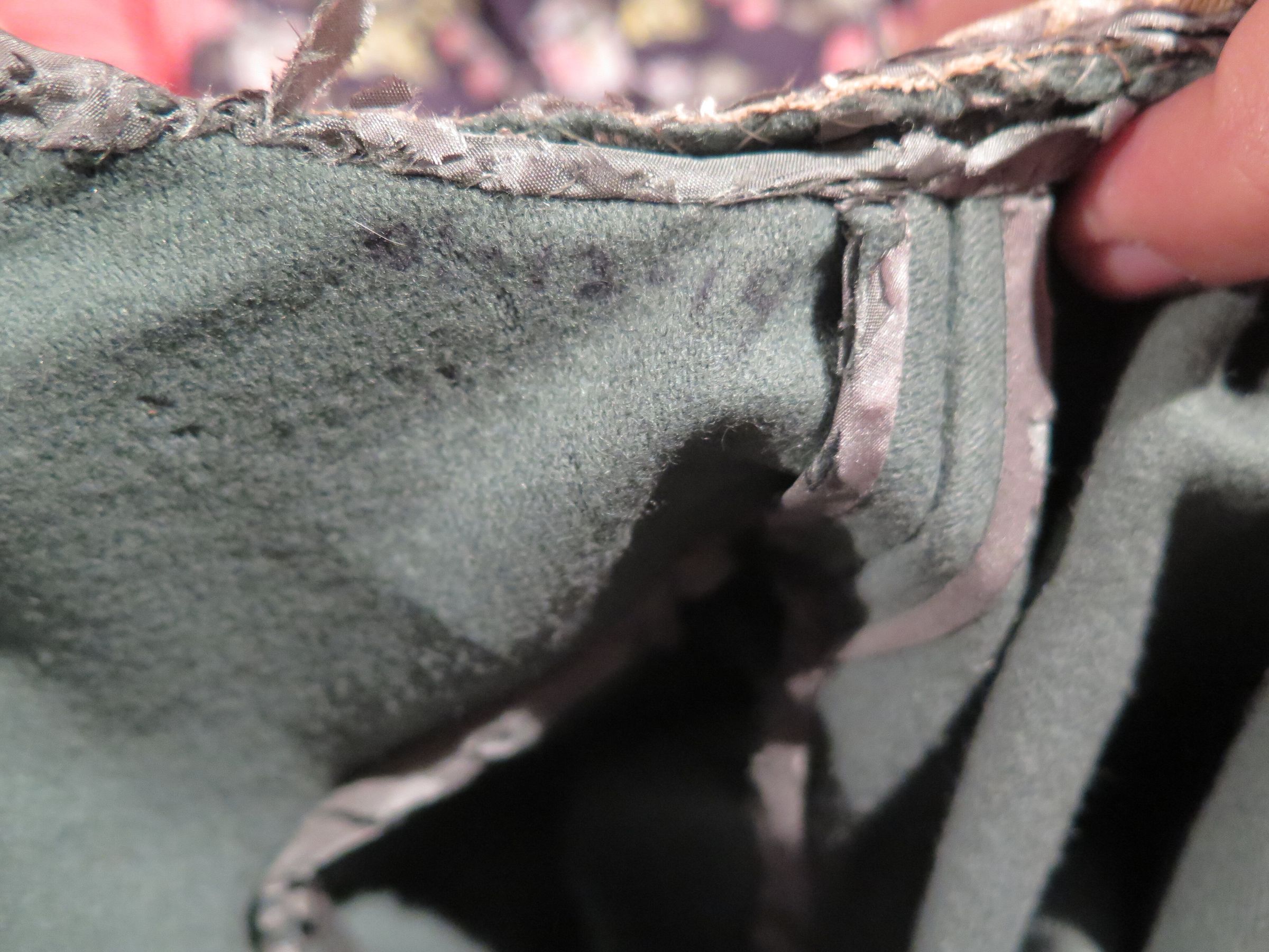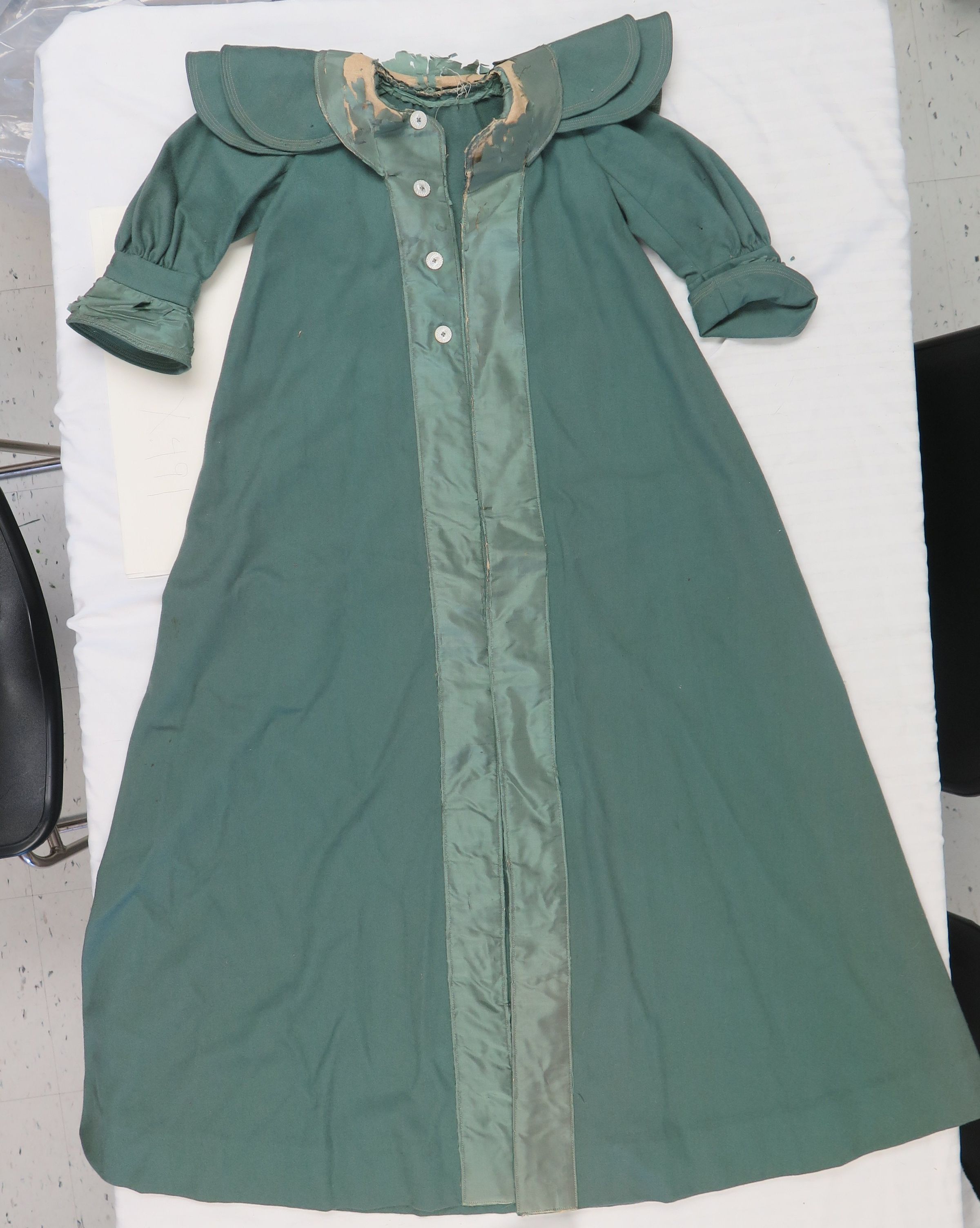 Green wool child's coat. There is a satin stripe down the front of the coat. The cuffs and collar are a shattered silk. There are 4 white buttons starting at the top of the neckline running down. The shoulders have mutliple layers coming off the collar, making them pointy. The coat measures 10" (w) x 40" (l).Collection