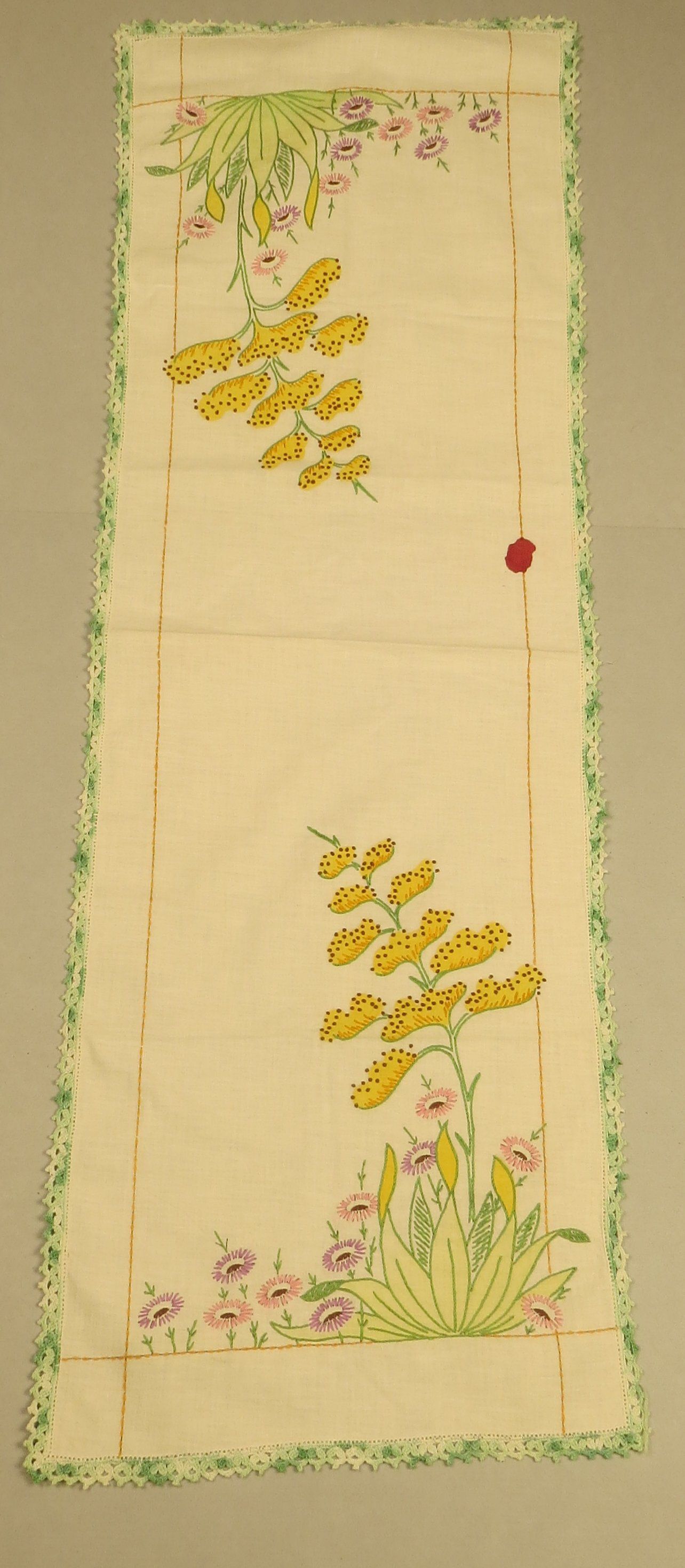 White table runner wtih a colorful floral design at the end of each side. The edges of the table runner are a green and scalloped. Table Runner measures 12" (w) x 40" (l).