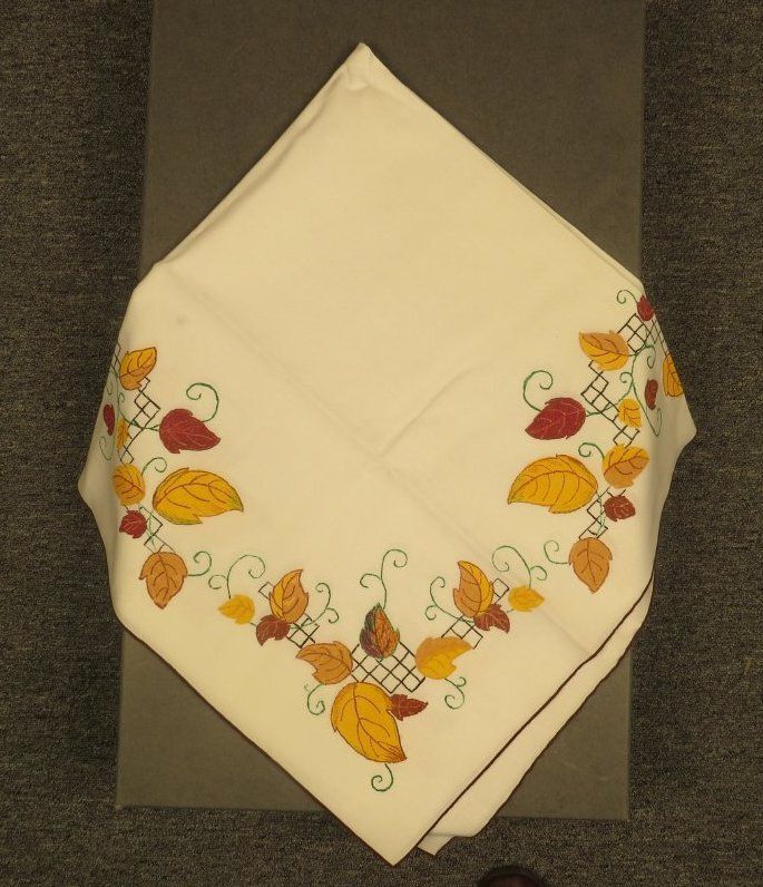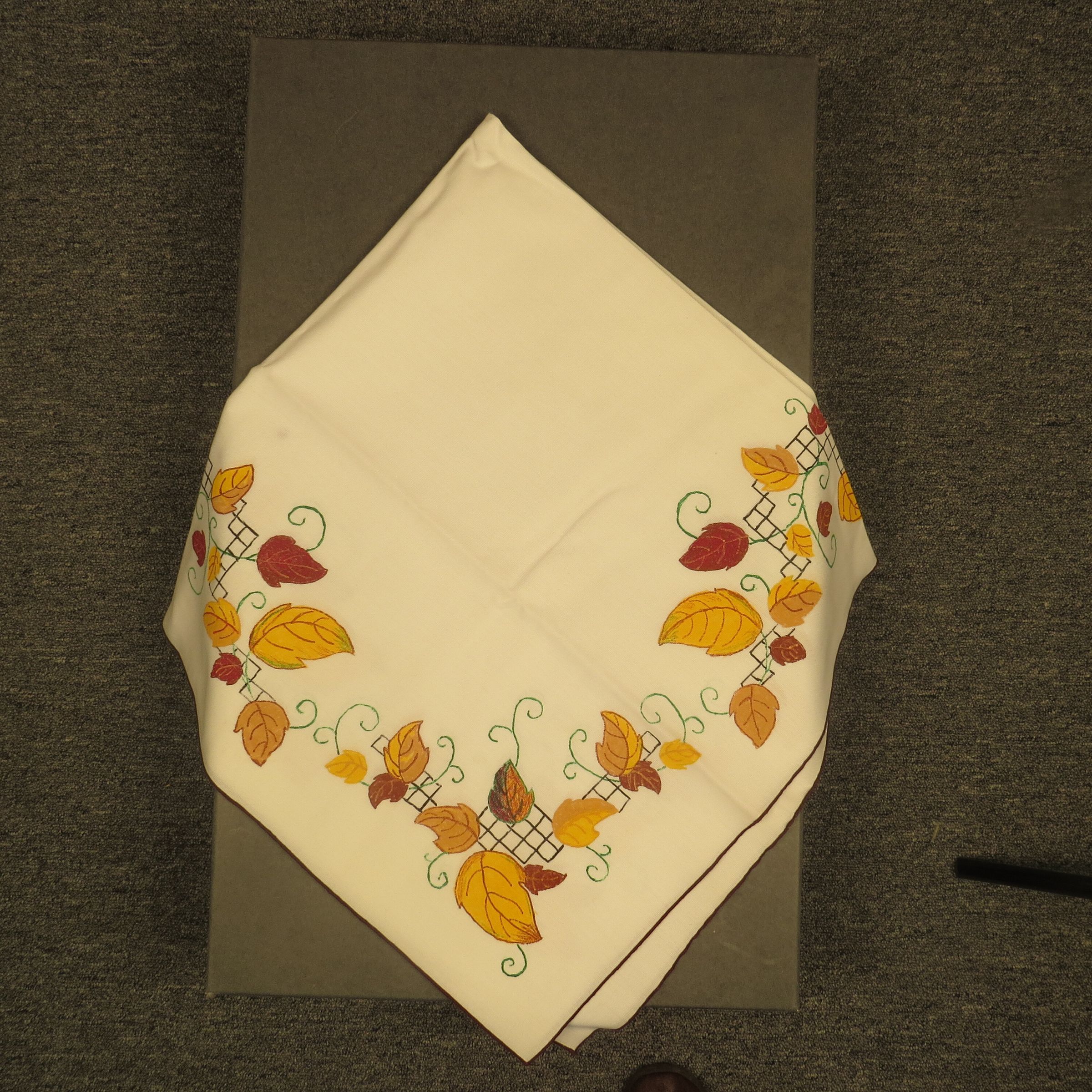 White tablecloth wtih a fall leaf theme. There are orange and red leaves with green accents bordering the tablecloth. Tablecloth measures 10" (w) x 11" (l).
