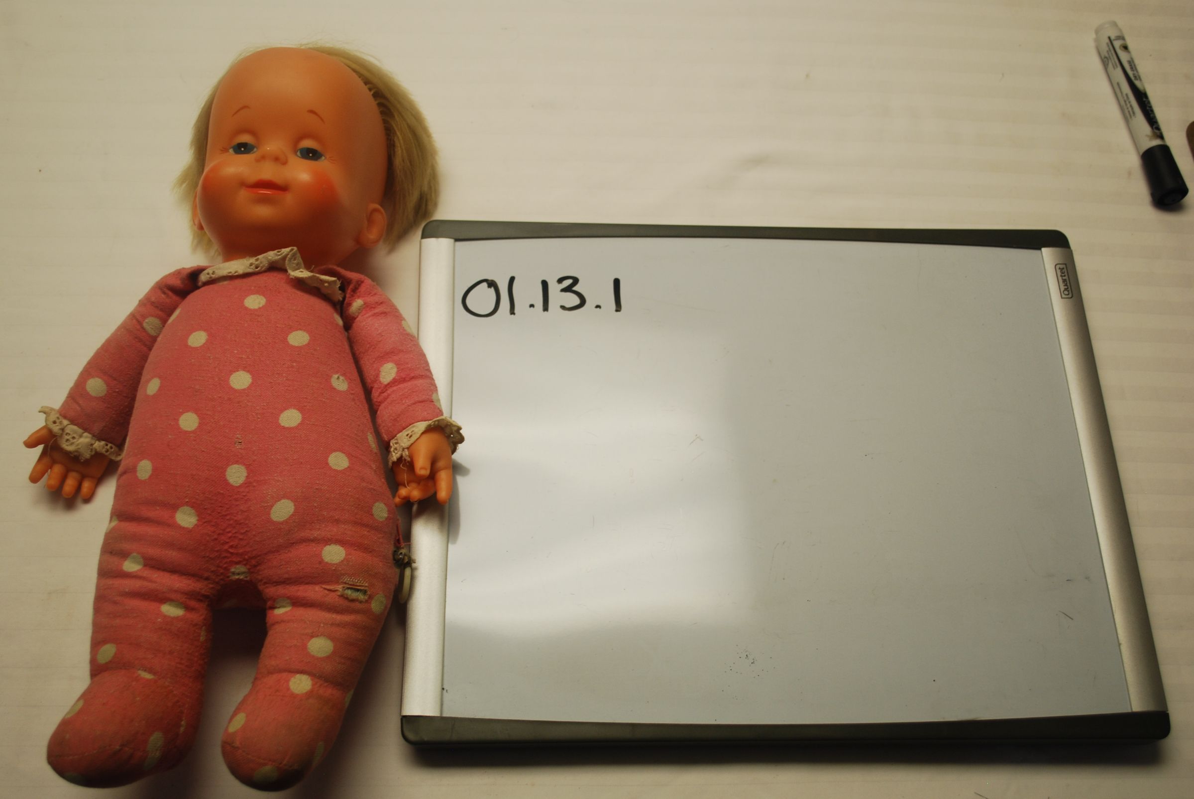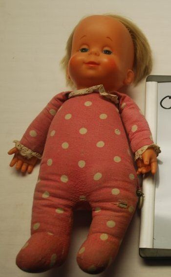 This is a plastic talking baby doll with a cloth body. The doll is wearing pink pajamas with white polka dots and white lace around the neck and wrists. The doll has a blonde wig. The doll measures 15"(h) x 8" (w) x 3" (l).Collection