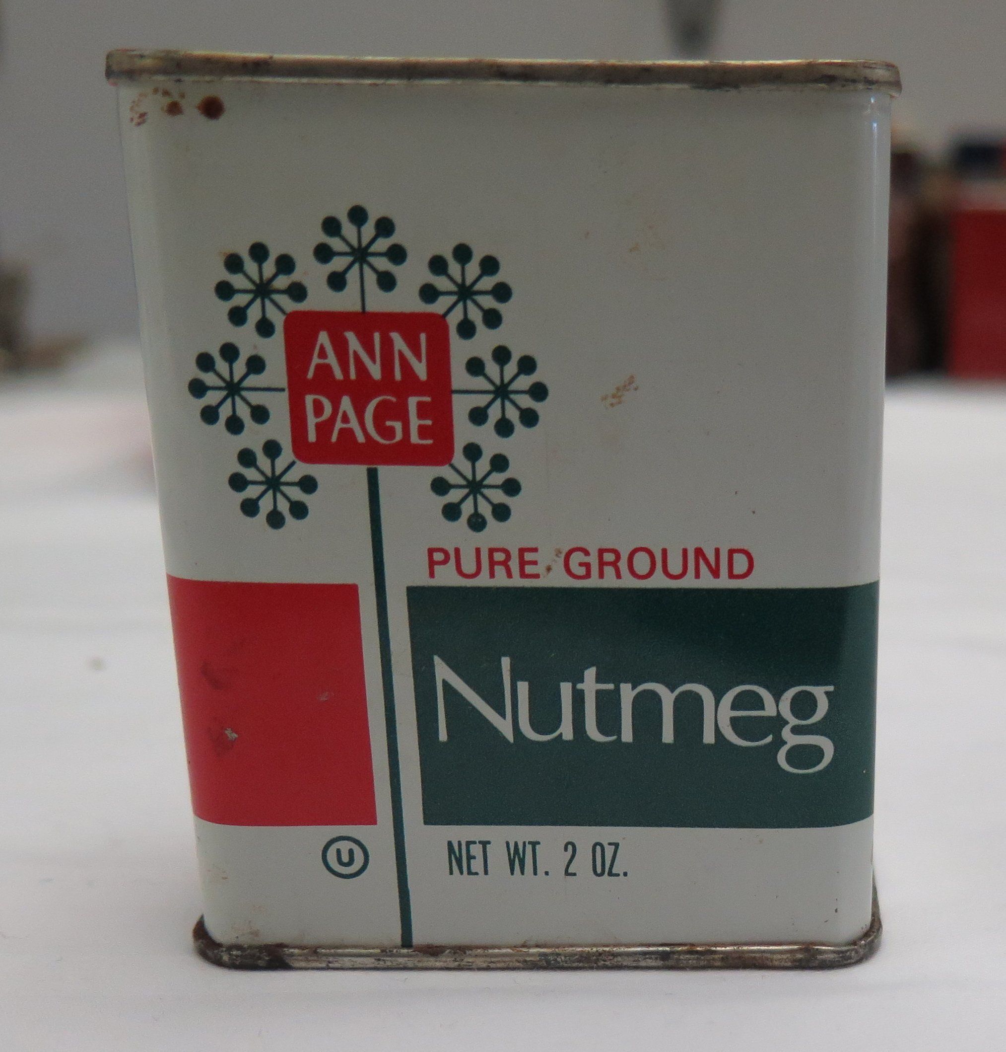 This is a rectangular metal tin of Ann Page ground nutmeg spice. The tin measures 2.75" (h) x 1.25" (w) x 1.25" (d).