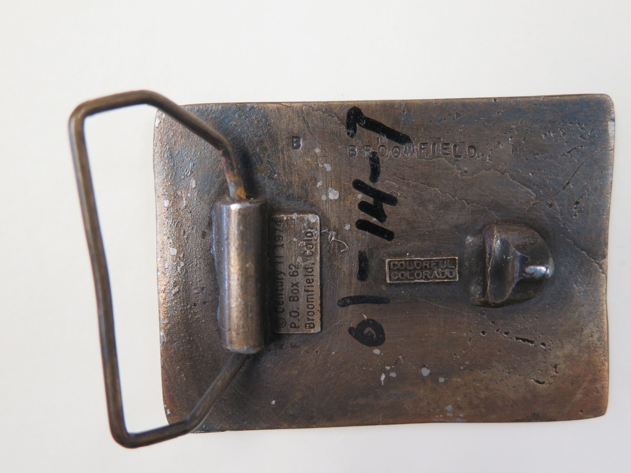 This is a brass belt buckle with the image of the Depot on it. The belt buckle has text on the front that reads, "Broomfield/ 1886 1976/ Colorado". The belt buckle measures 2.25" (h) x 3" (w) .