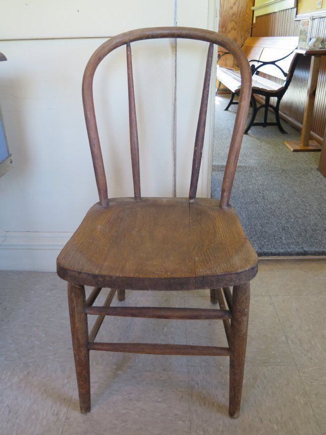 This is Mr. Crawford's oak chair. The chair has a solid seat and 2 supports on the back, with the center one missing. The back of the chair is rounded. The chair measures 34" (h) x 16" (w) x 14" (d).
