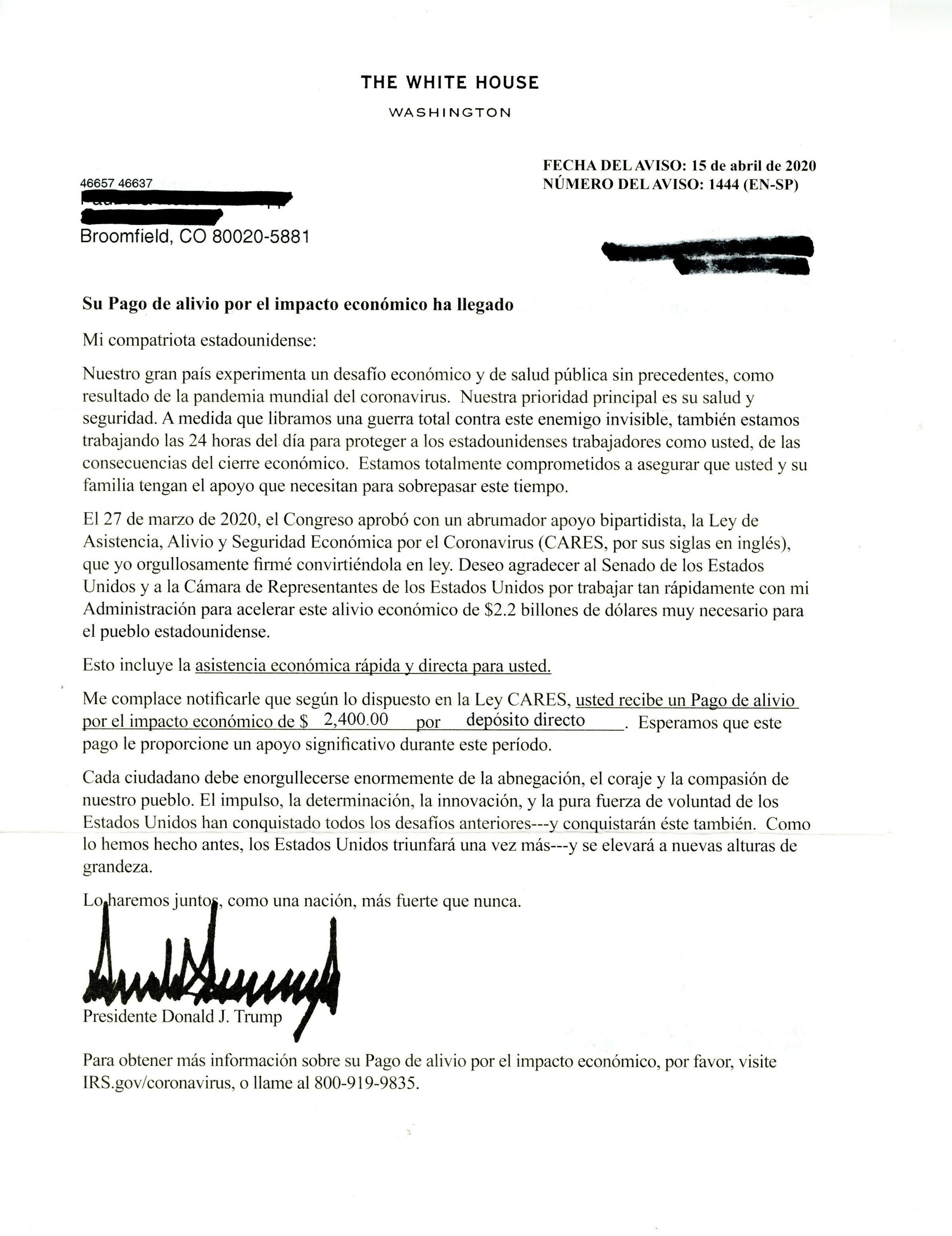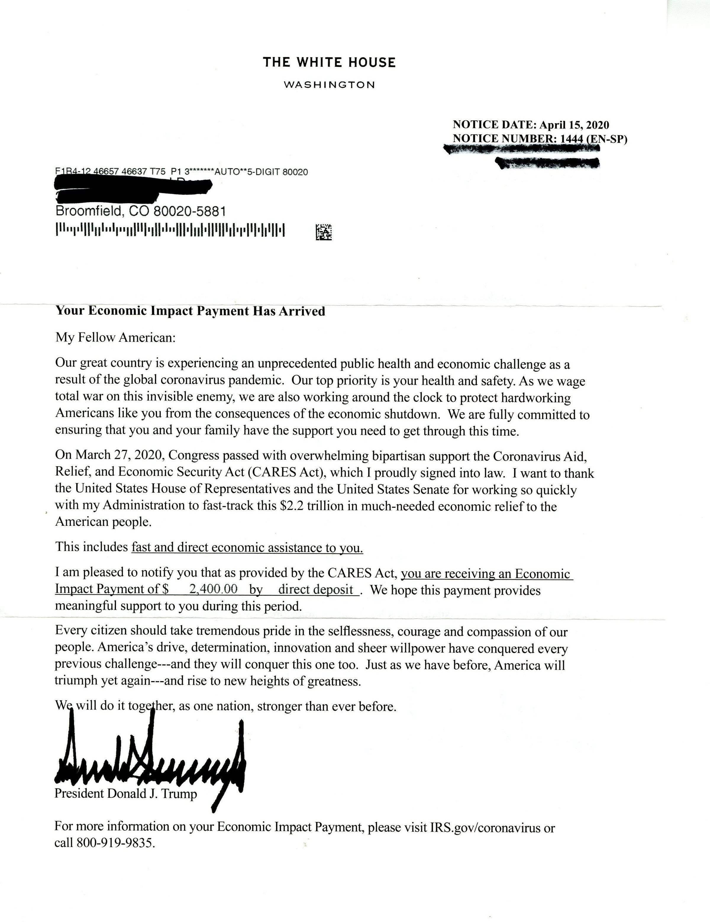 Letter, "Your Economic Impact Payment Has Arrived," from President Donald J. Trump, April 15, 2020. This letter notified that American citizens would be getting a stimulus payment of $1200 per person, $2.2 trillion in total economic releif as part of the 2020 CARES Act to protect citizens from the economic shutdown as a result of COVID-19.Collection