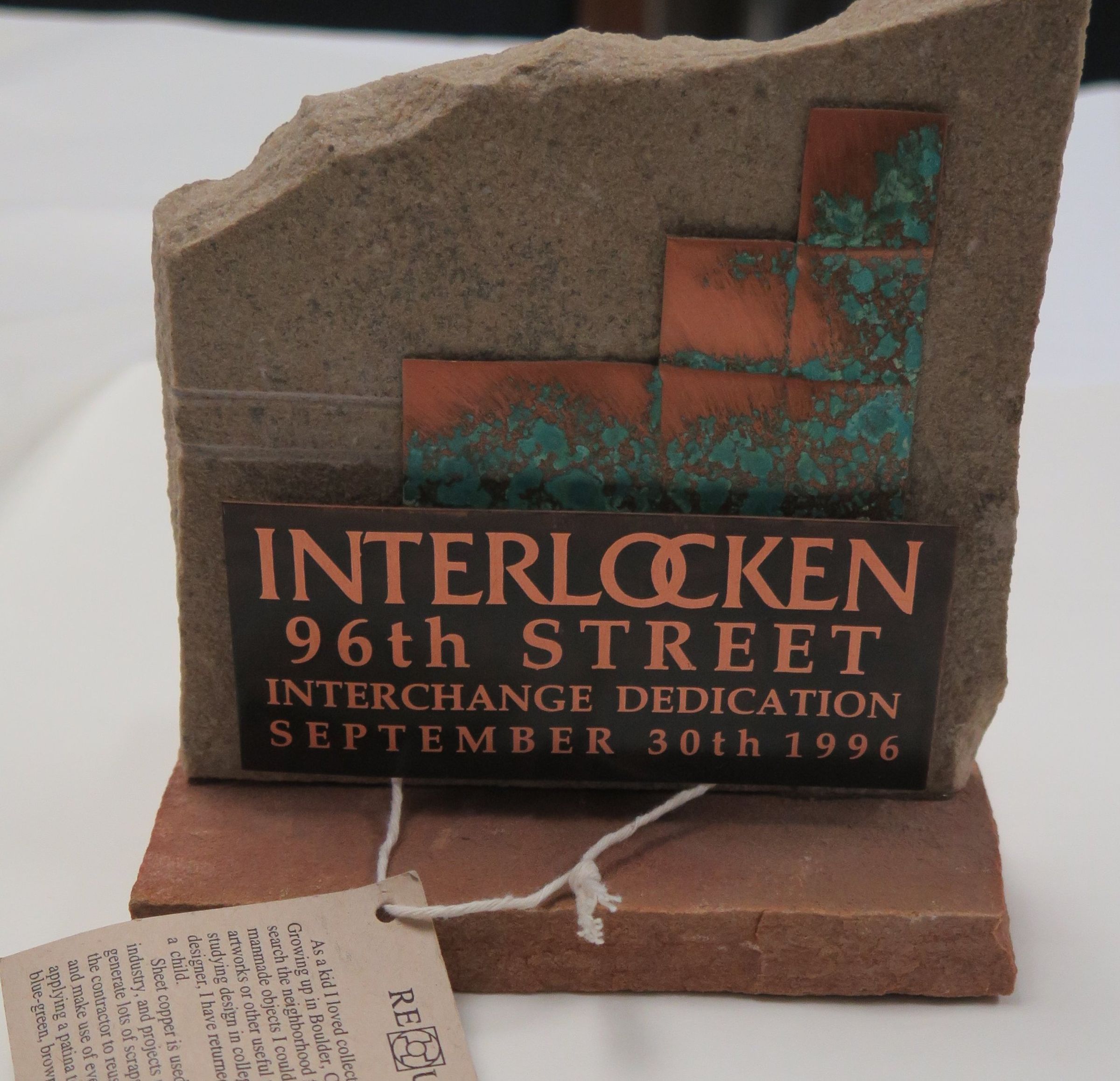 This plaque measures 6"(H) x 5.25"(W) x 3"(D). It is constructed of sandstone, granite, and metal. Text on the front of the plaque reads: "INTERLOCKEN 96th STREET INTERCHANGE DEDICATION SEPTEMBER 30TH 1996". There is a small square paper tag attached to the plaque by a string.