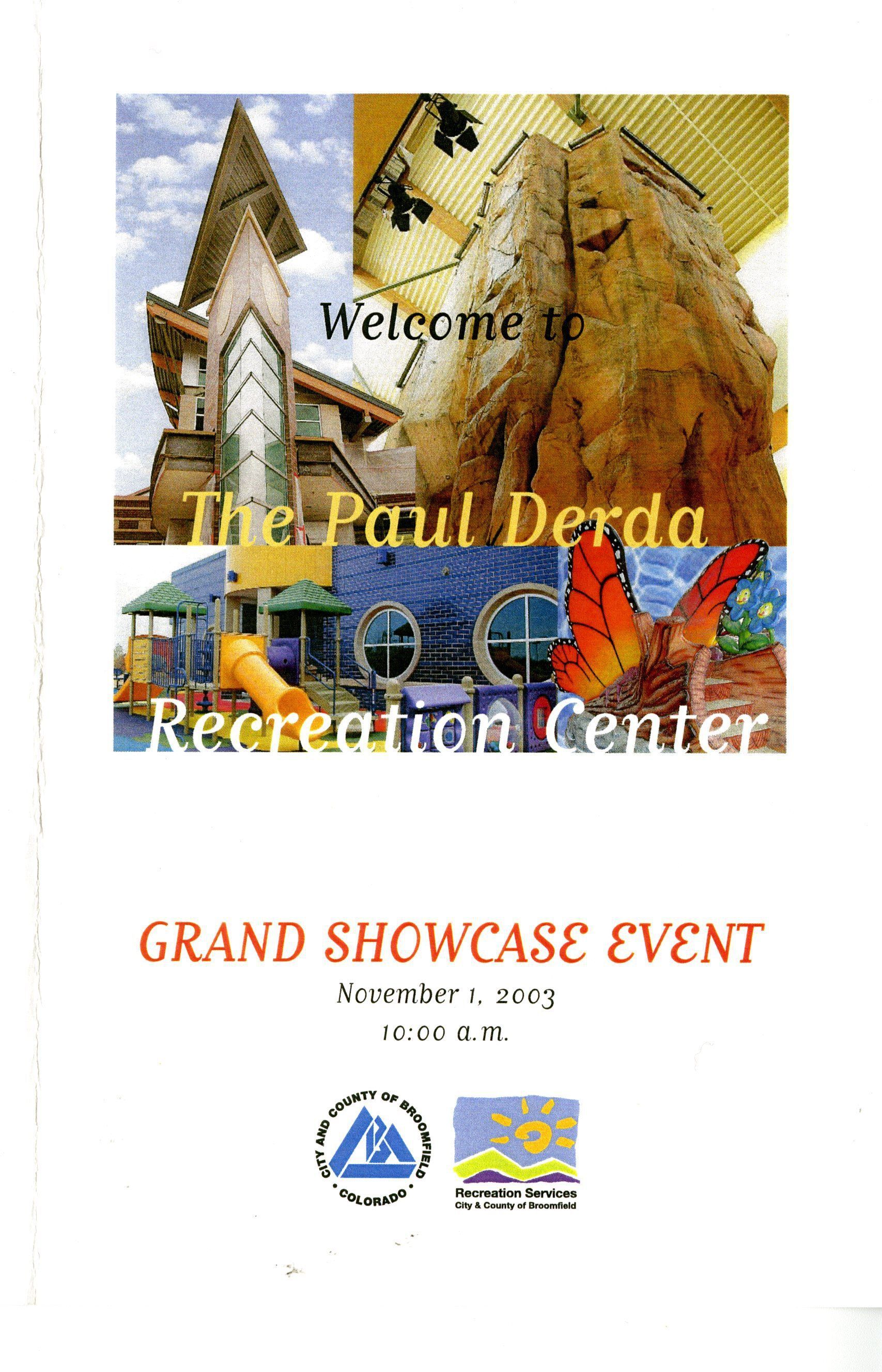 Program from the opening of the Paul Derda Recreation Center at 13201 Lowell Blvd, Broomfield, , November 3, 2003 at 10am "Grand Showcase Event." Three pieces total.