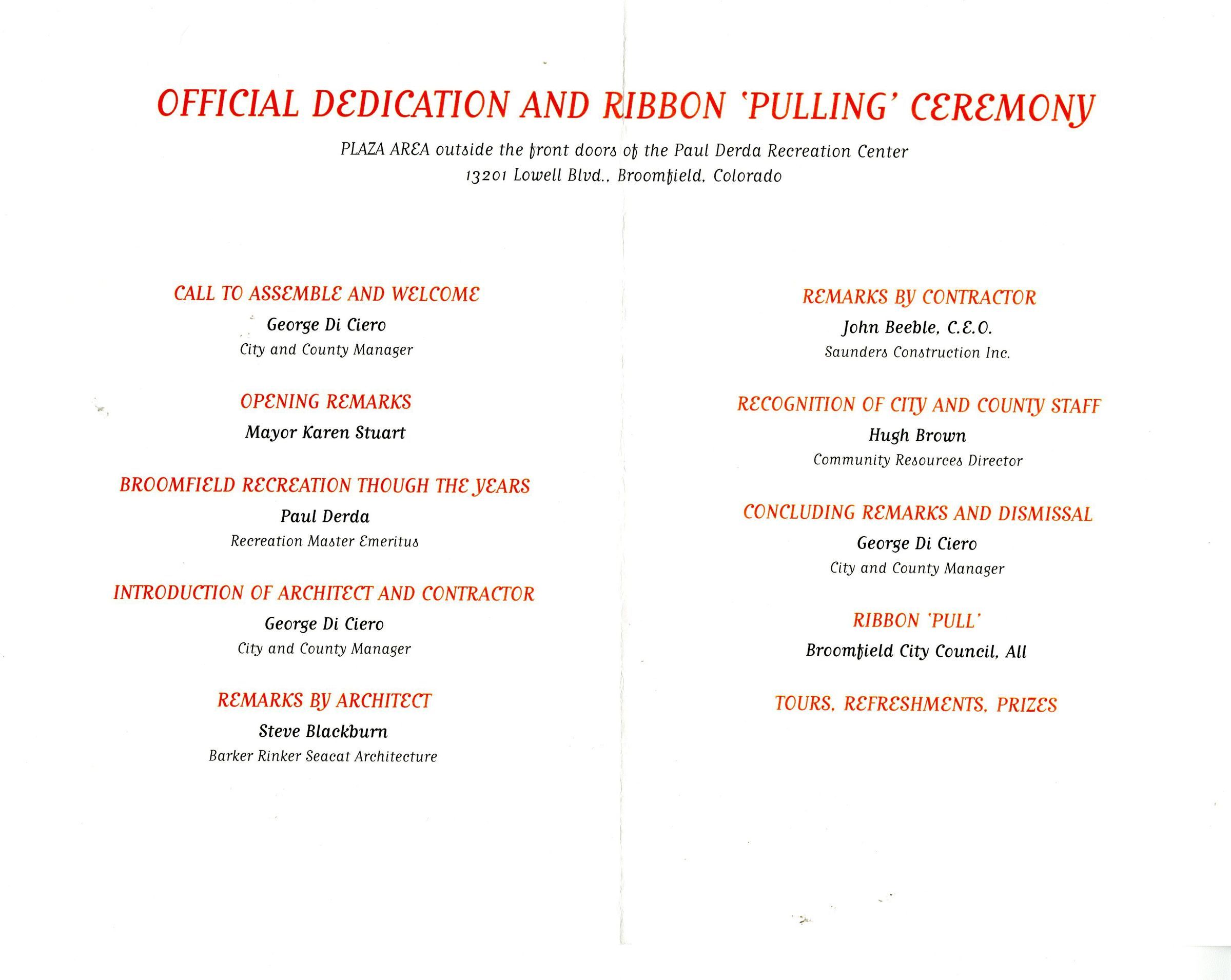 A. Folded piece of paper with images from the new rec center on cover. Inside has order of events. speakers included City and County Manager George Di Cero, Mayor Karen Stuart, Paul Derda, Steve Blackburn (architect), John Beeble (contractor), and Hugh Brown (Community Resources Director).