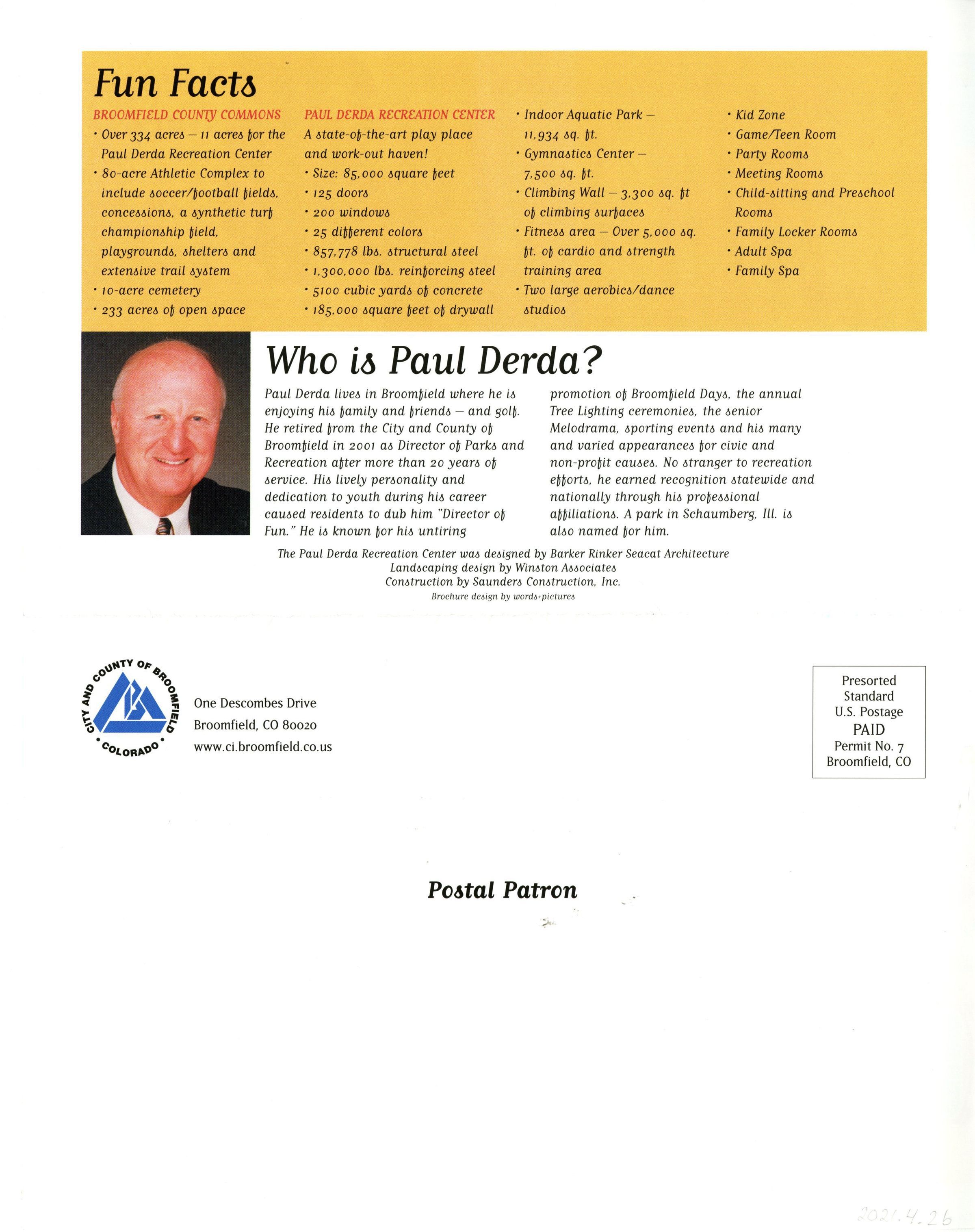 B. Folded program titled "What's Available at The Paul Derda Center." Includes photos of center, floor plan, "fun facts," and "Who is Paul Derda?" with image of Paul Derda.
