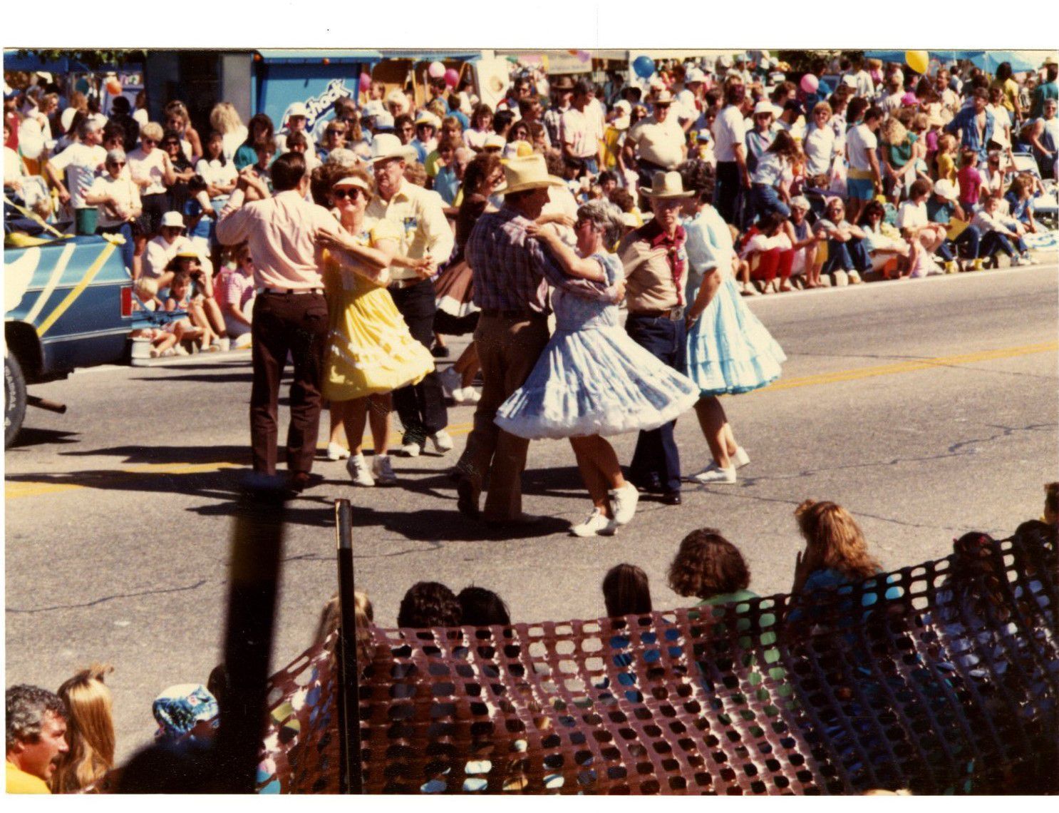 Item is a photograph printed on Kodak paper taken during the 1989 Broomfield Days event. The photo centers around the street, where crowds have gathered on both sides to watch the parade. The tail end of a blue truck is visible at the left of the photo, and behind it, men and women dance in vintage attire. Everyone seems to be enjoying themselves, and blue and white tents can be seen in the background, likely hosting other attractions.Photograph Details