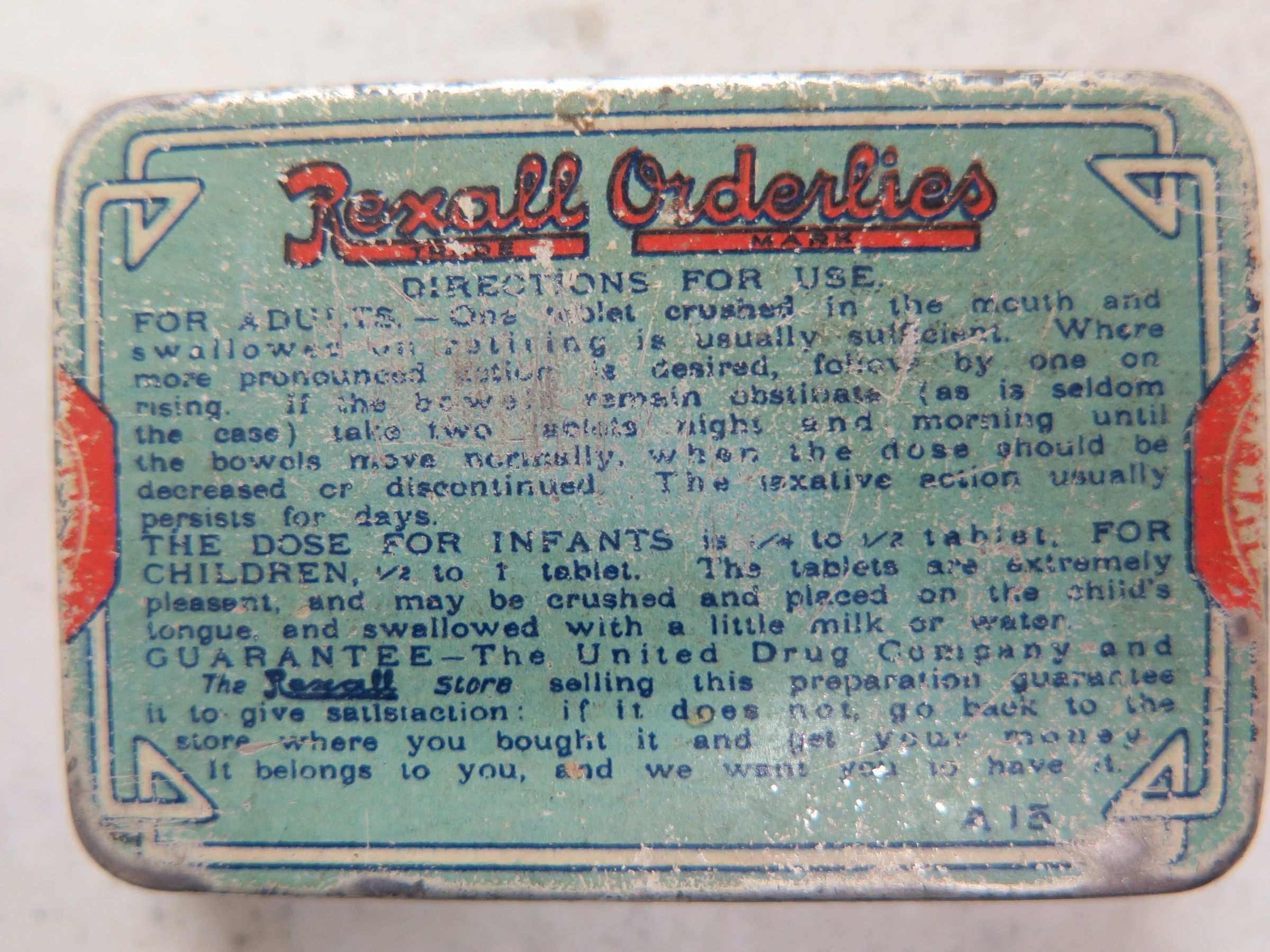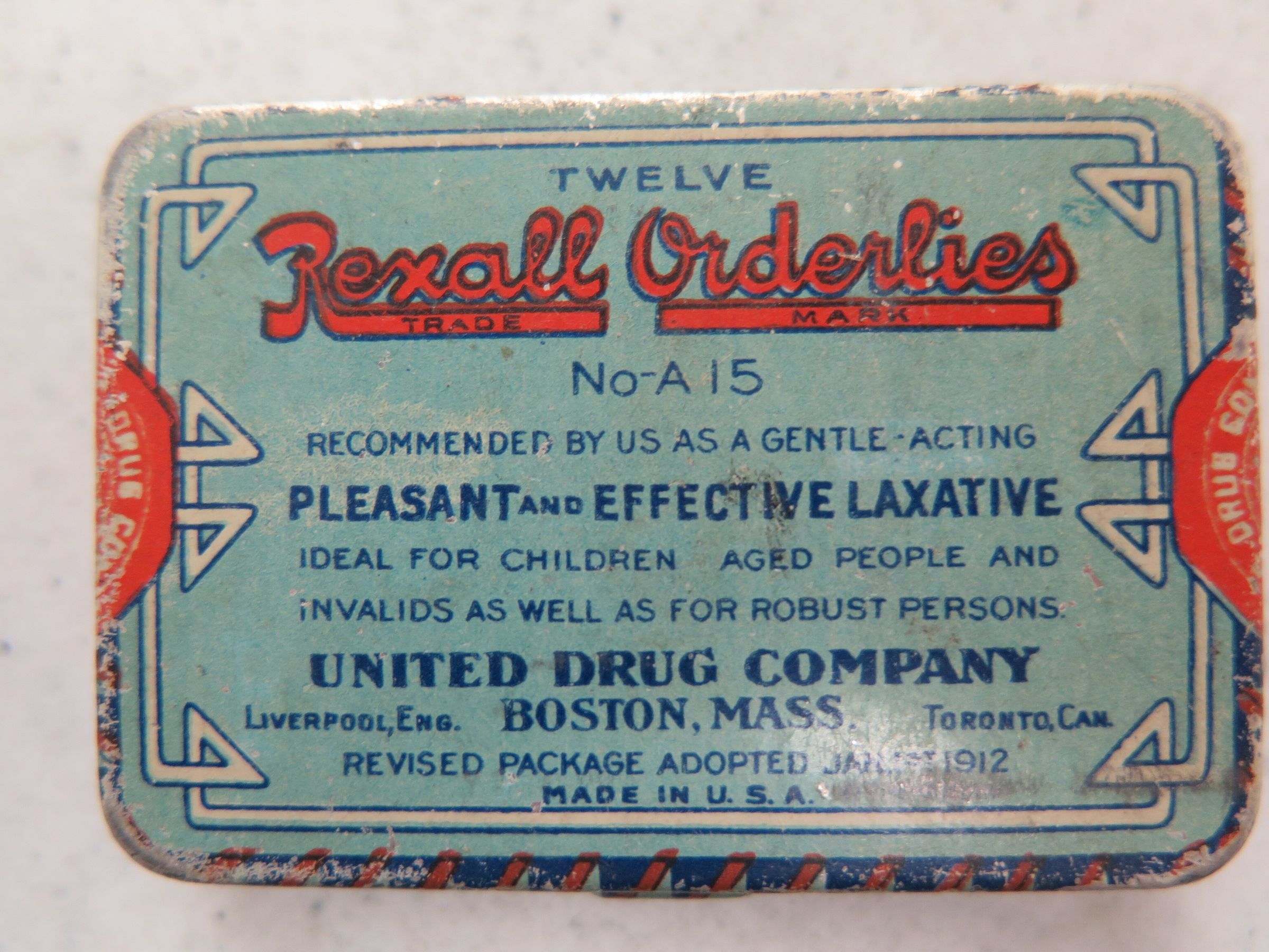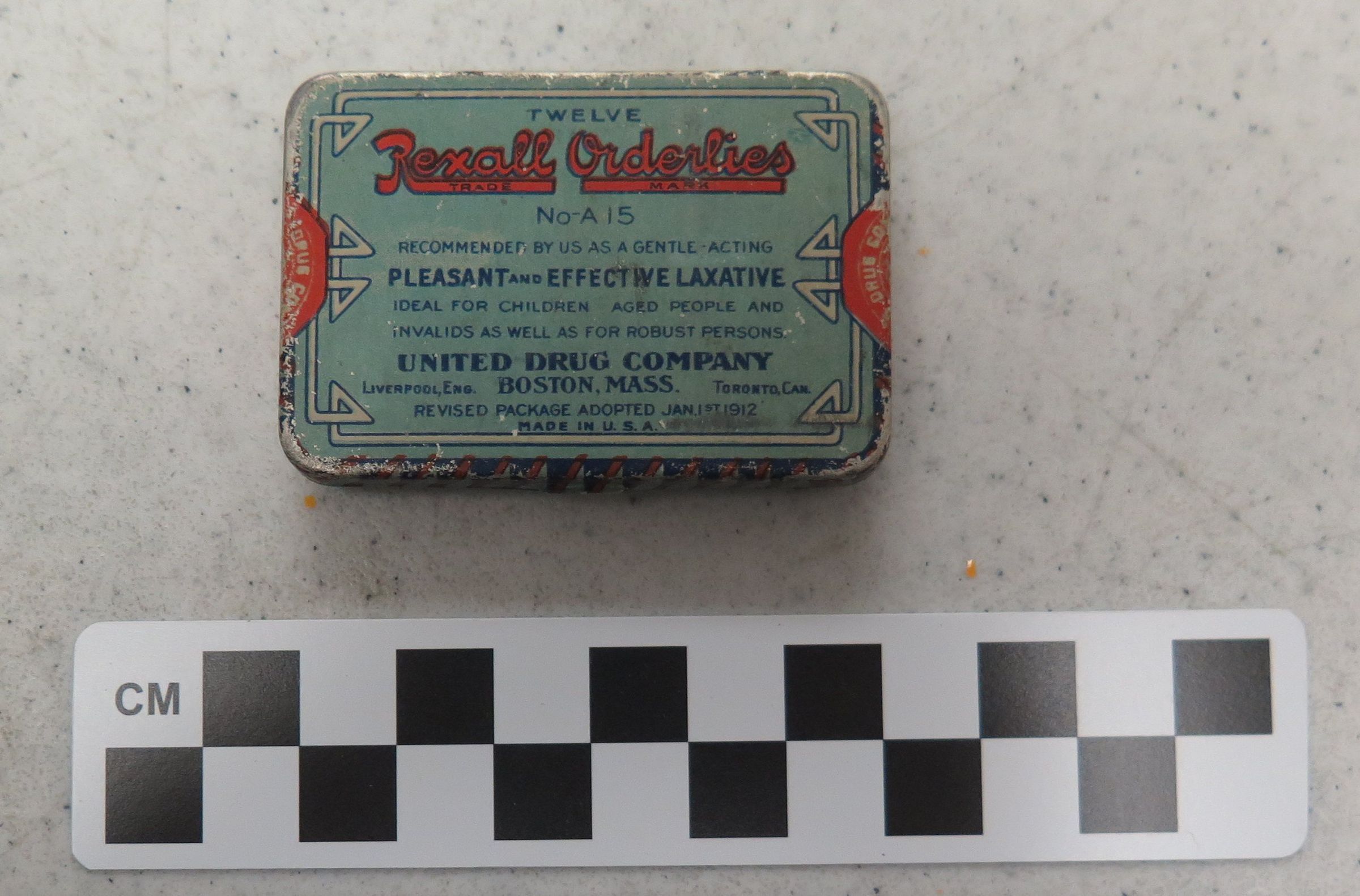 This is a metal container measuring 25"(H) x 2.25"(L) for Rexall Orderlies Laxative.