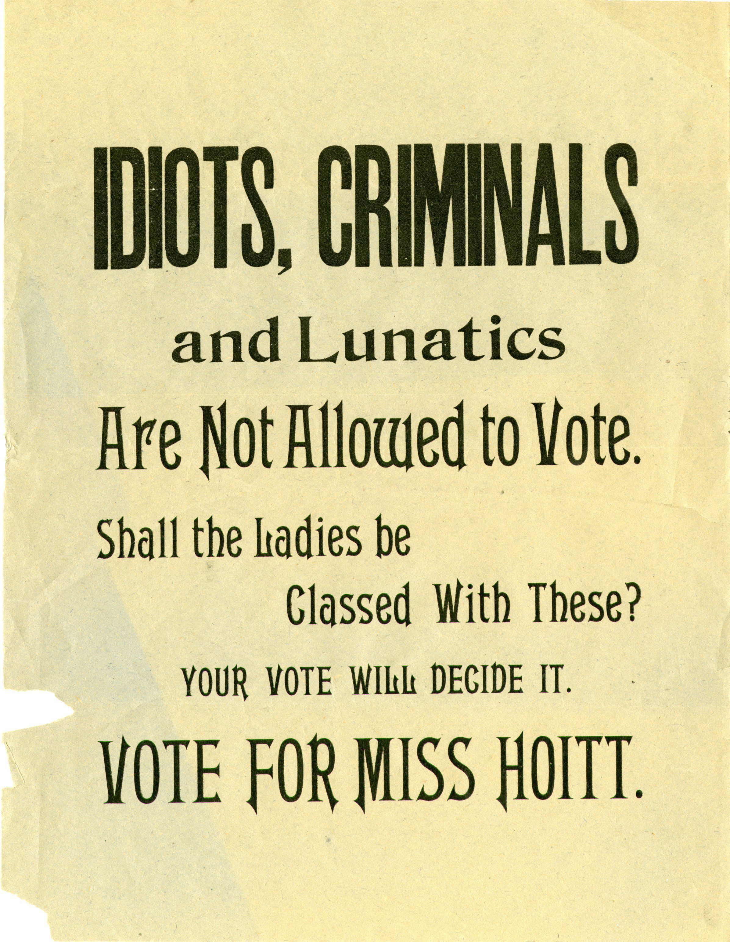 8x10in suffrage advertisement on a thin green paper saying, "Idiots, Criminals, and Lunatics are Not Allowed to Vote. Shall the Ladies be Classed with these? Your Vote will Decide it? Vote for Miss Hoitt." There are tears near the bottom left corner.Collection