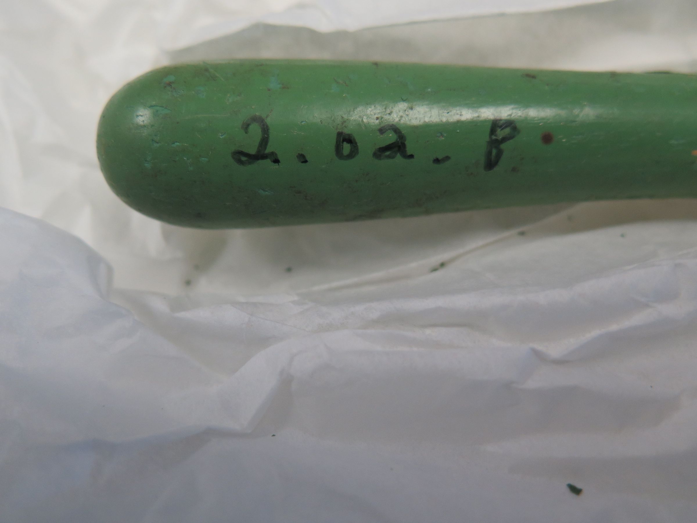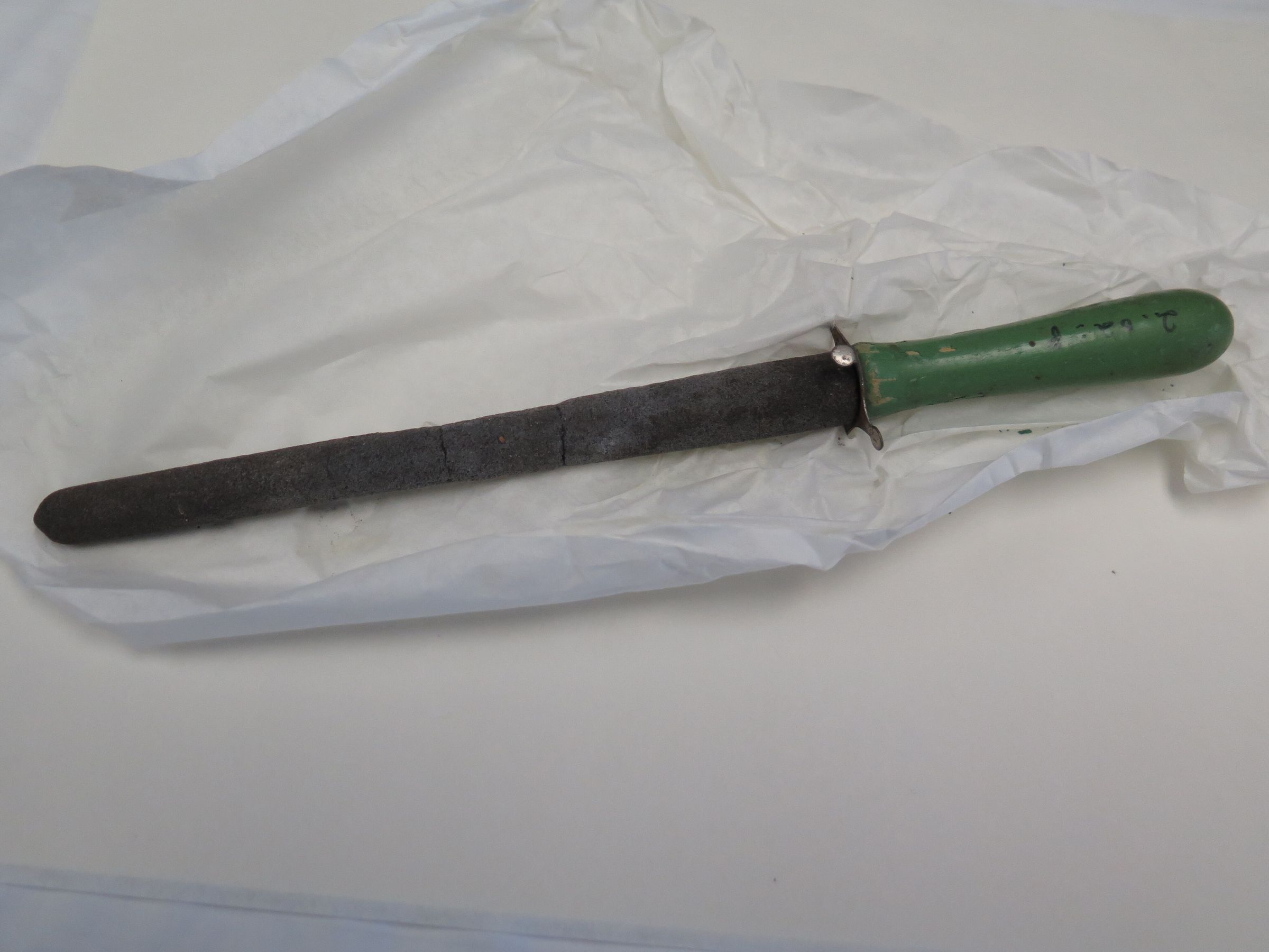 This is a metal knife sharpener with a wood handle. The metal part of the knife sharpener looks like it has cracked or broken and been repaired in several places. The handle has been painted green. The knife sharpener measures 13" (l) x 1" (dia).