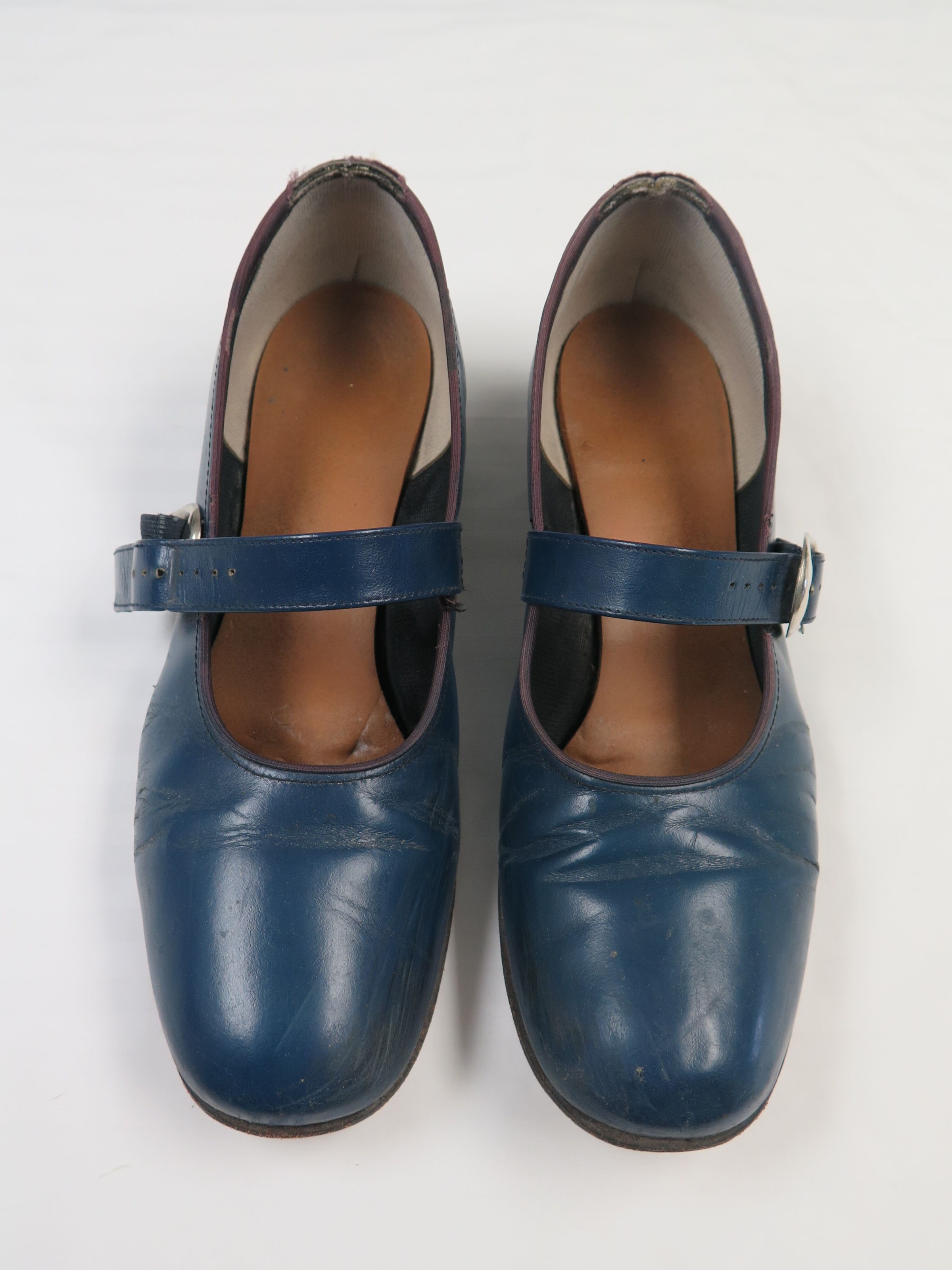 This is a pair of blue ladies shoes with a strap on the top and a small heel. The shoes each measure 3.5" (h) x 4" (w) x 10" (l).