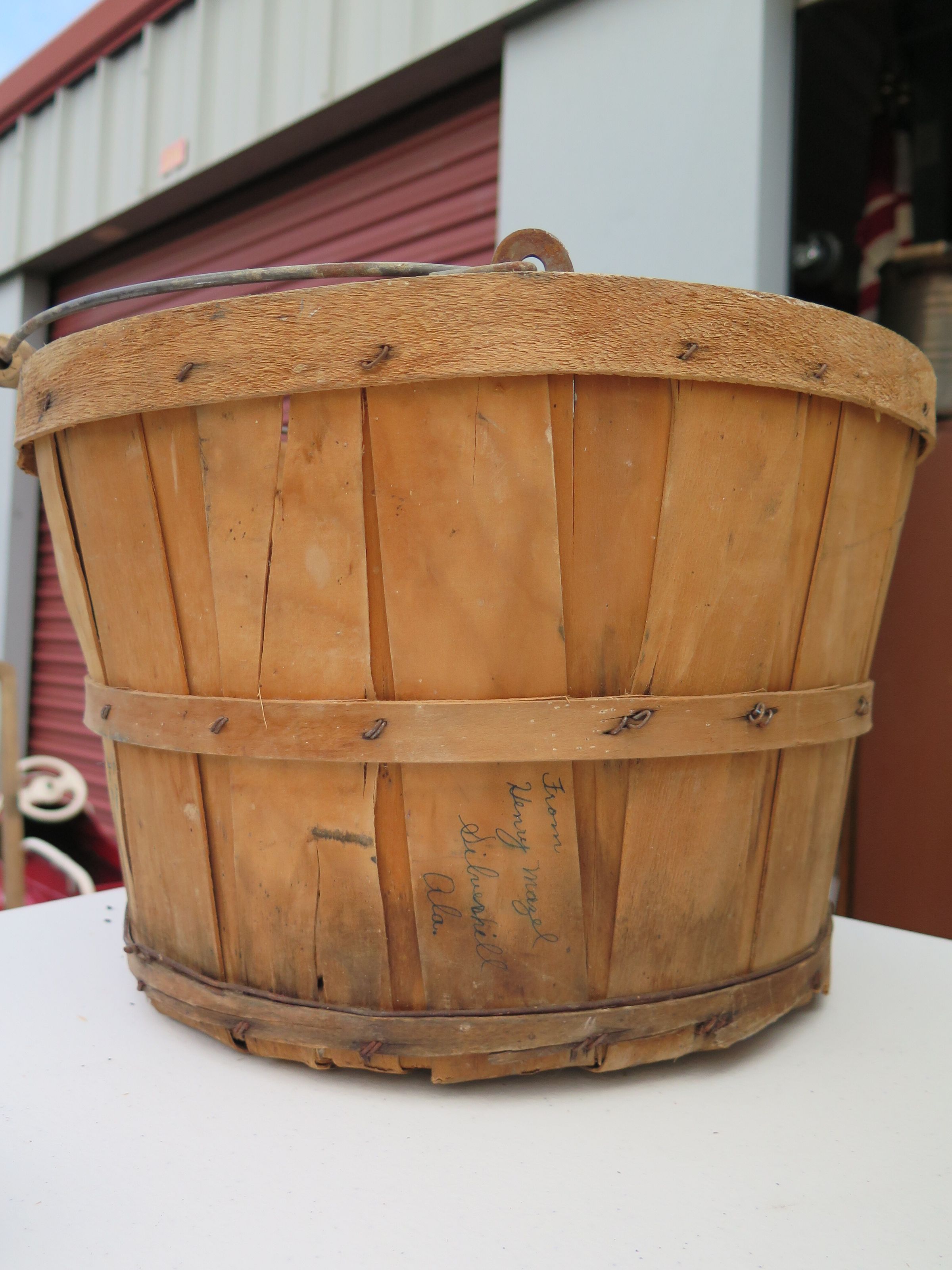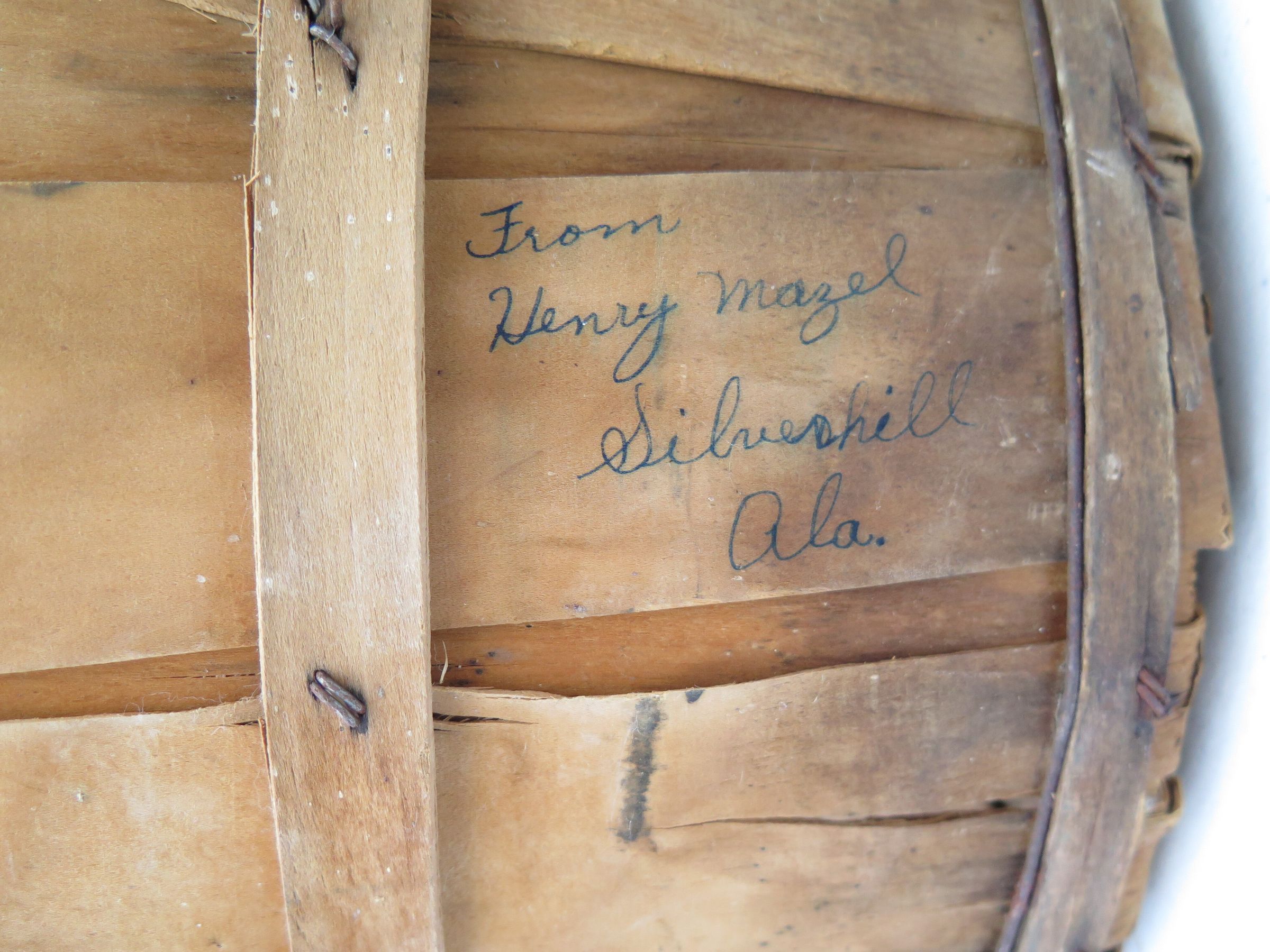 This is a bushel basket. The basket has text on the side that reads, "From/ Henry Mazel/ Silverhill/ Ala." The basket measures 9.5" (h) x 13.75" (dia).