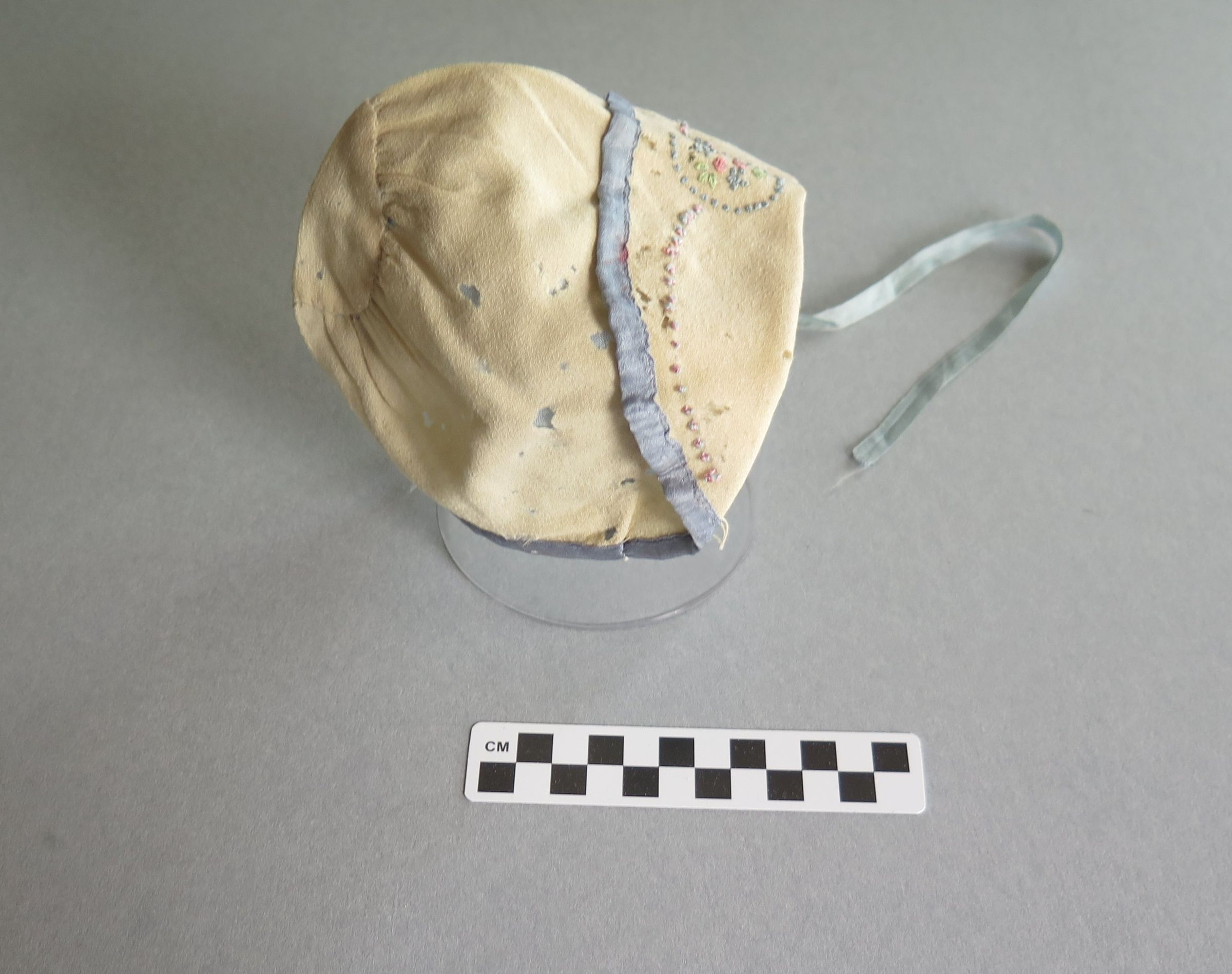 Off white baby bonnet with blue trim and blue silk interior. There are floral designs along the front top of the bonnet and one blue satin string (missing it's mate) to tie the bonnet shut under the chin. The bonnet measures 5" (w) x 5" (l).