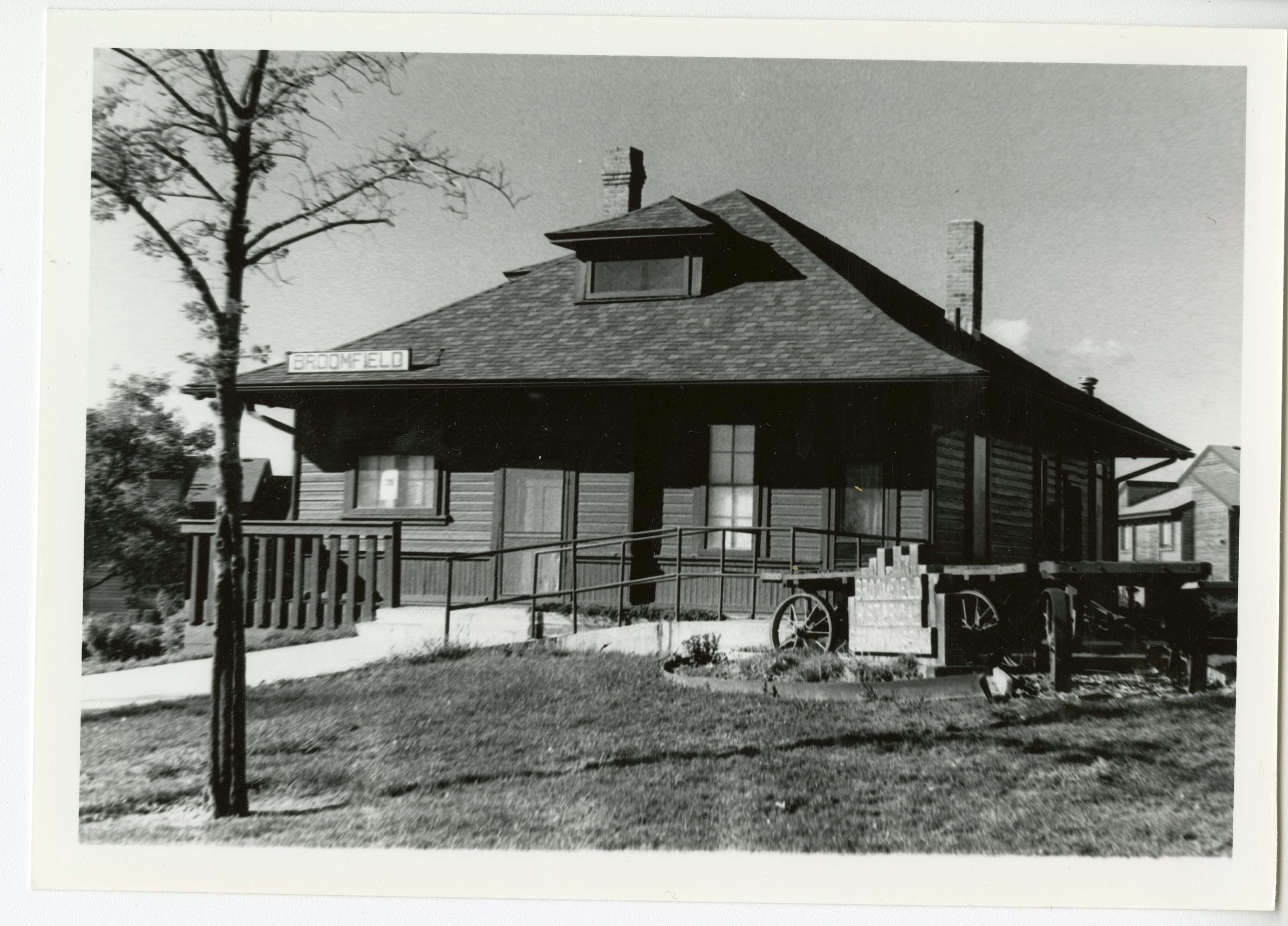Black and white photo of the Broomfield Depot Museum circa 1993 showing building and landscaping facing west towards the front entrance. Photo shows dark siding, shingled hip roof, two chimneys, a dormer, and flat bed wagons.