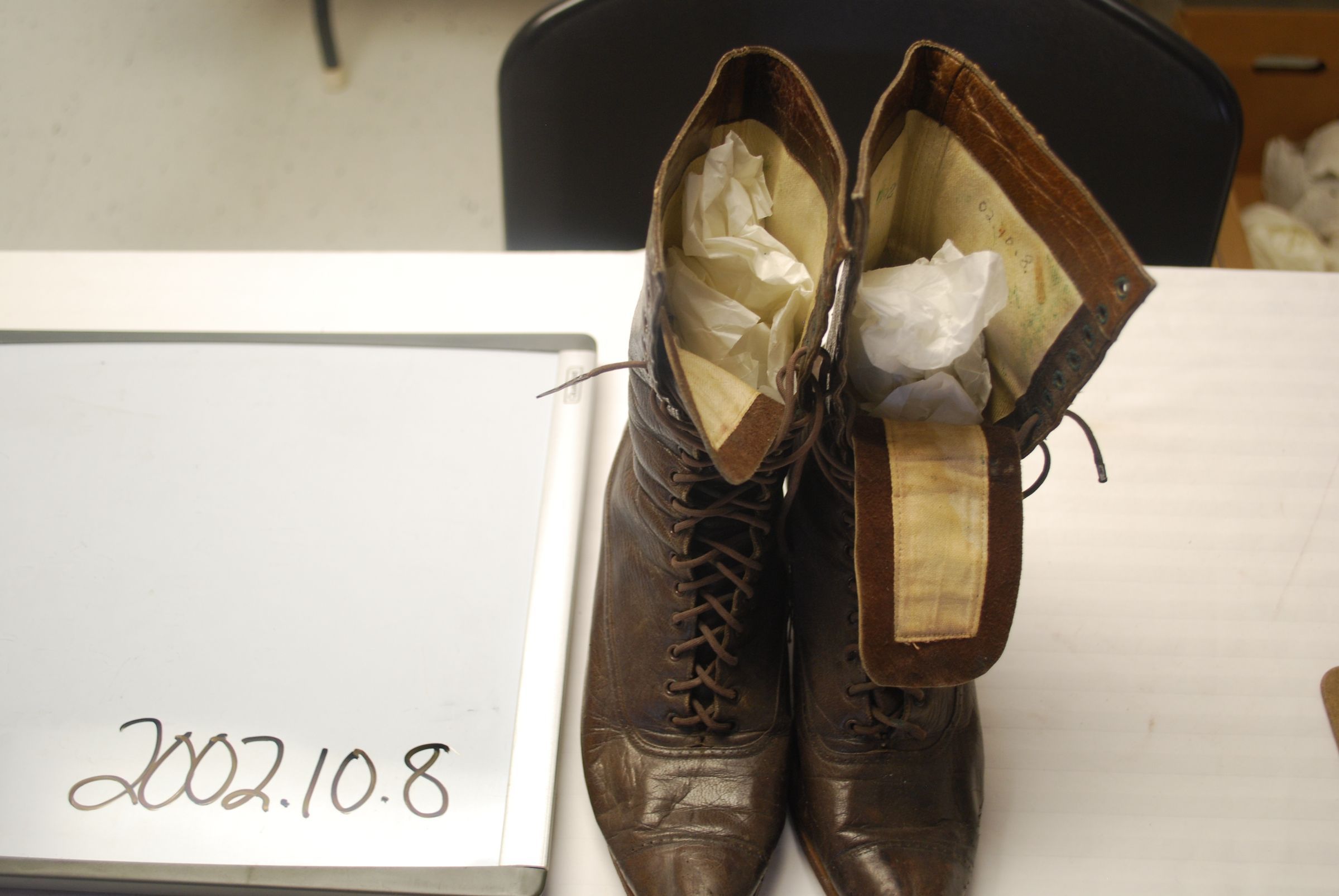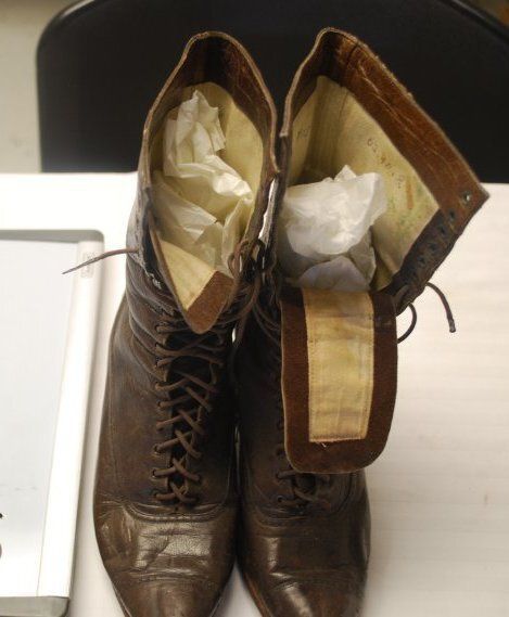 This is a pair of women's brown leather high top shoes with laces. The toes of the shoes are pointed. They are both very worn. The shoes each measure 9.75" (h) x 3"(w) x 9.5".
