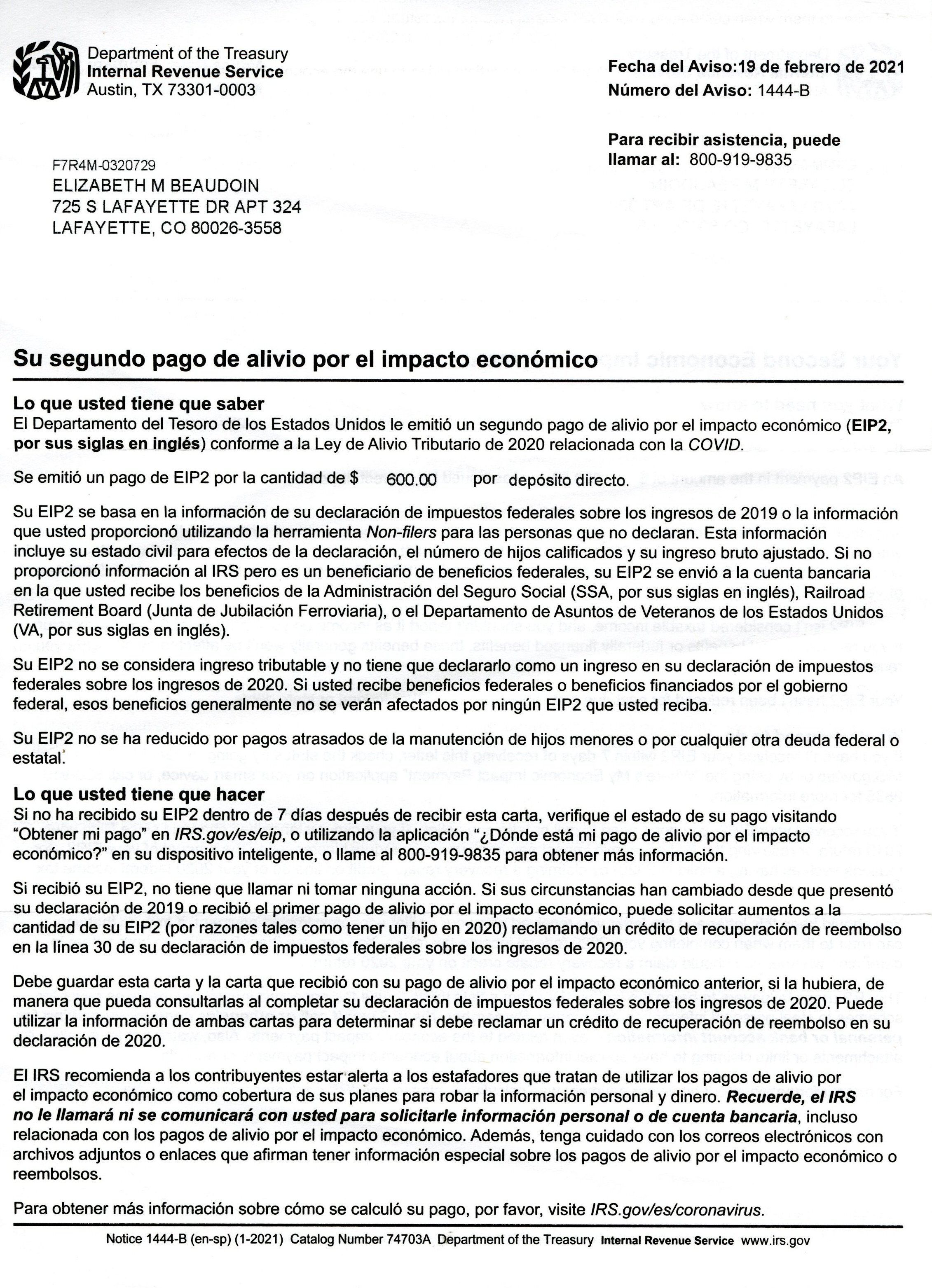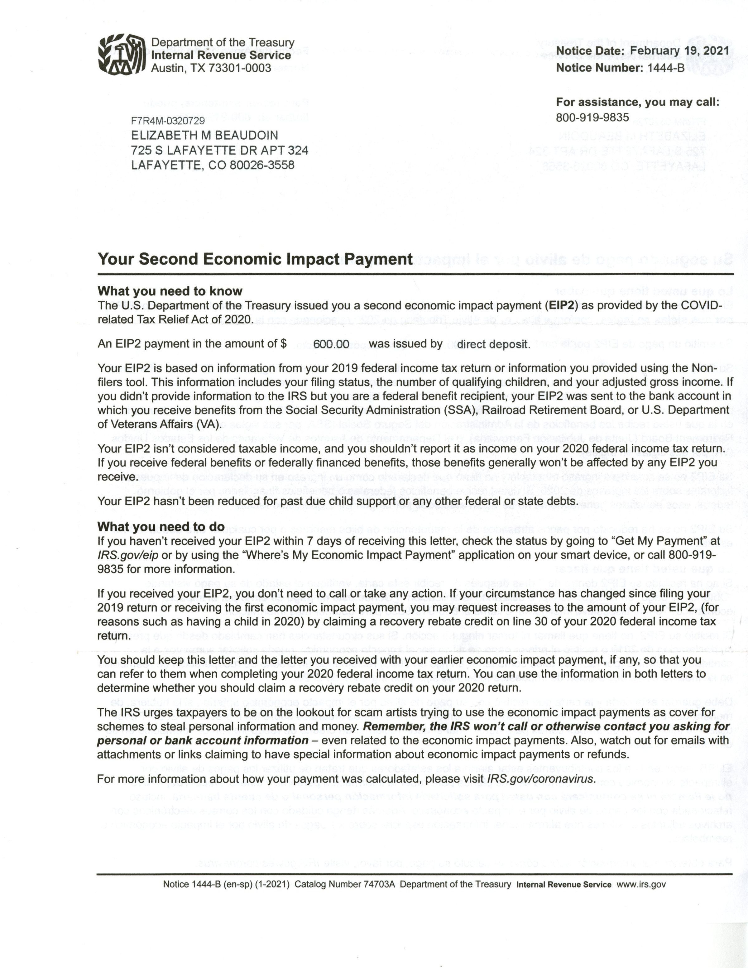 Second Economic Impact Payment Notification Letter
