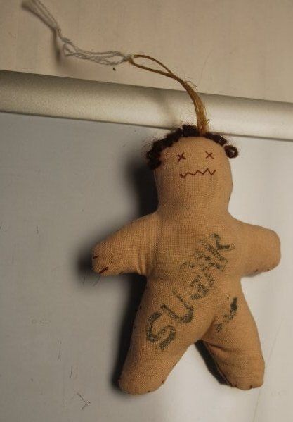This is a cloth Christmas Tree Ornament that looks like a gingerbread man. The ornament has x eyes, hair, and a mouth. The word "SUGAR" is stamped across the front. The ornament measures 4.25" (h) x 3.5" (w)x 1" (d) .