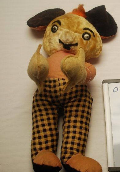 This is a handmade stuffed animal, probably a mouse. It has checkered pants and bright orange hair. The stuffed mouse measuers 23" (h) x 13"(w) x 10" (d).Collection