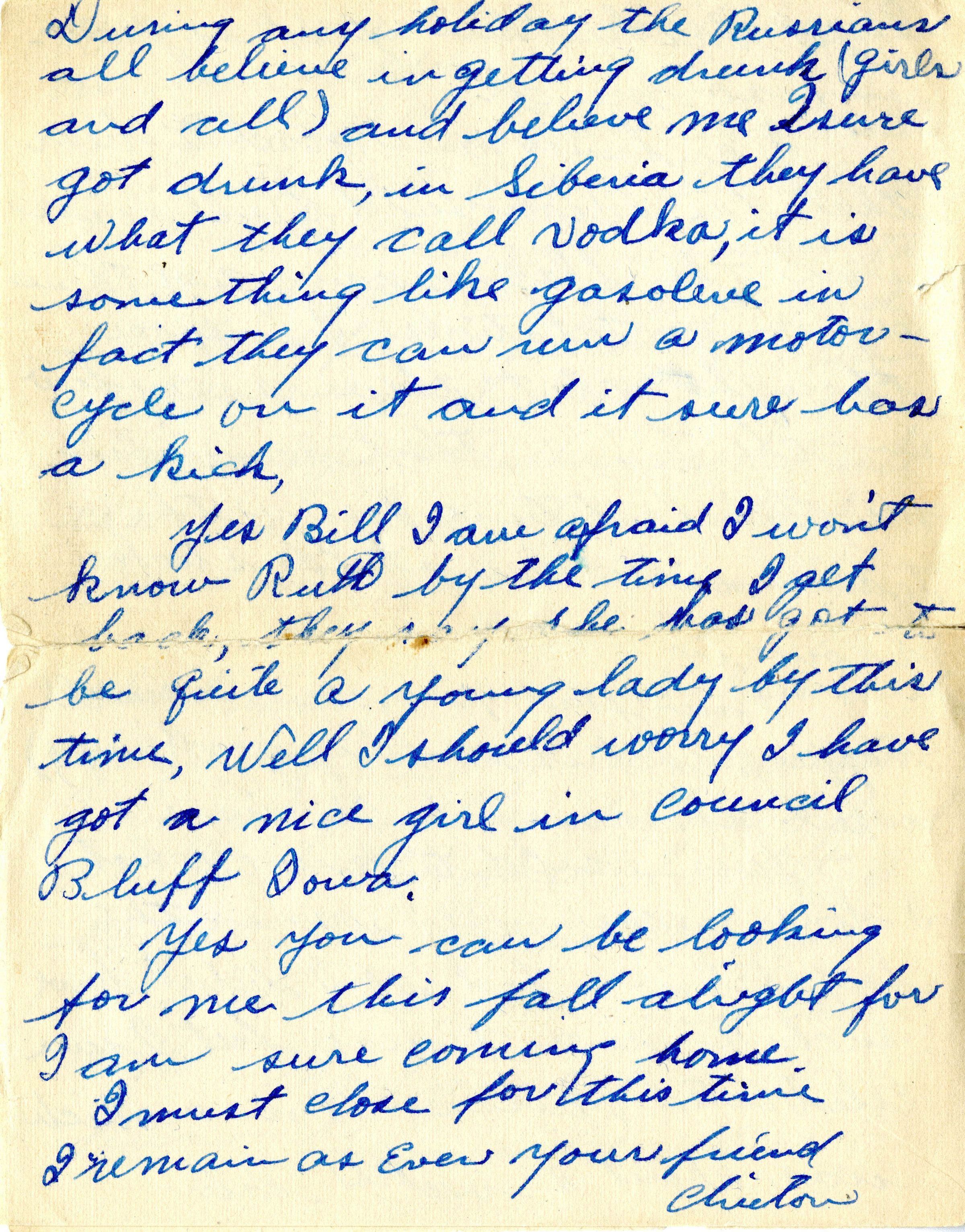 You wanted to know what I done xmas, but I sure celebrated Russian xmas which was about 2 weeks later. During any holiday the Russians all believe in getting drunk (girls and all) and believe me I sure got drunk. In Siberia they have what they call vodka, it is something like gasoline. In fact they can run a motorcycle on it and it sure has a kick.