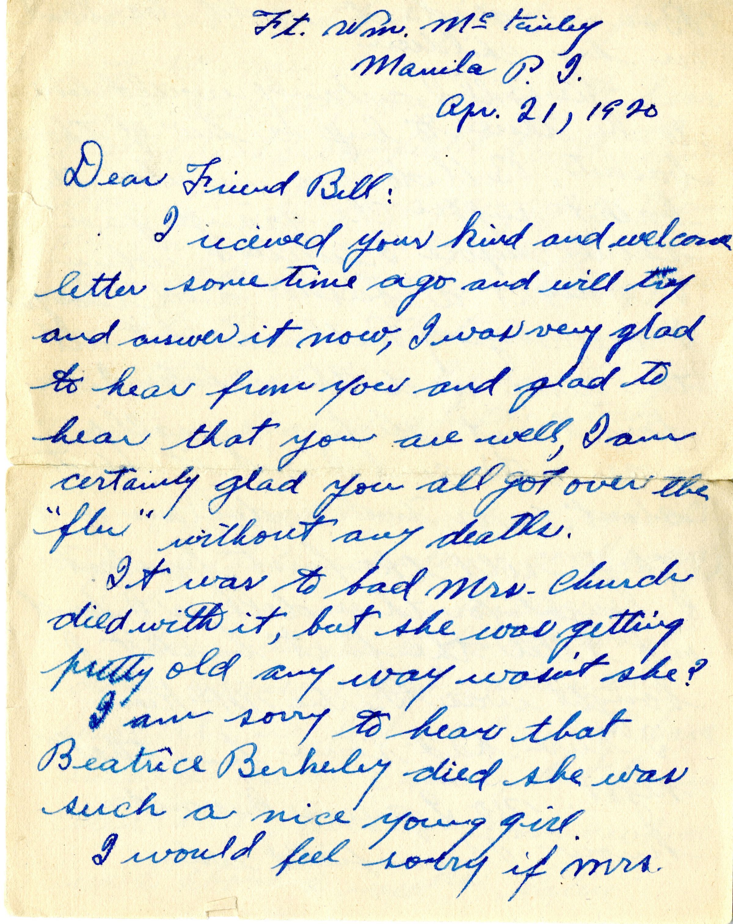 Letter to William Crooks from a friend stationed in Manila, dated April 21, 1920.