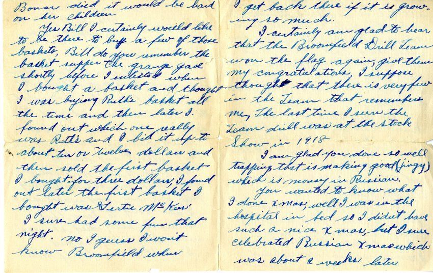 Yes Bill I certainly would like to be there to buy a few of those baskets, Bill do you remember the basket supper the grange gave shortly before I enlisted when I bought a basket and thought I was buying Ruth's basket all the time and then later I found out which one really was Ruth's and I bid it up to about ten or twelve dollars and then sold the first basket I bought for three dollars, I found out later the first basket I bought was Gertie McKees'. I sure had fun that night. No I guess I don't know Broomfield when I get back there if it is growing so much.