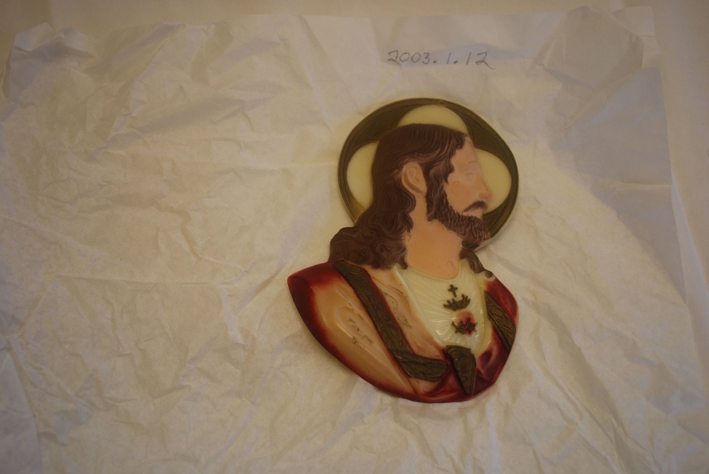 This plastic plaque is a Jesus icon showing his head and shoulders. It measuers 0.75" (h) x 4" (w) x 5.5" (l).